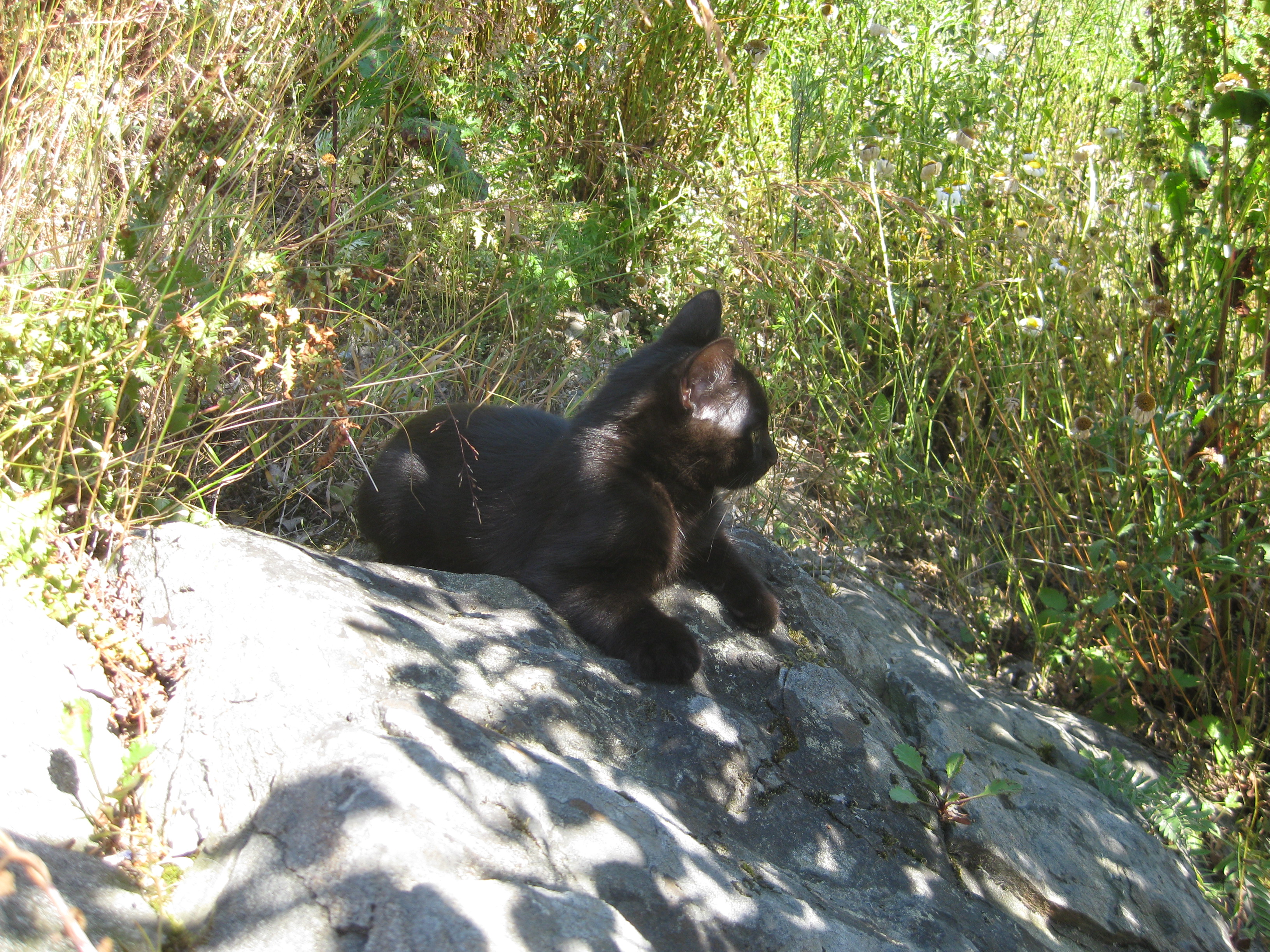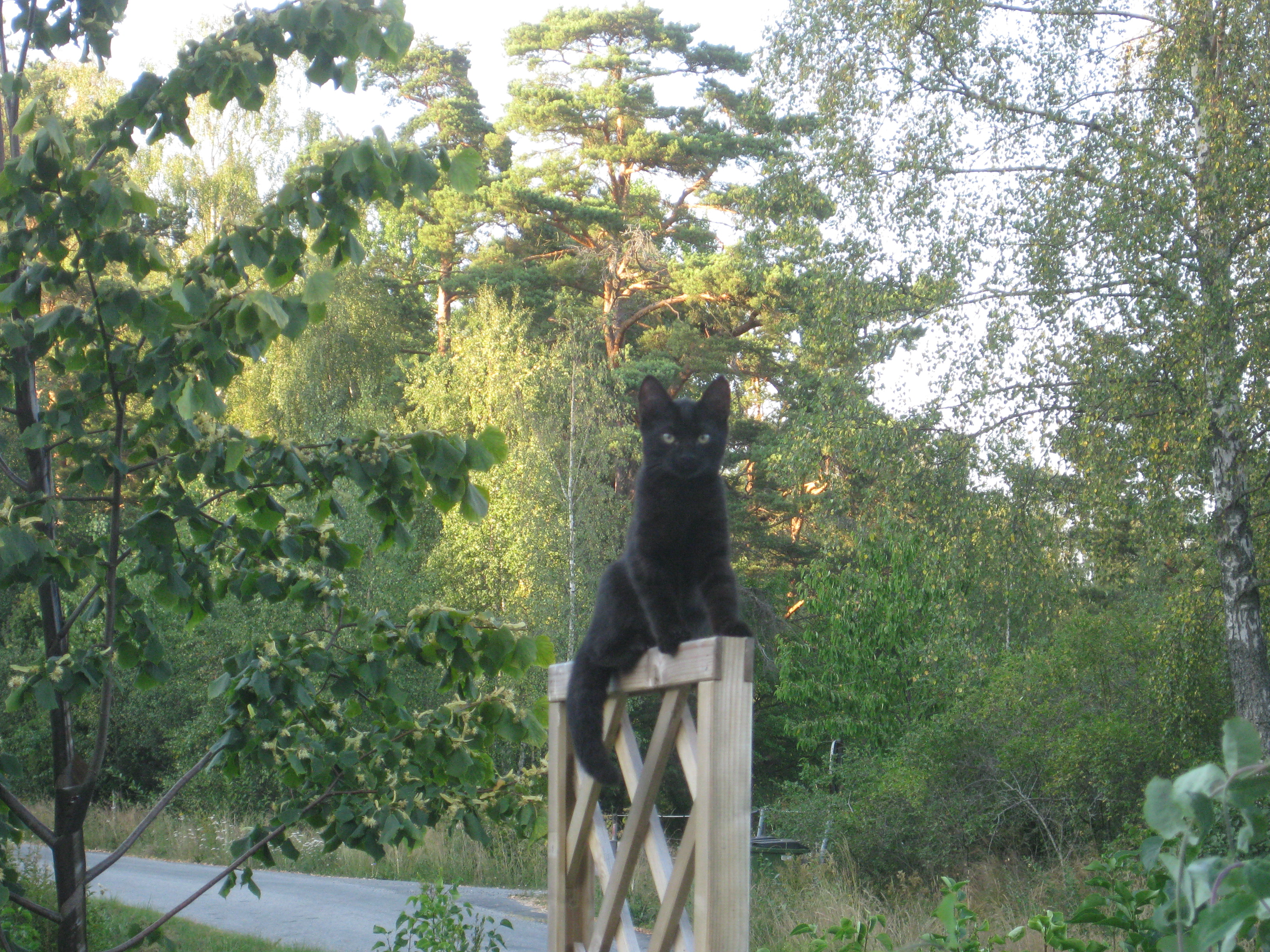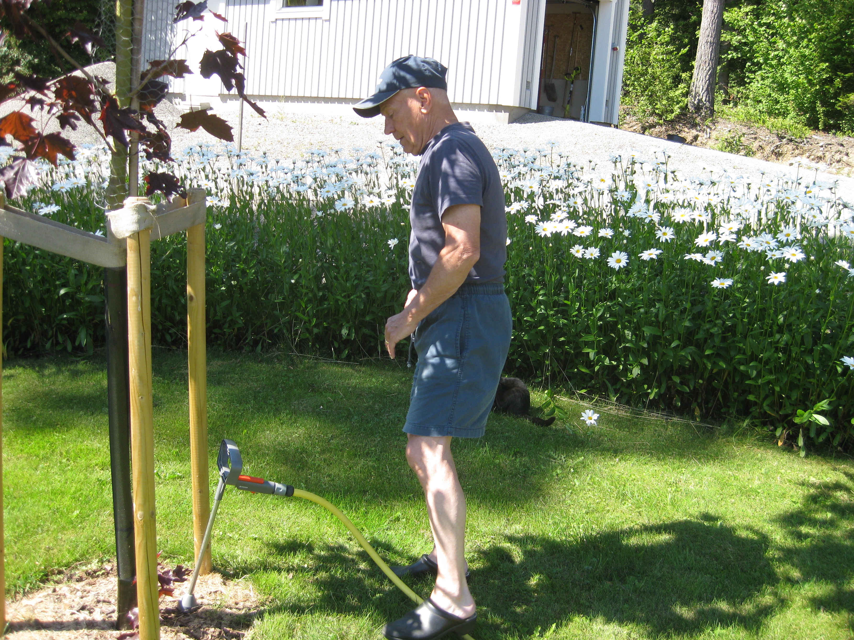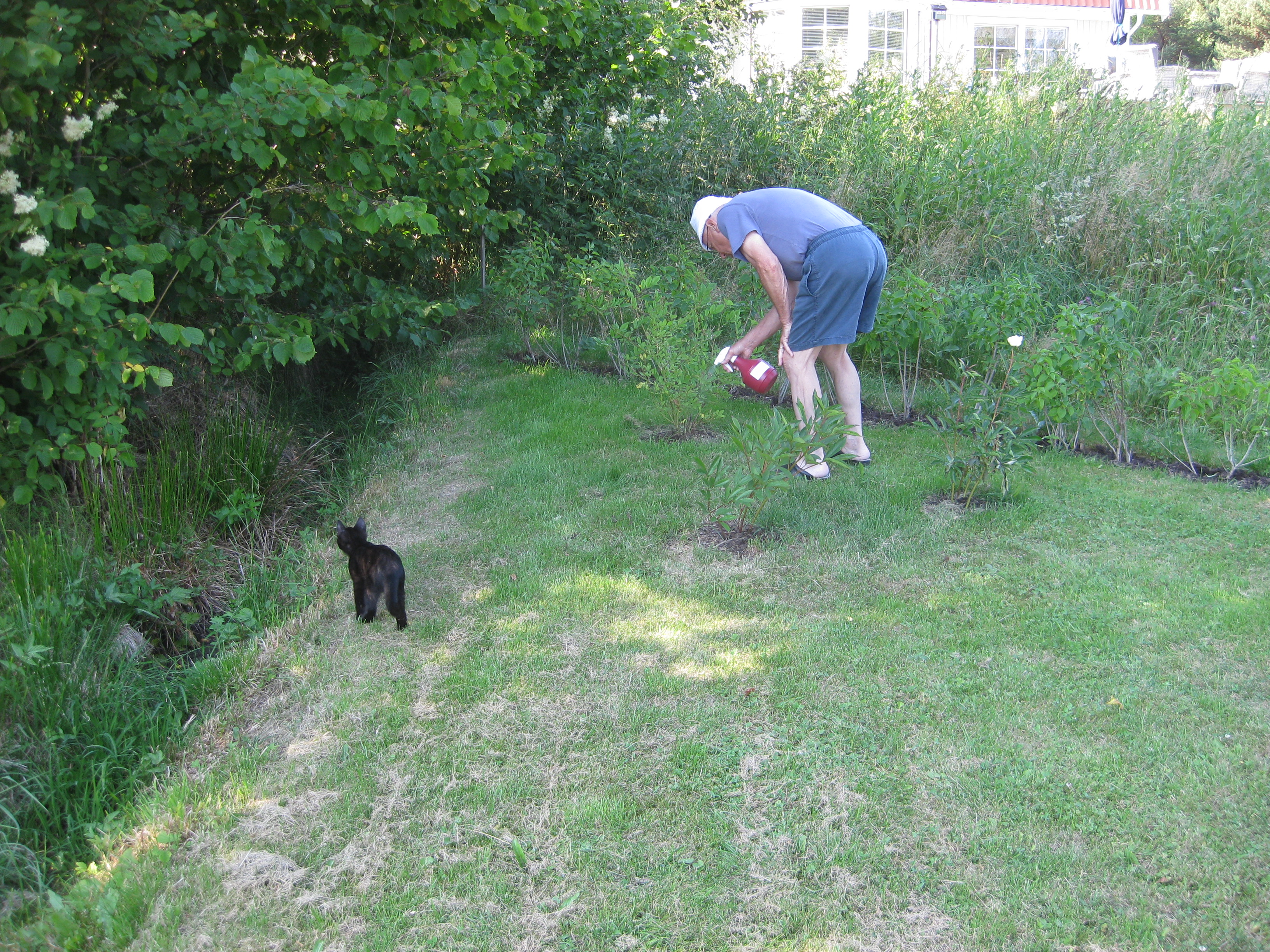 Varierande uppgifter i trädgården: kela med kattunge, bära verktyg, klättra i träd, göra färdigt stenkant, beundra prästkragar, städa berget, fotografera, mala vass, kela mera med kattunge… Moses far runt som Jehu i trädgården. Full fart upp i ett högt träd, och full fart ner – han borde ha slagit ihjäl sig, men katter verkar alltid landa på fötterna. Emellertid blir matte lite skärrad av detta upptåg, och bestämmer att kissen får vara inne på eftermiddagen.