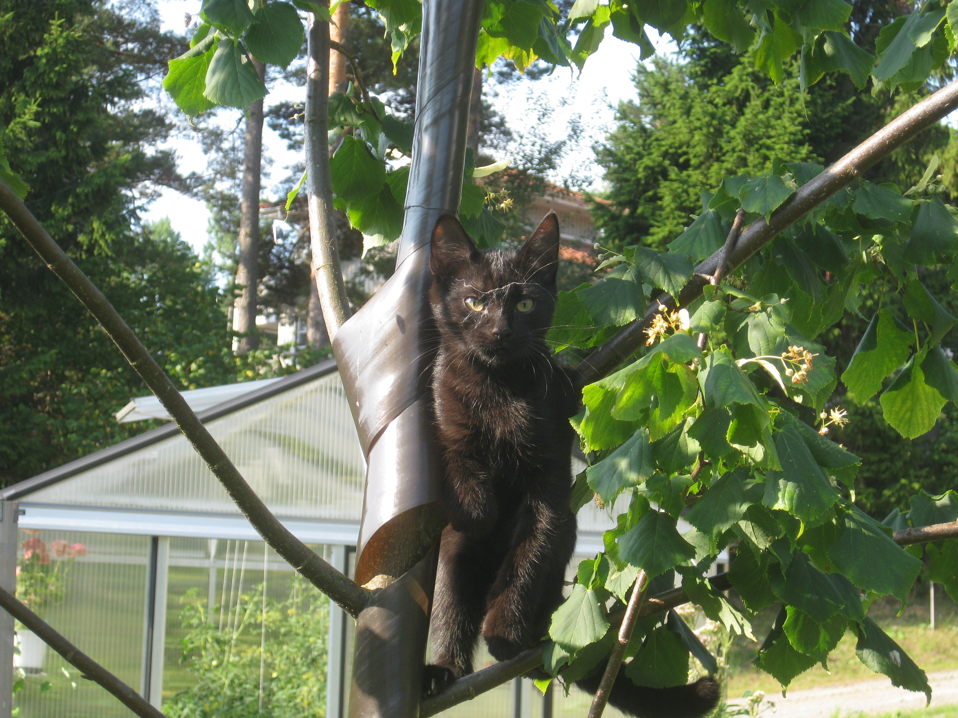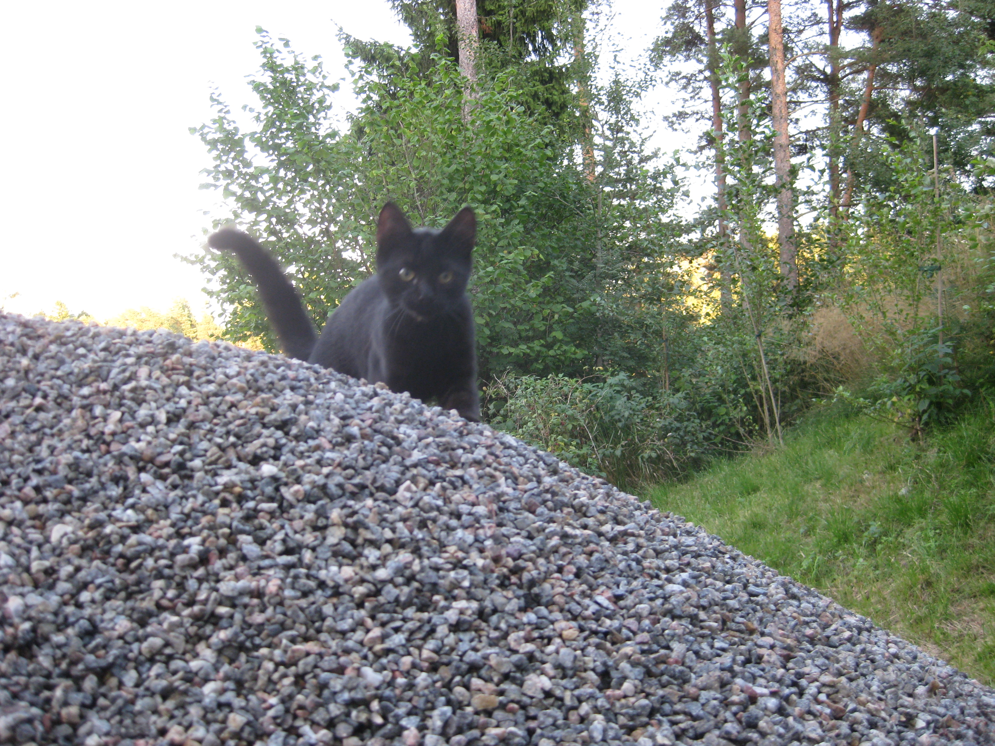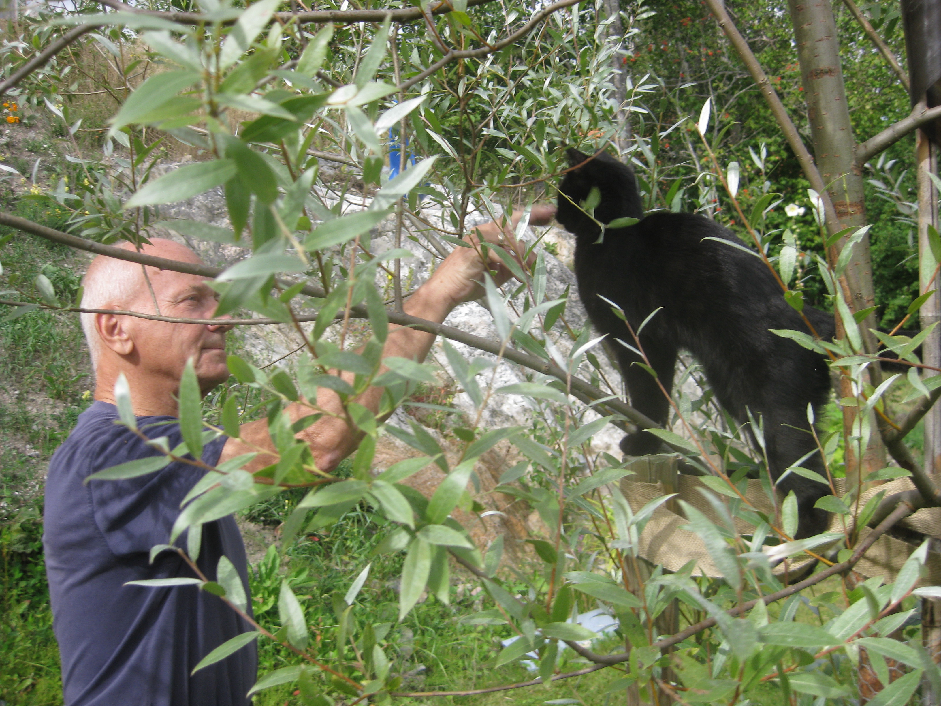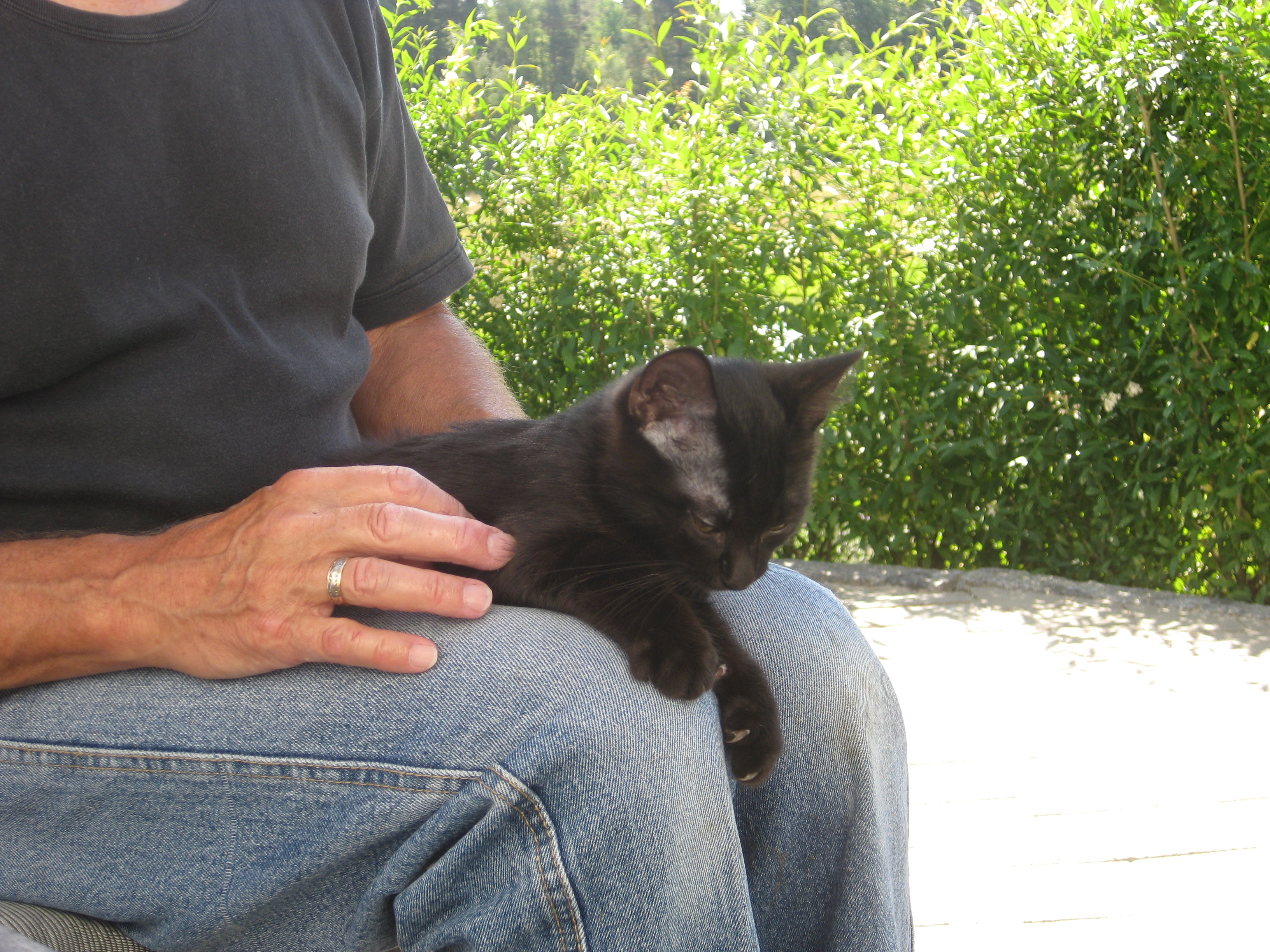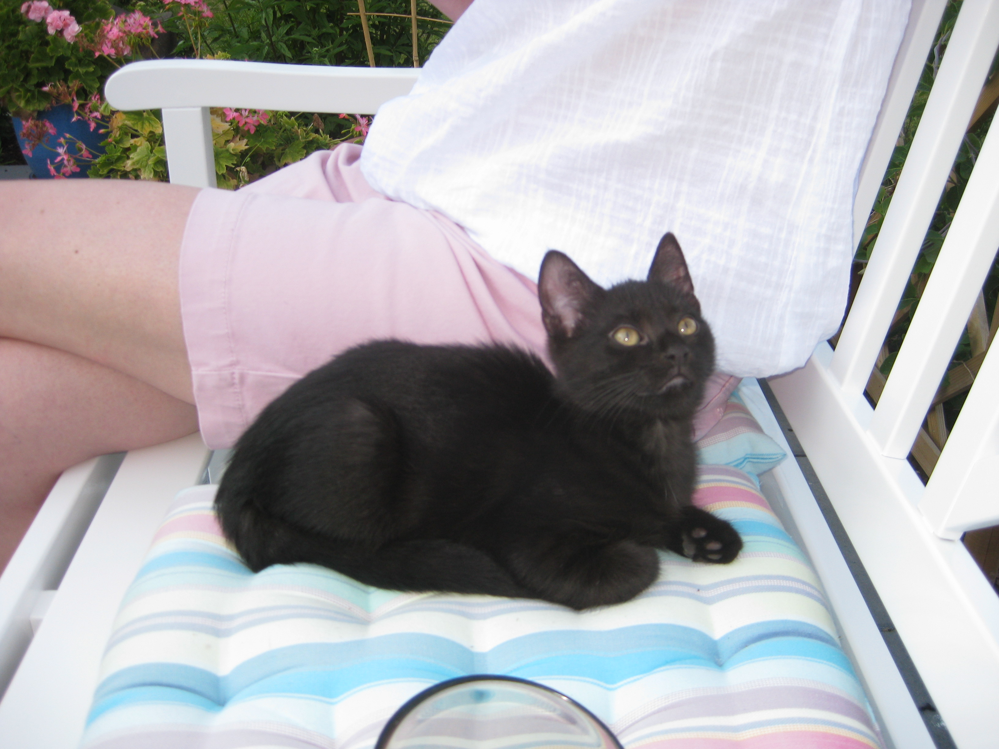 Varierande uppgifter i trädgården: kela med kattunge, bära verktyg, klättra i träd, göra färdigt stenkant, beundra prästkragar, städa berget, fotografera, mala vass, kela mera med kattunge… Moses far runt som Jehu i trädgården. Full fart upp i ett högt träd, och full fart ner – han borde ha slagit ihjäl sig, men katter verkar alltid landa på fötterna. Emellertid blir matte lite skärrad av detta upptåg, och bestämmer att kissen får vara inne på eftermiddagen.