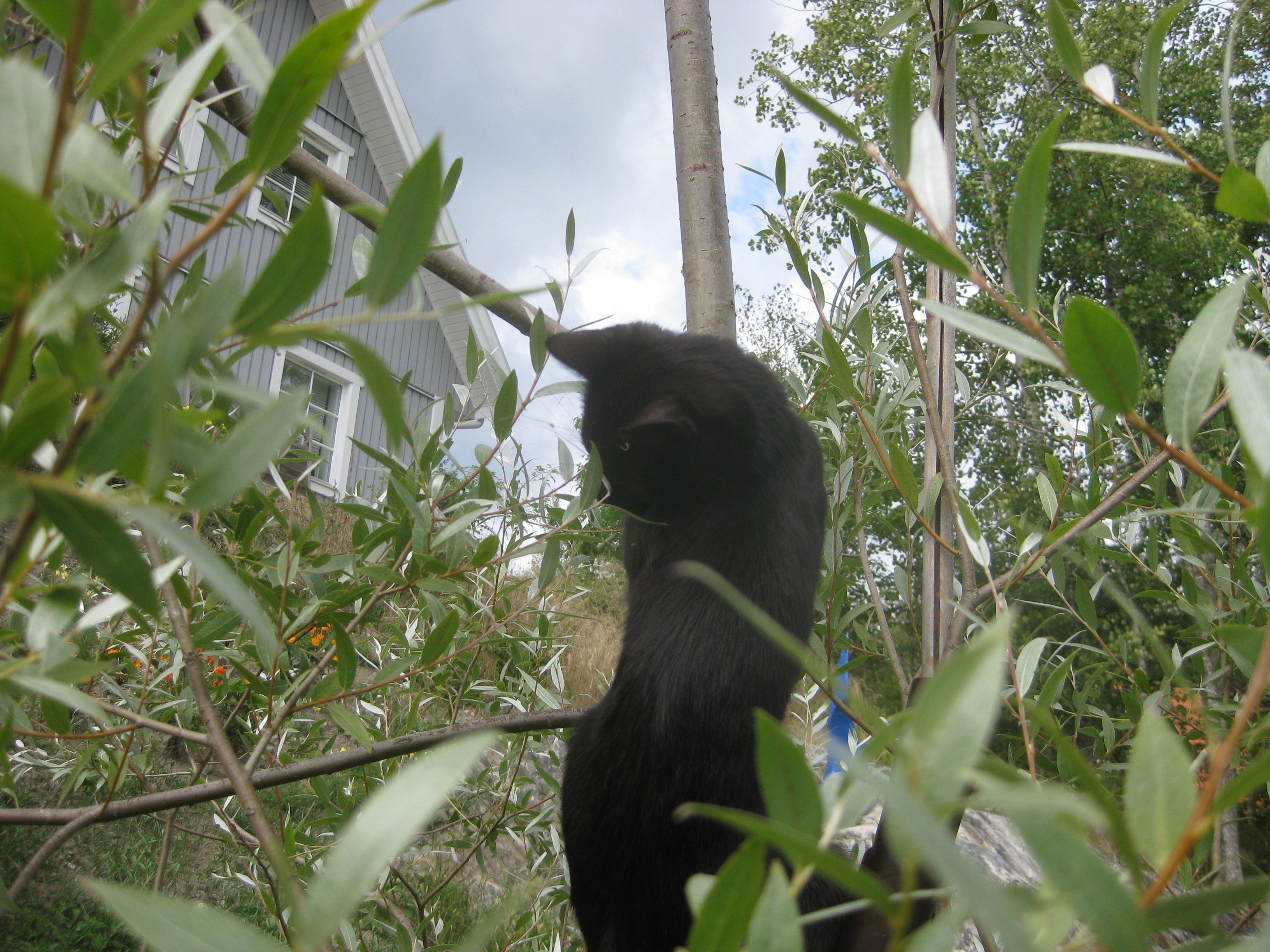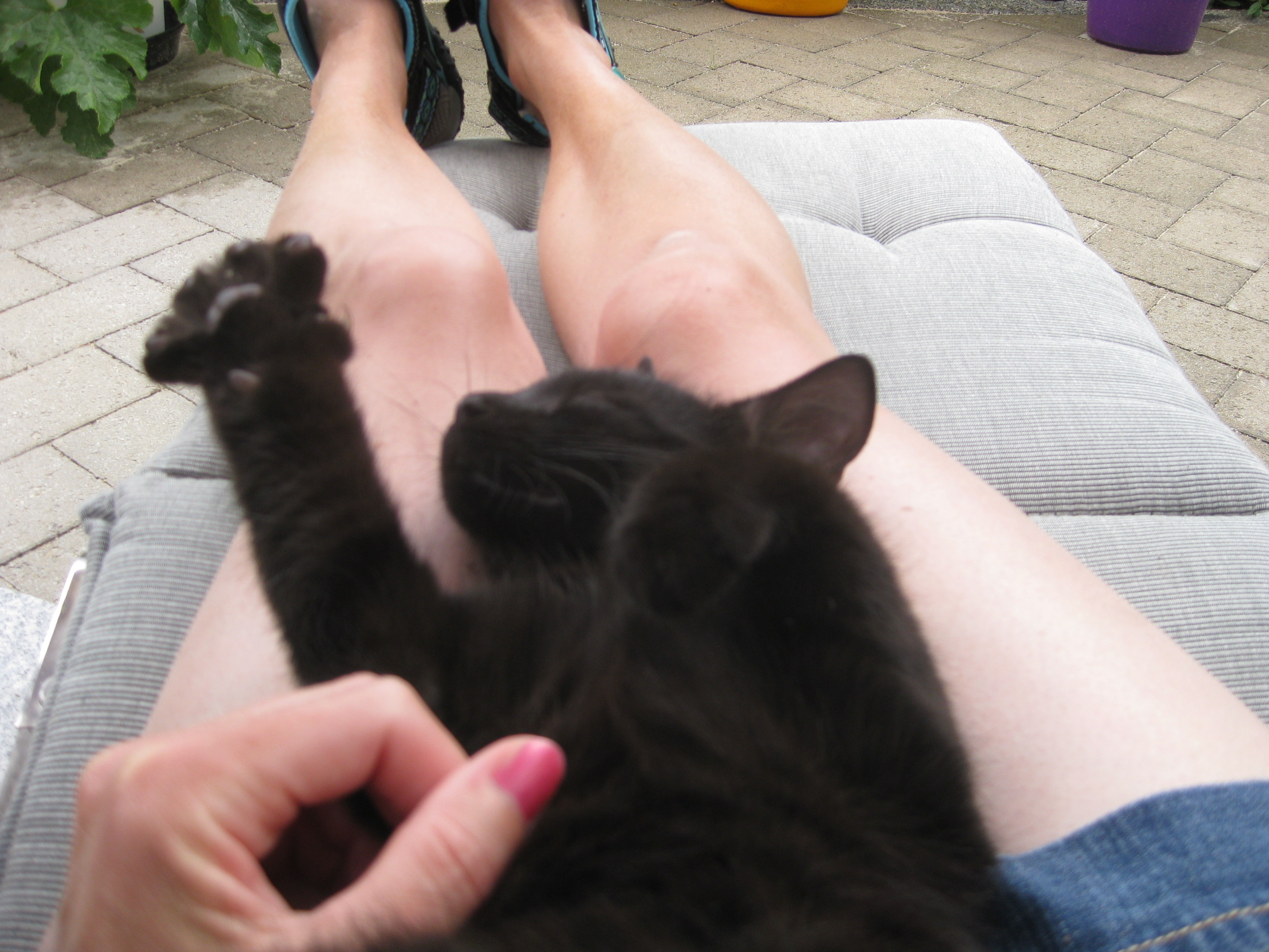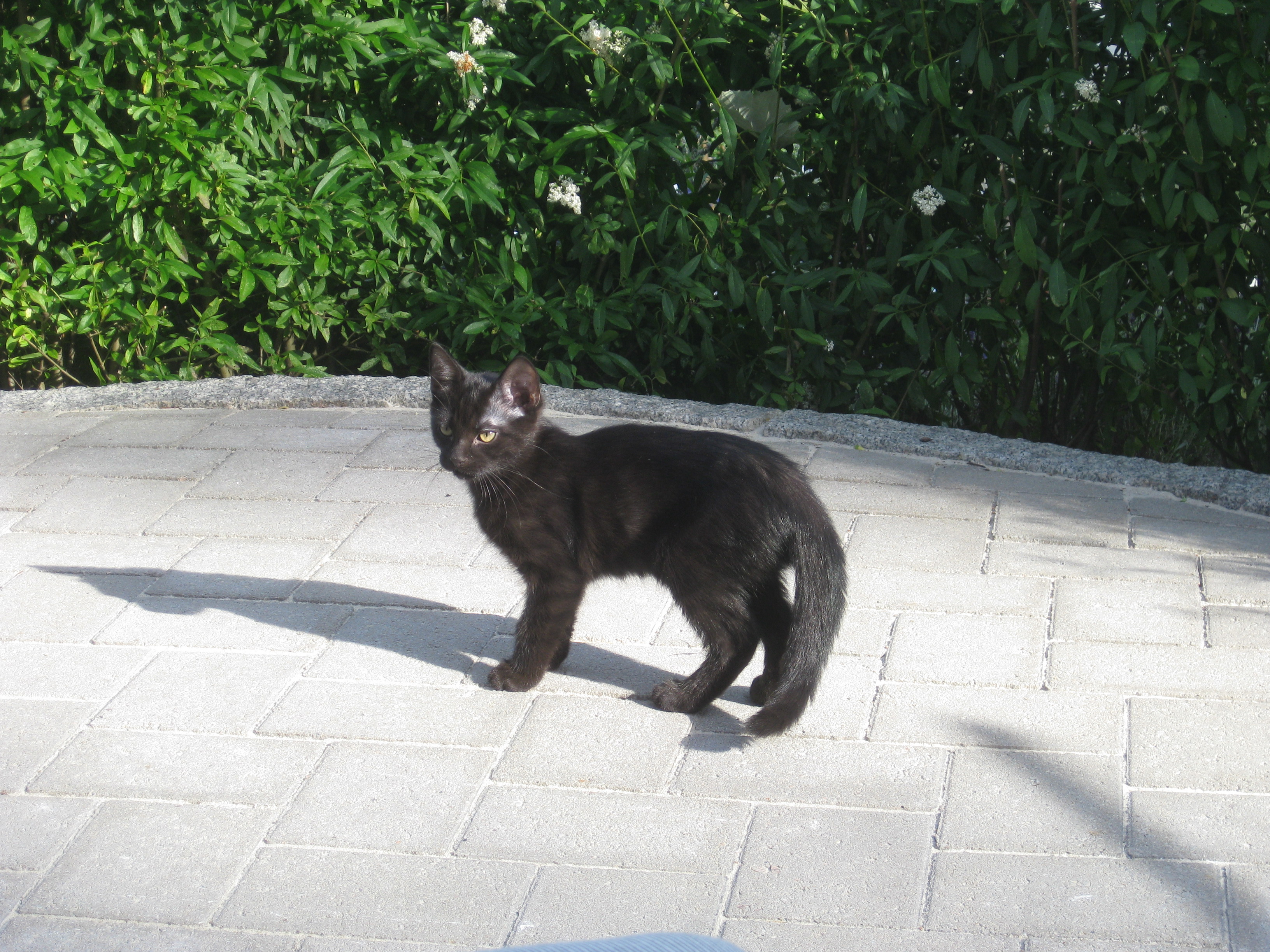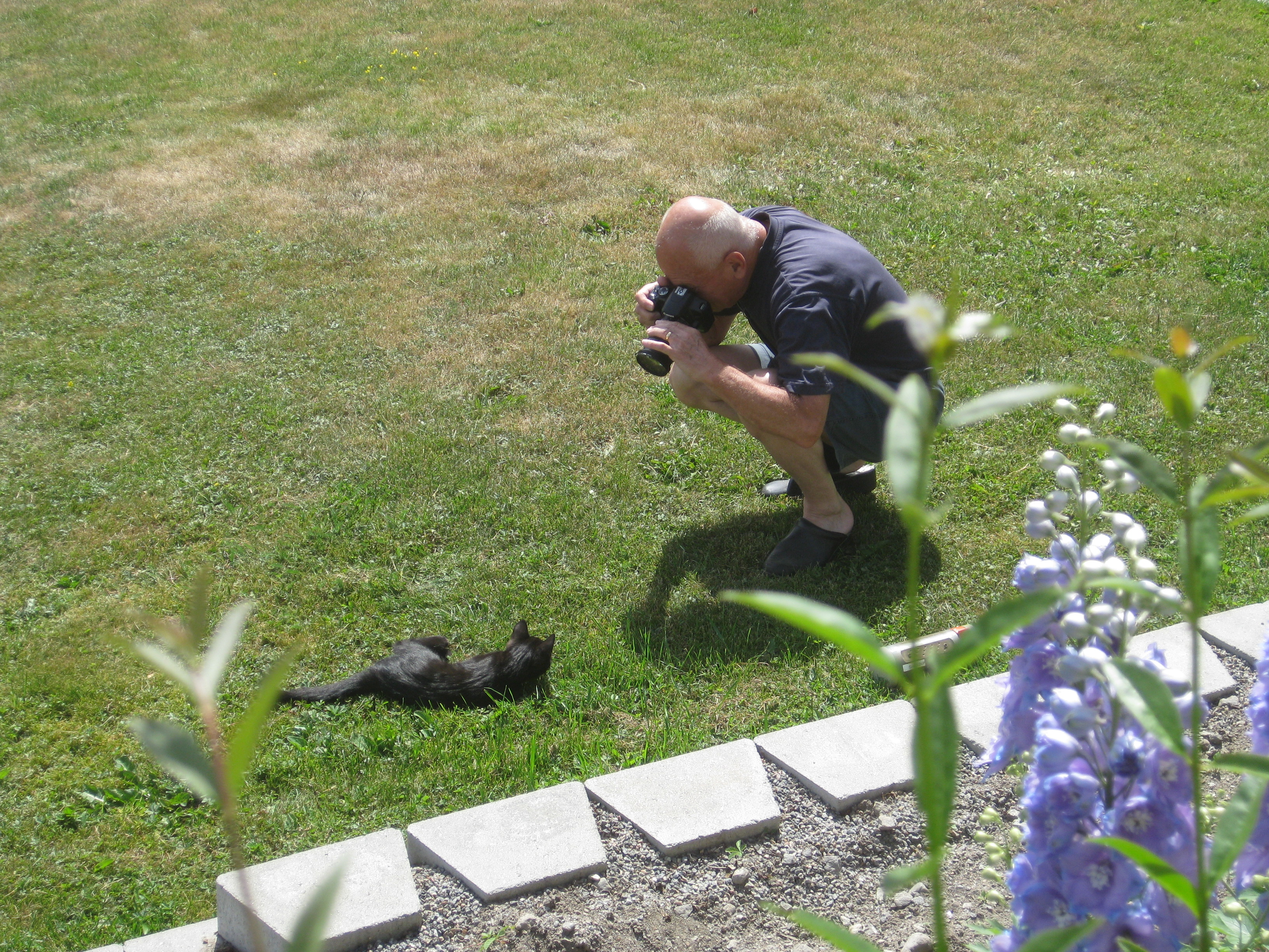 Varierande uppgifter i trädgården: kela med kattunge, bära verktyg, klättra i träd, göra färdigt stenkant, beundra prästkragar, städa berget, fotografera, mala vass, kela mera med kattunge… Moses far runt som Jehu i trädgården. Full fart upp i ett högt träd, och full fart ner – han borde ha slagit ihjäl sig, men katter verkar alltid landa på fötterna. Emellertid blir matte lite skärrad av detta upptåg, och bestämmer att kissen får vara inne på eftermiddagen.