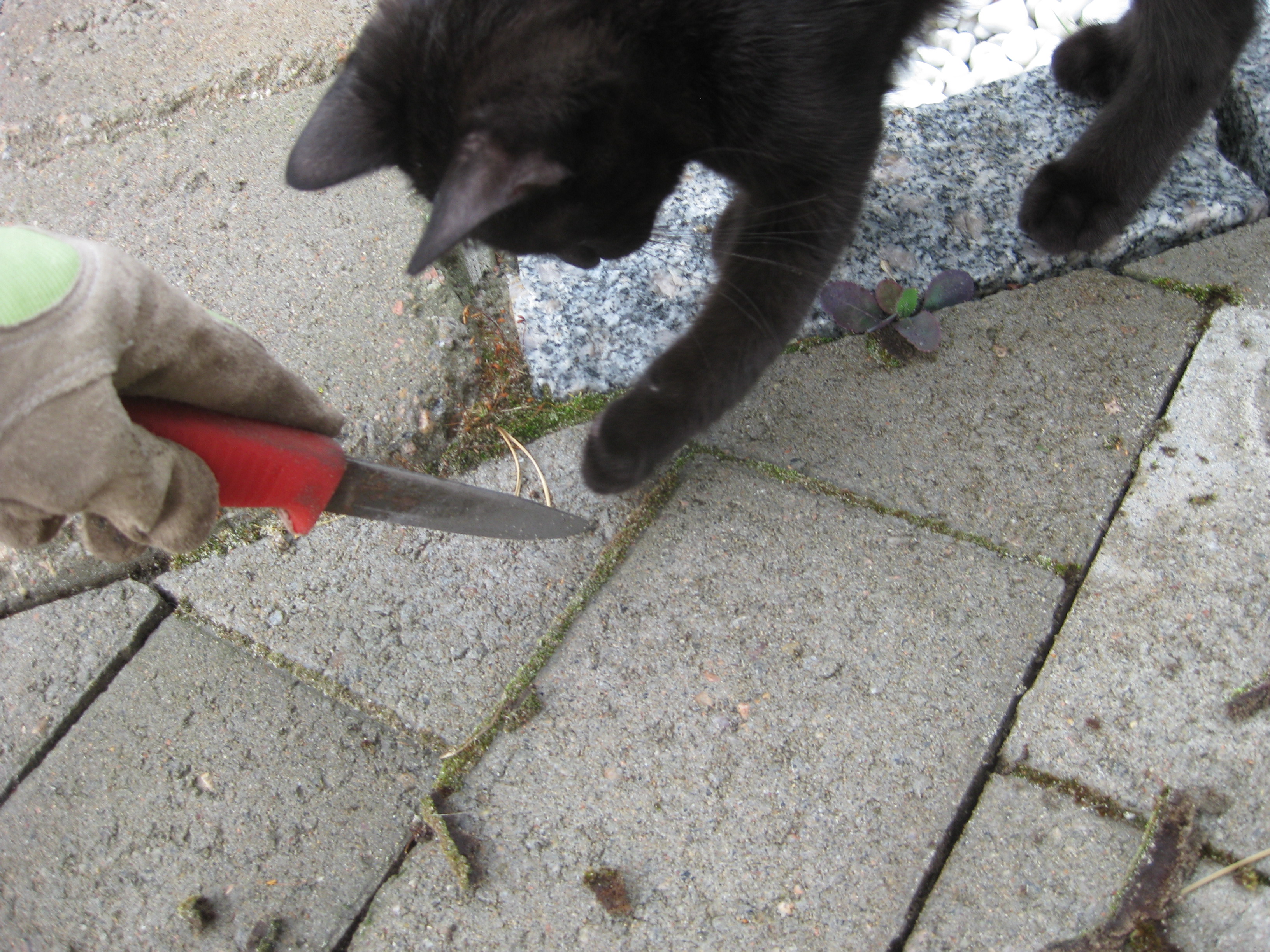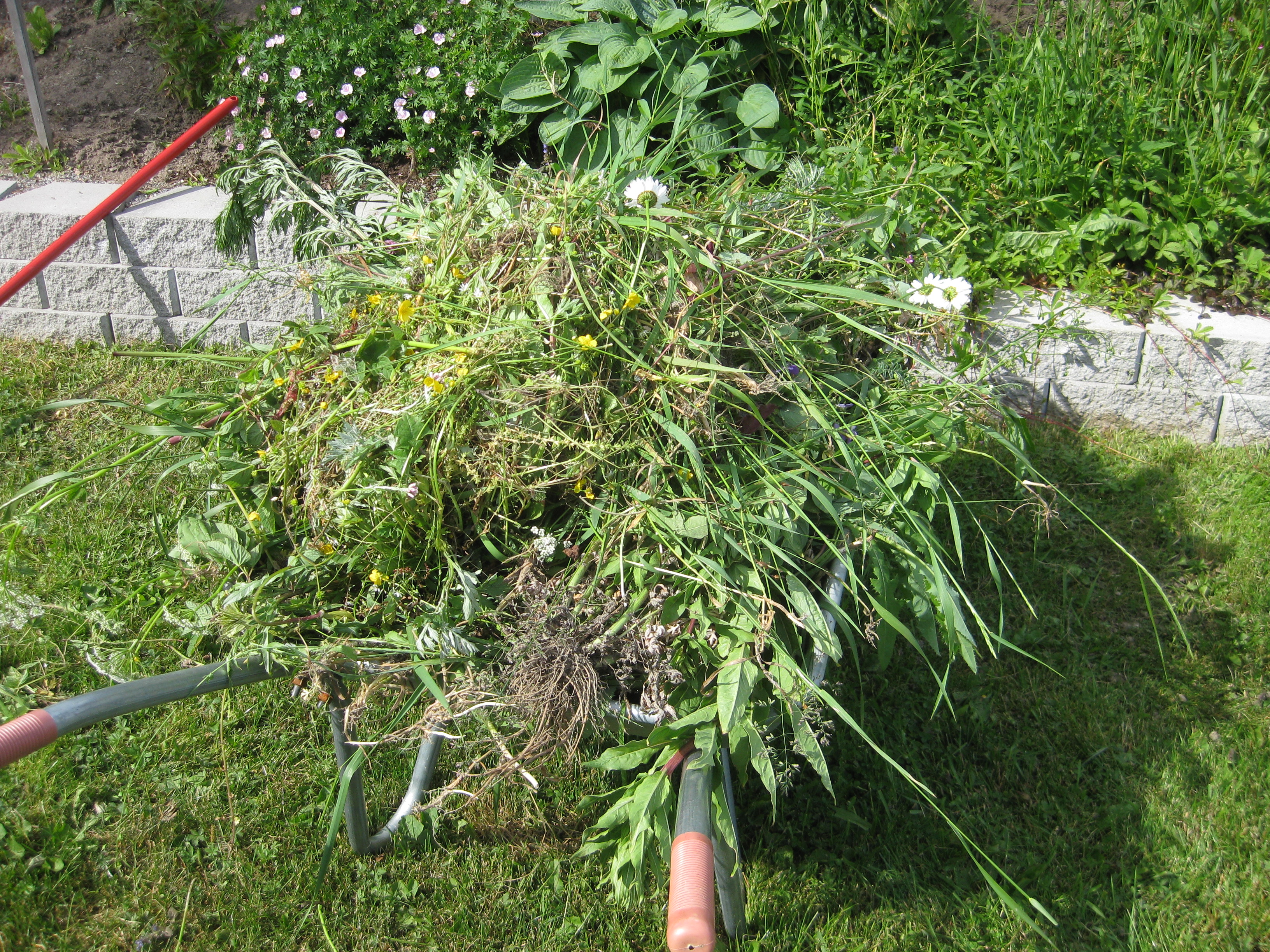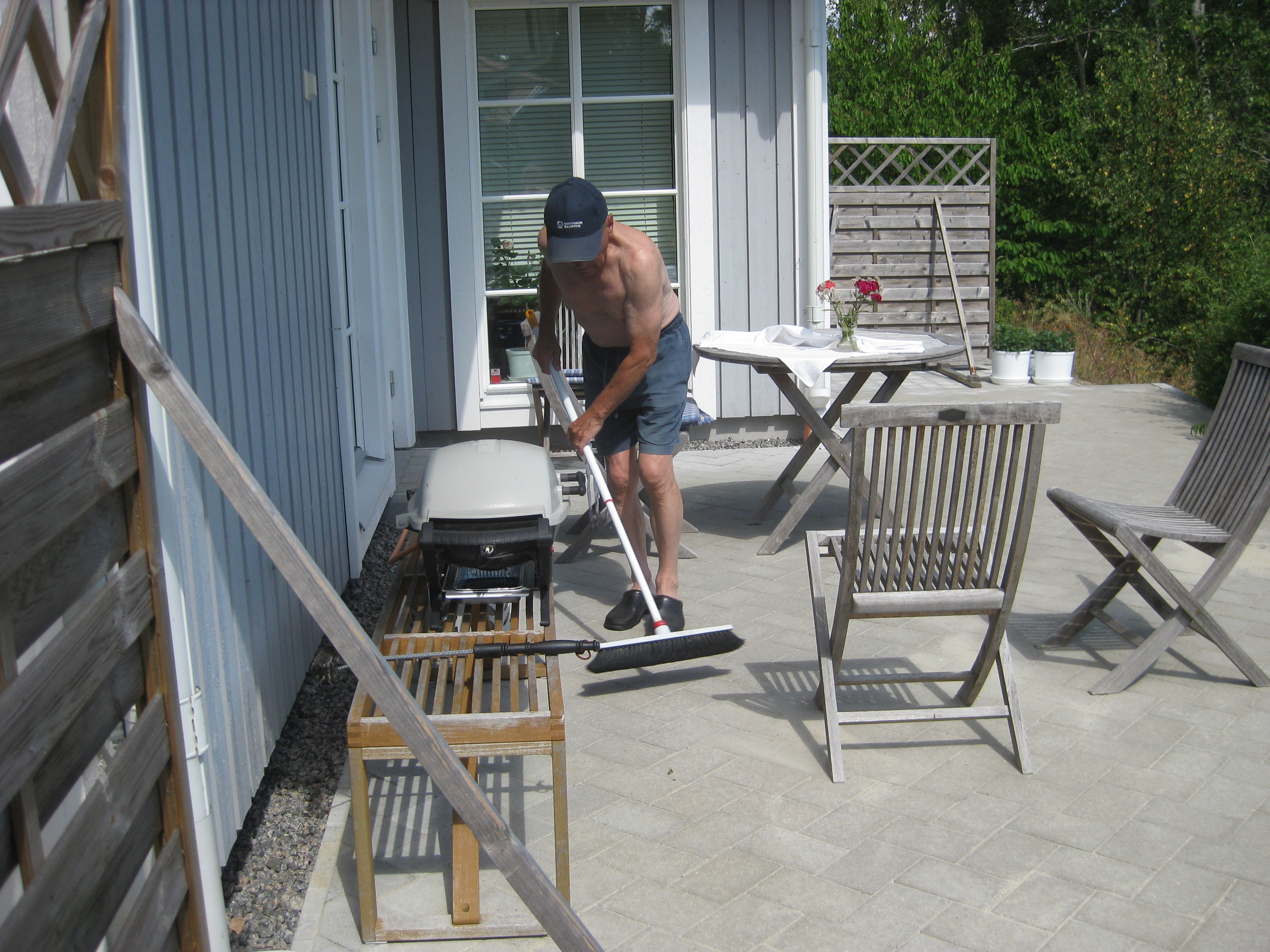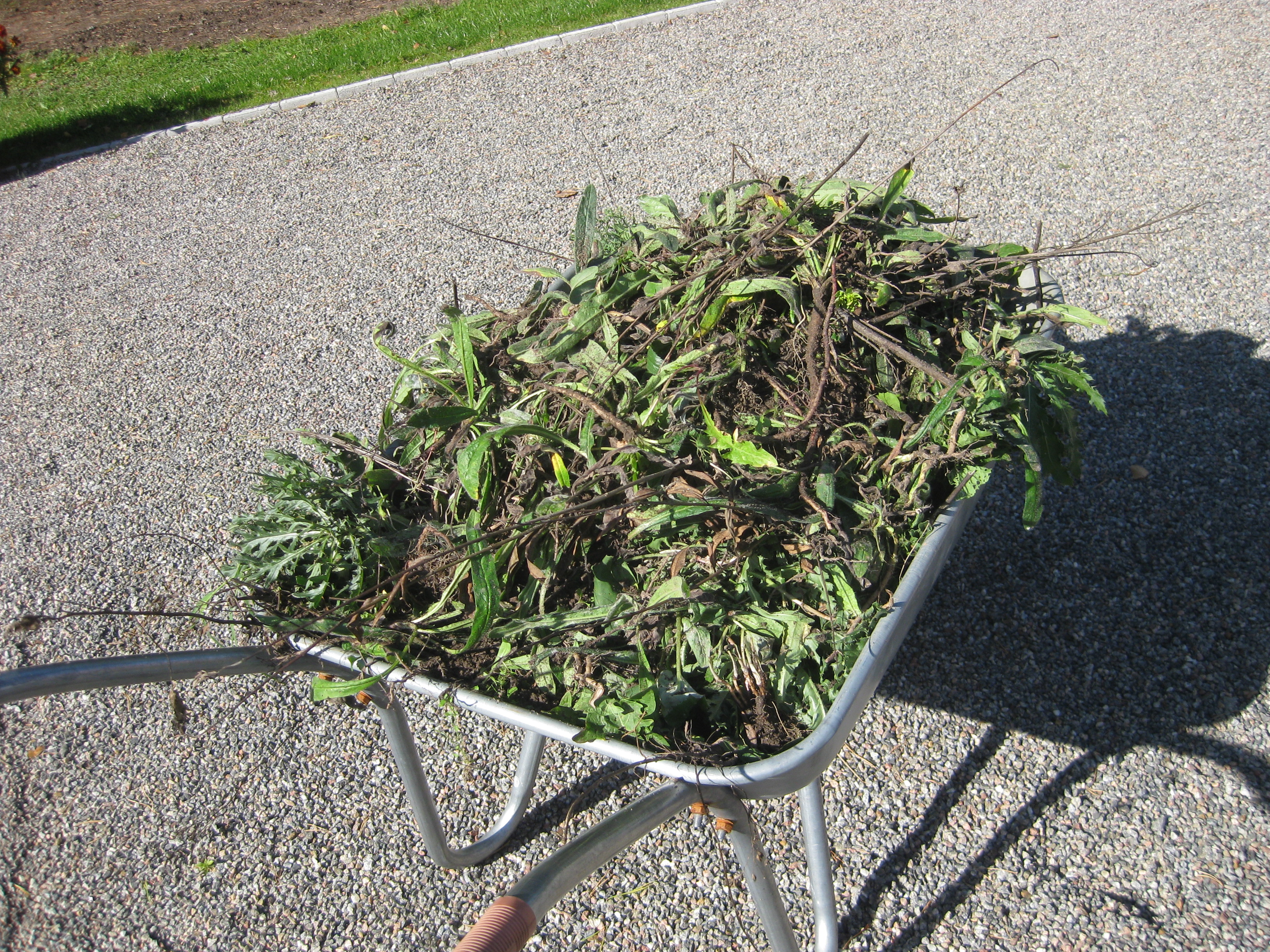 Jamen – ETT omöjligt projekt är i varje fall avklarat nu – rensa mellan stenplattorna! Herrn i huset håller på med något i verkstaden, och frun i huset klipper ner och städar bort gurkplantor ur växthuset. De har inte alls trivts i år, och det blev inte många gurkor. Alla våra rosor verkar dock trivas just nu.