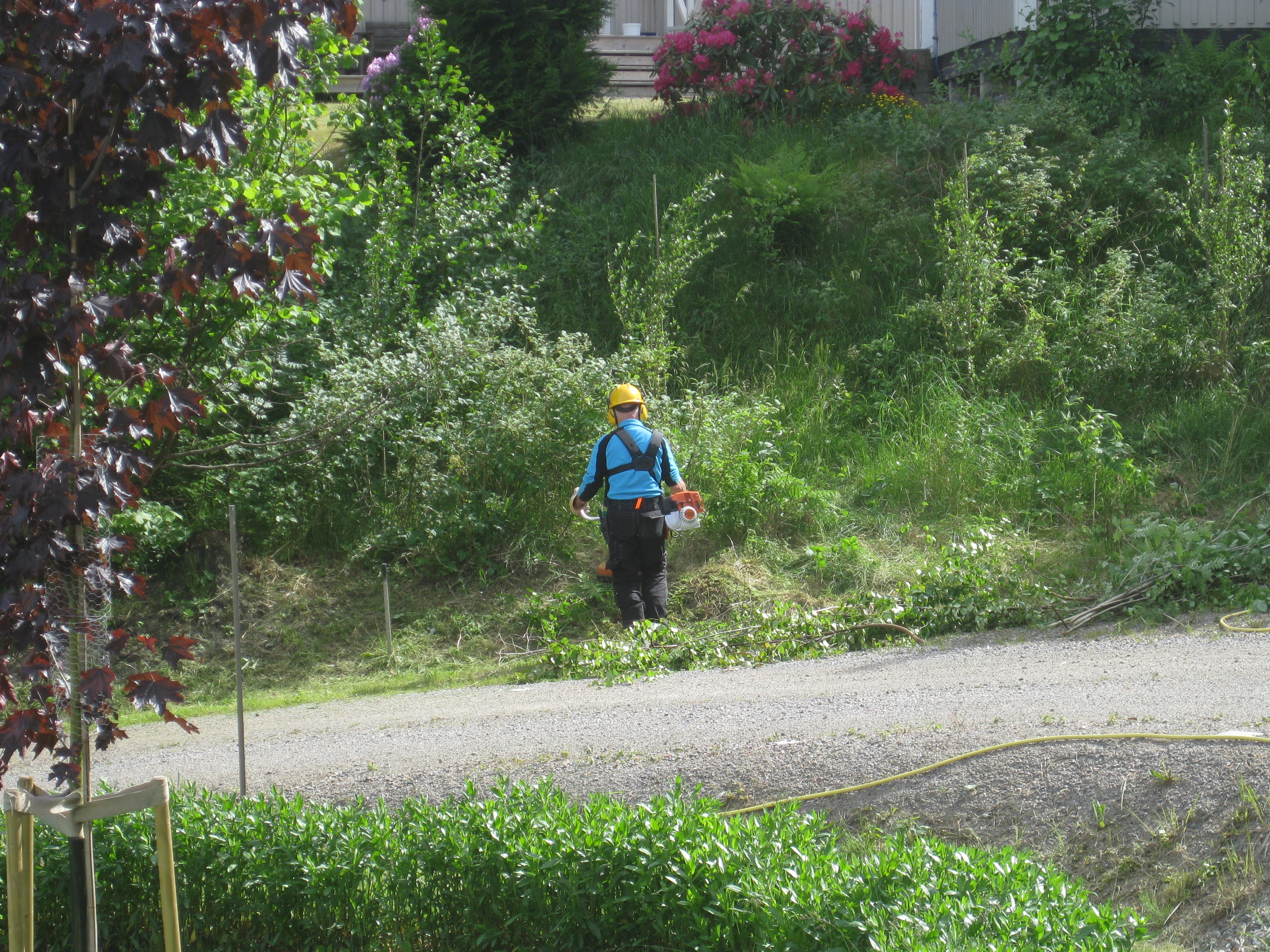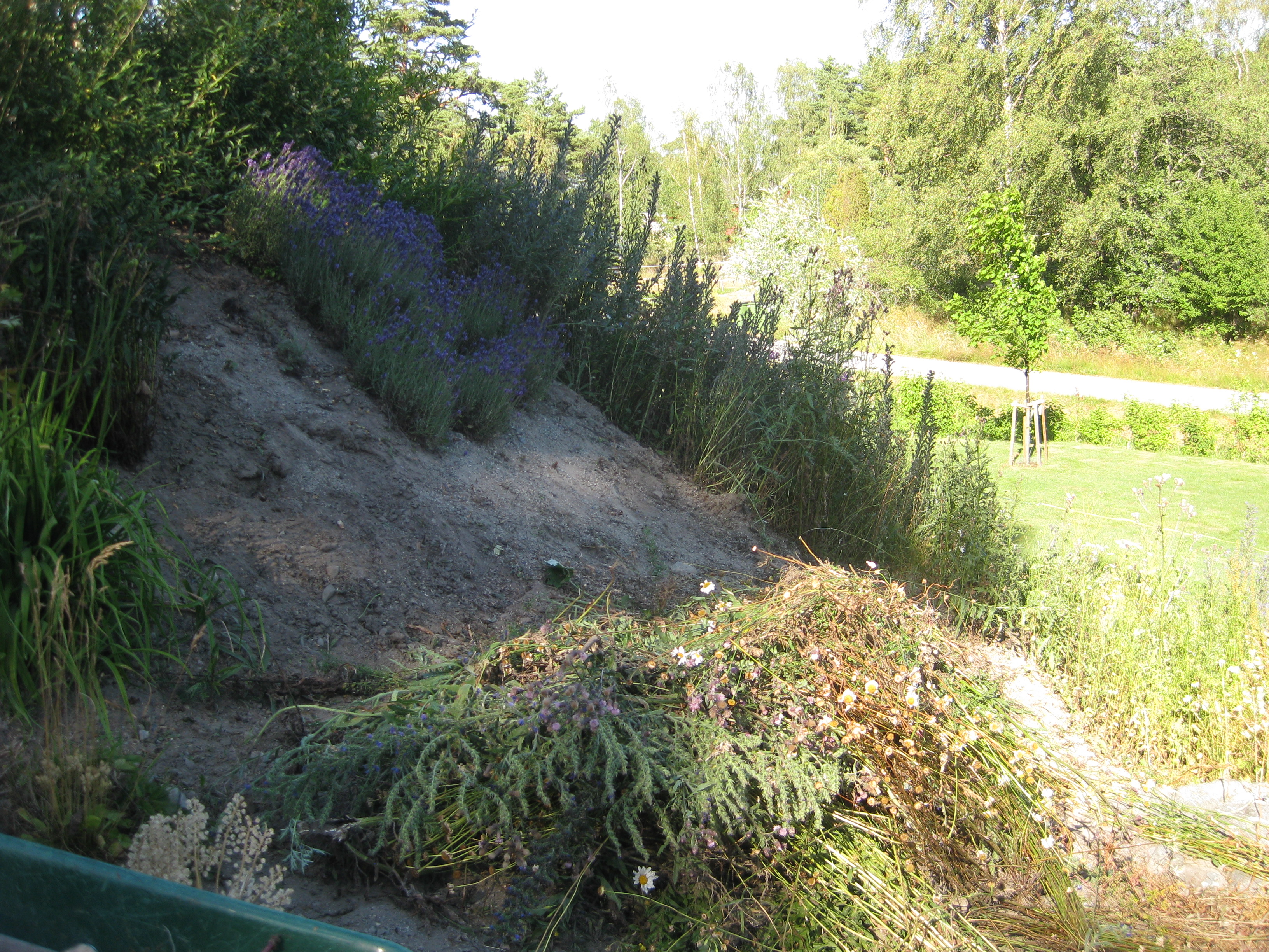 Rensning av perennrabatt! Håkan gör mera flis och Katarina rensar även fram vår lavendelodling som skymts av tistlar och annat. 🙂