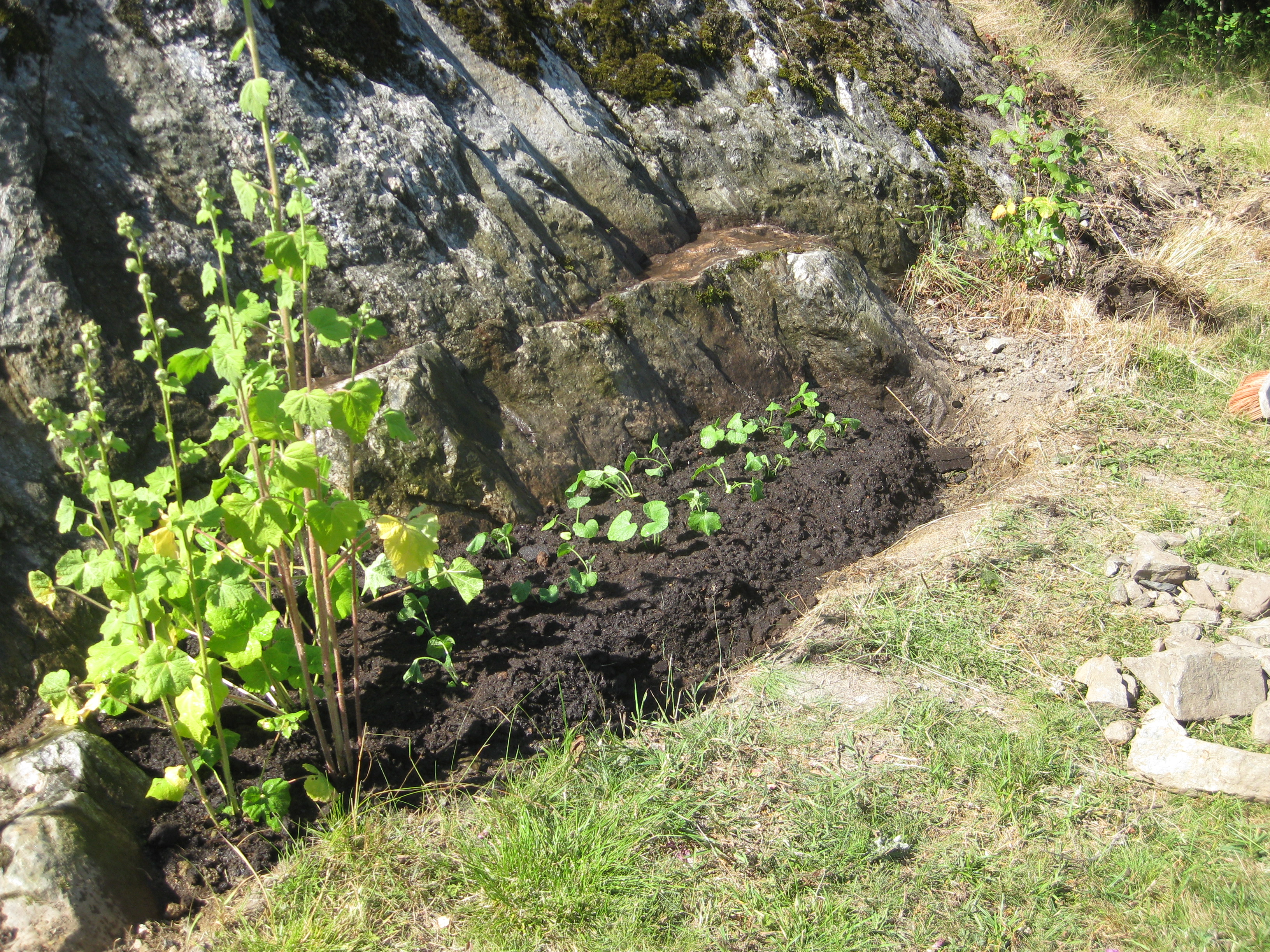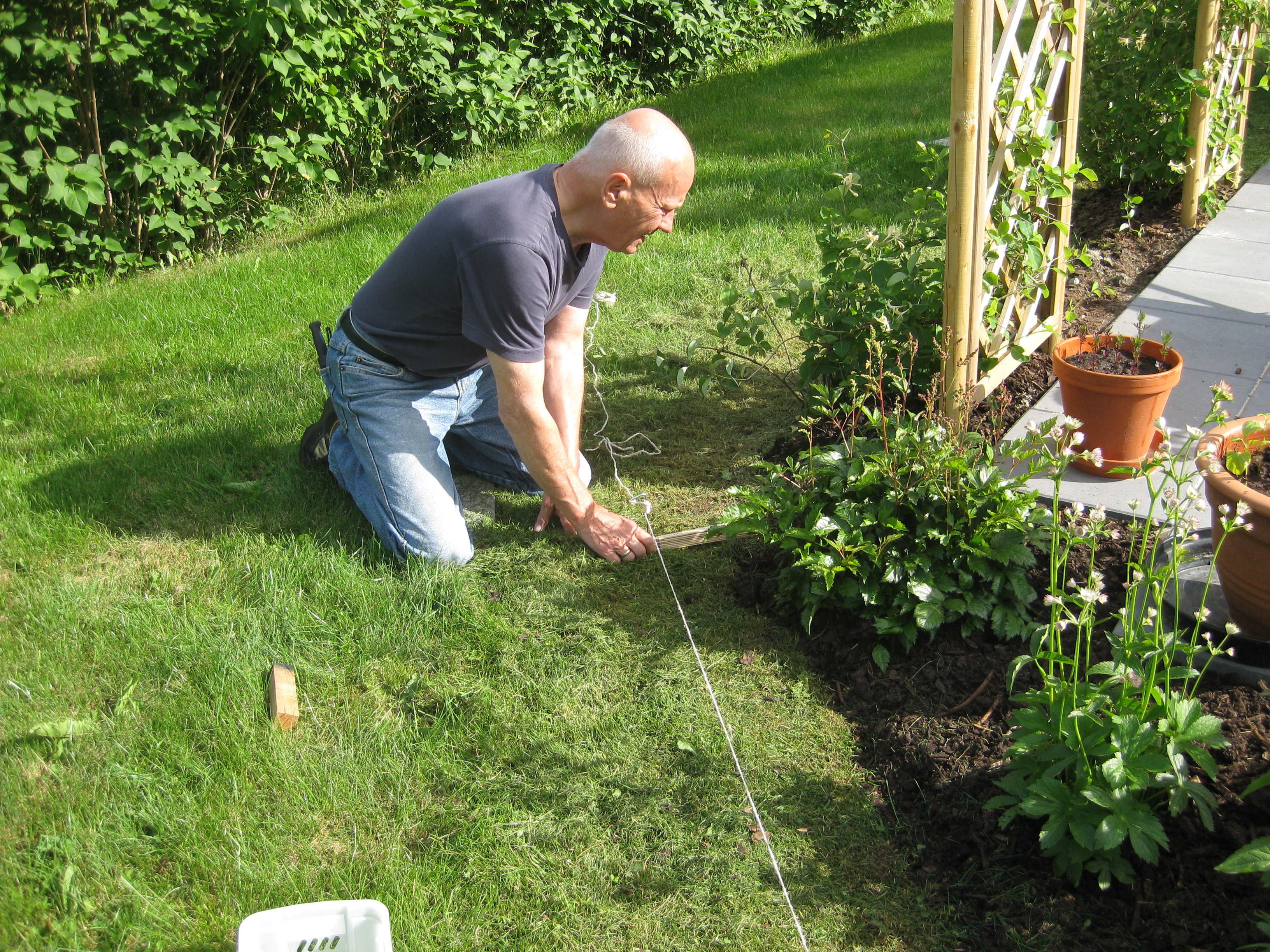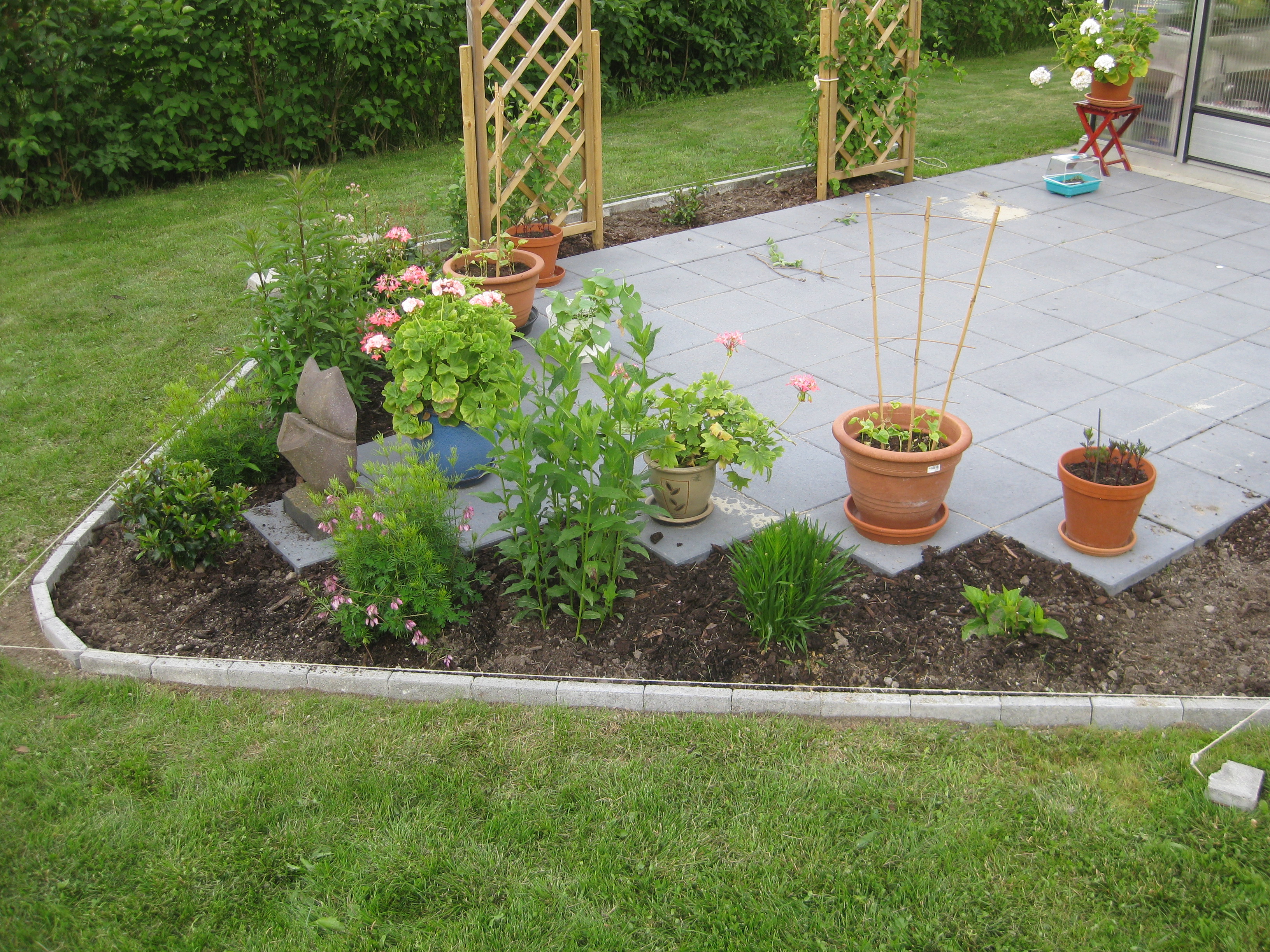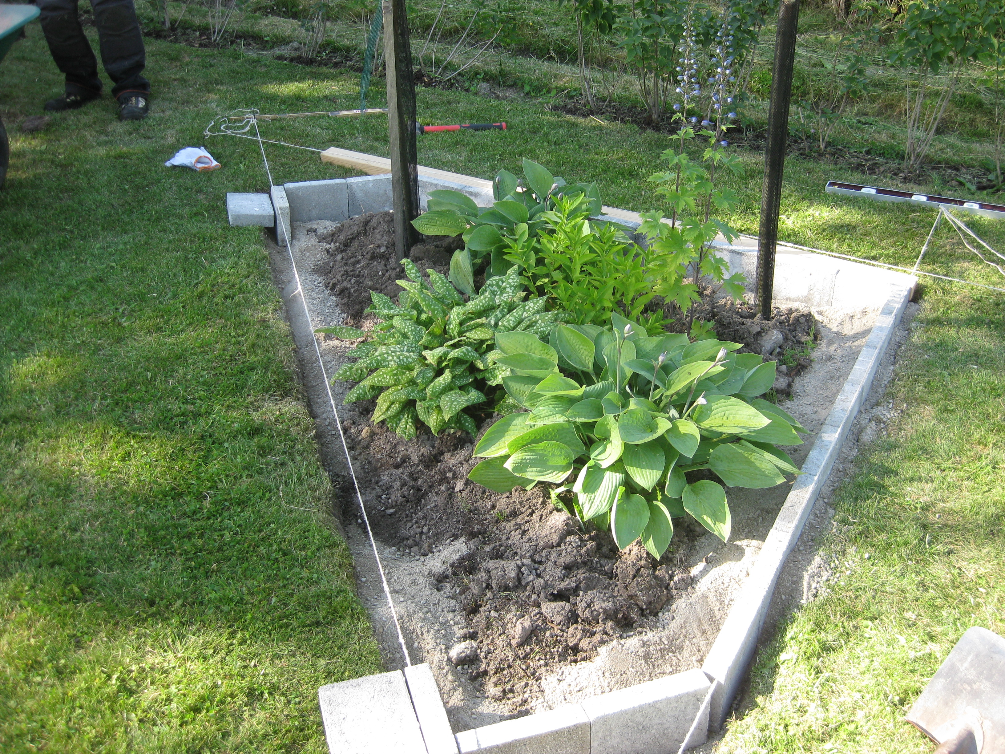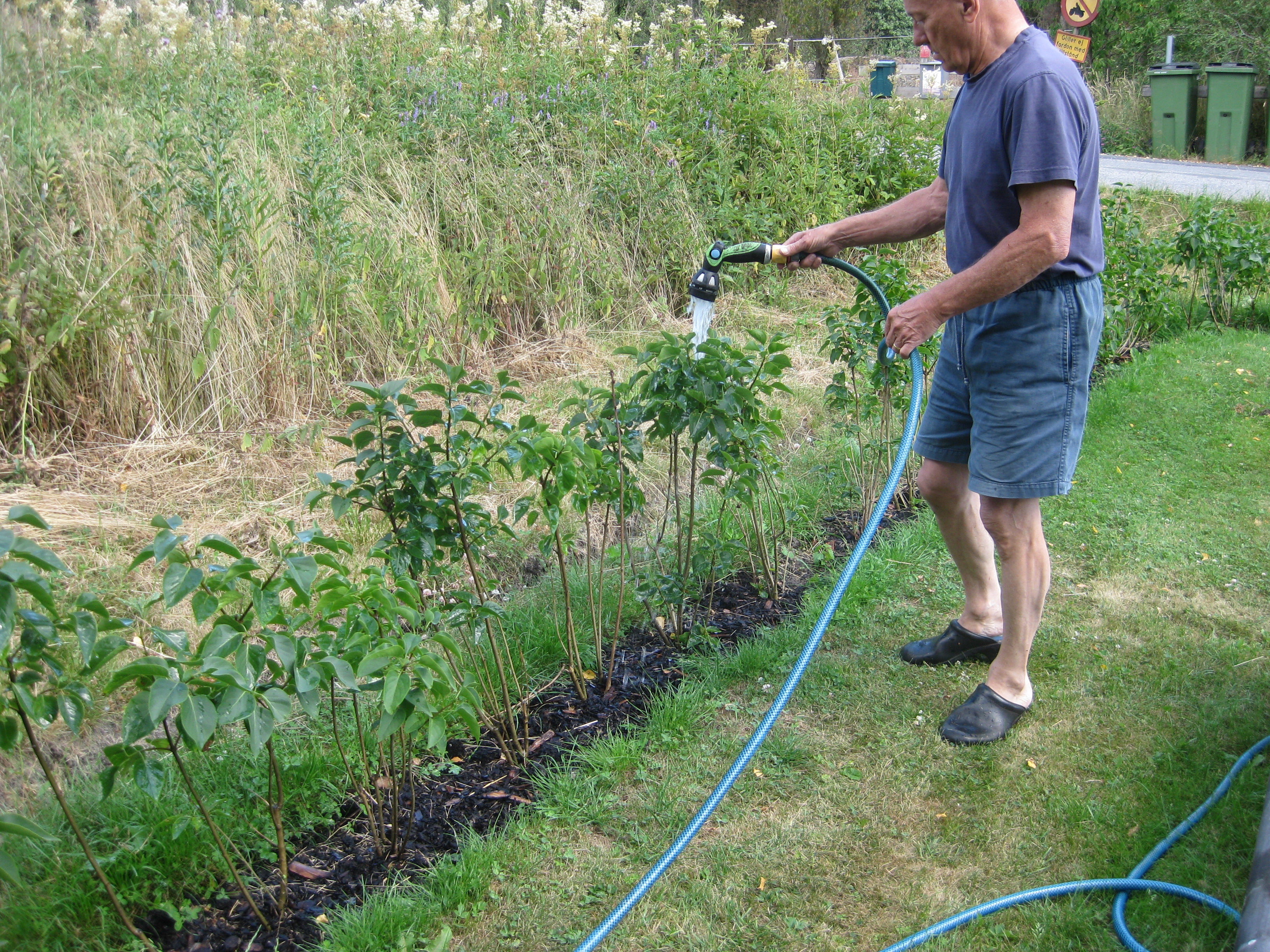 VI gödslar och vattnar på syrénhäcken, konstaterar att brysselkålen håller på att växa ut genom det skyddande höljet, planterar fler fackelblomster i kanten på ”bäcken”, planterar bl.a. lite smörbollar mm inköpt på den lokala trädgårdsmarknaden.