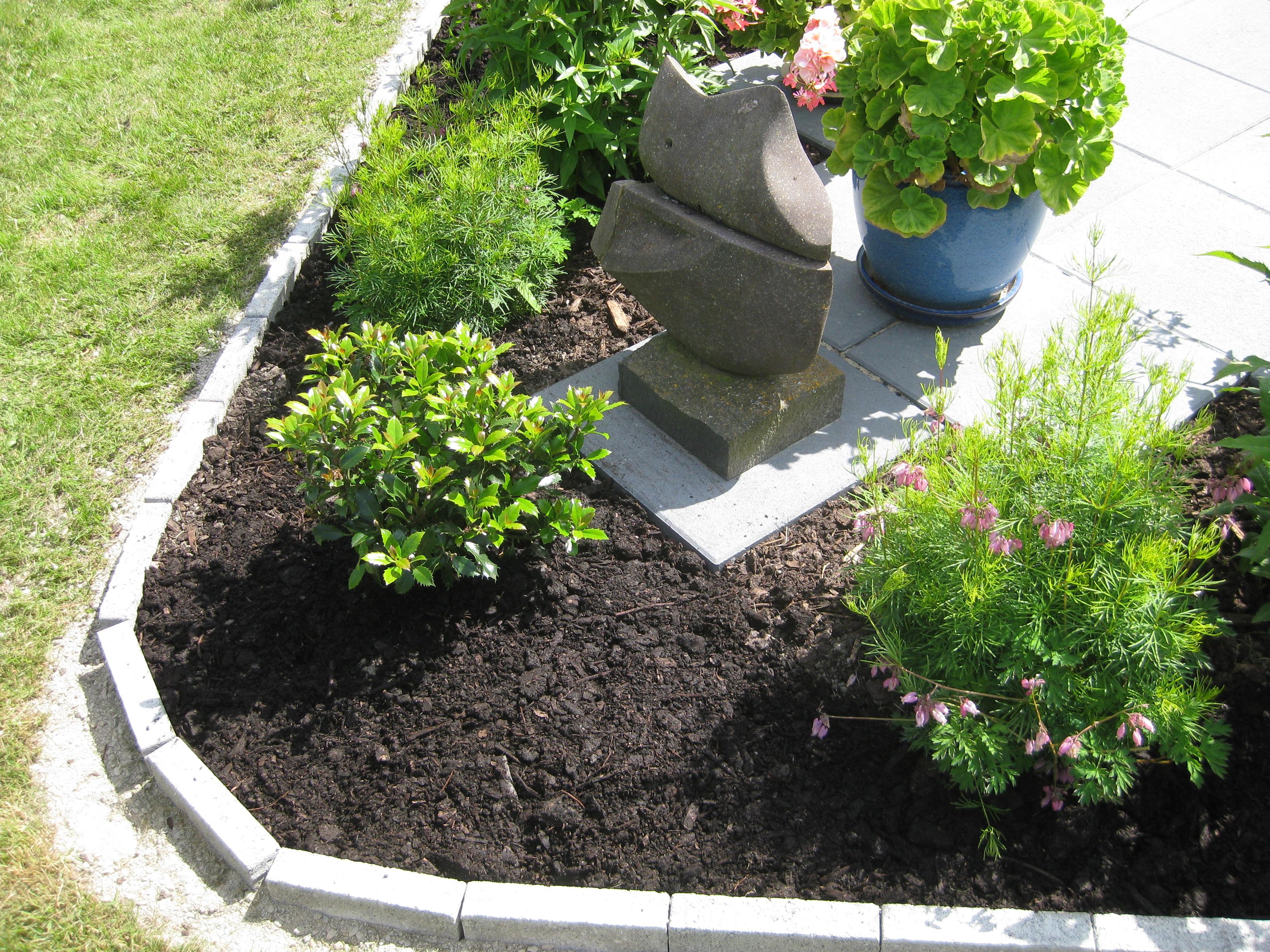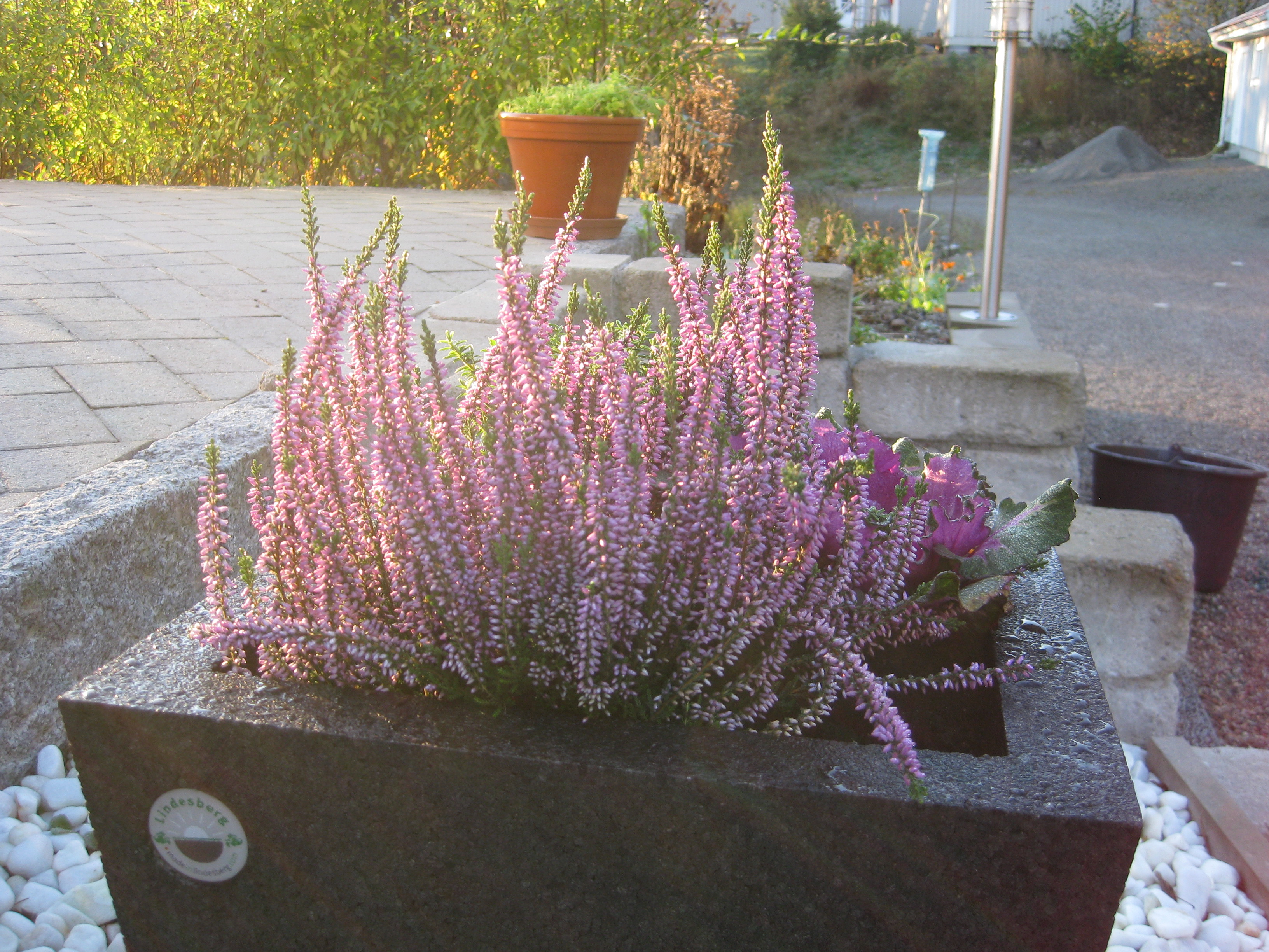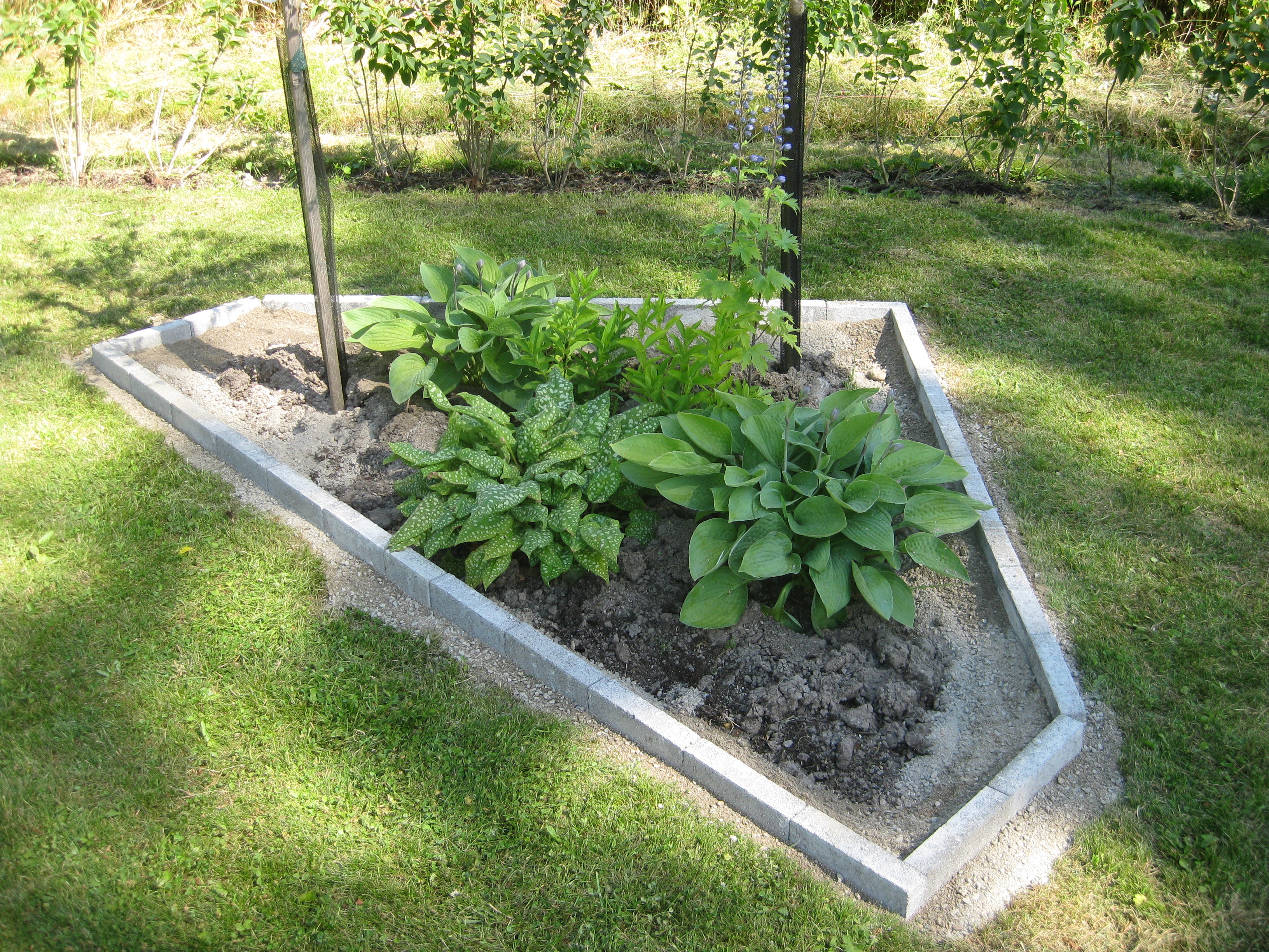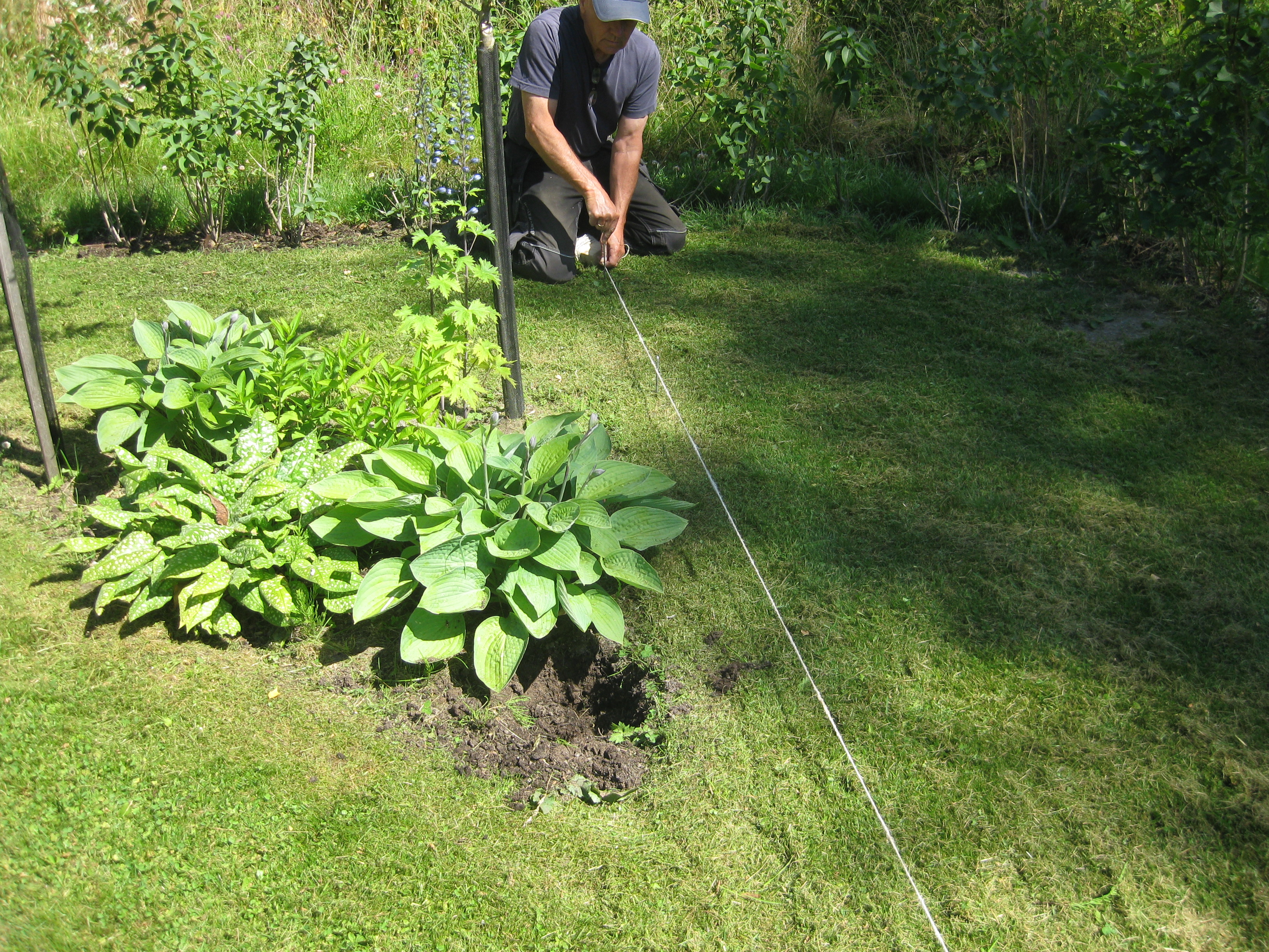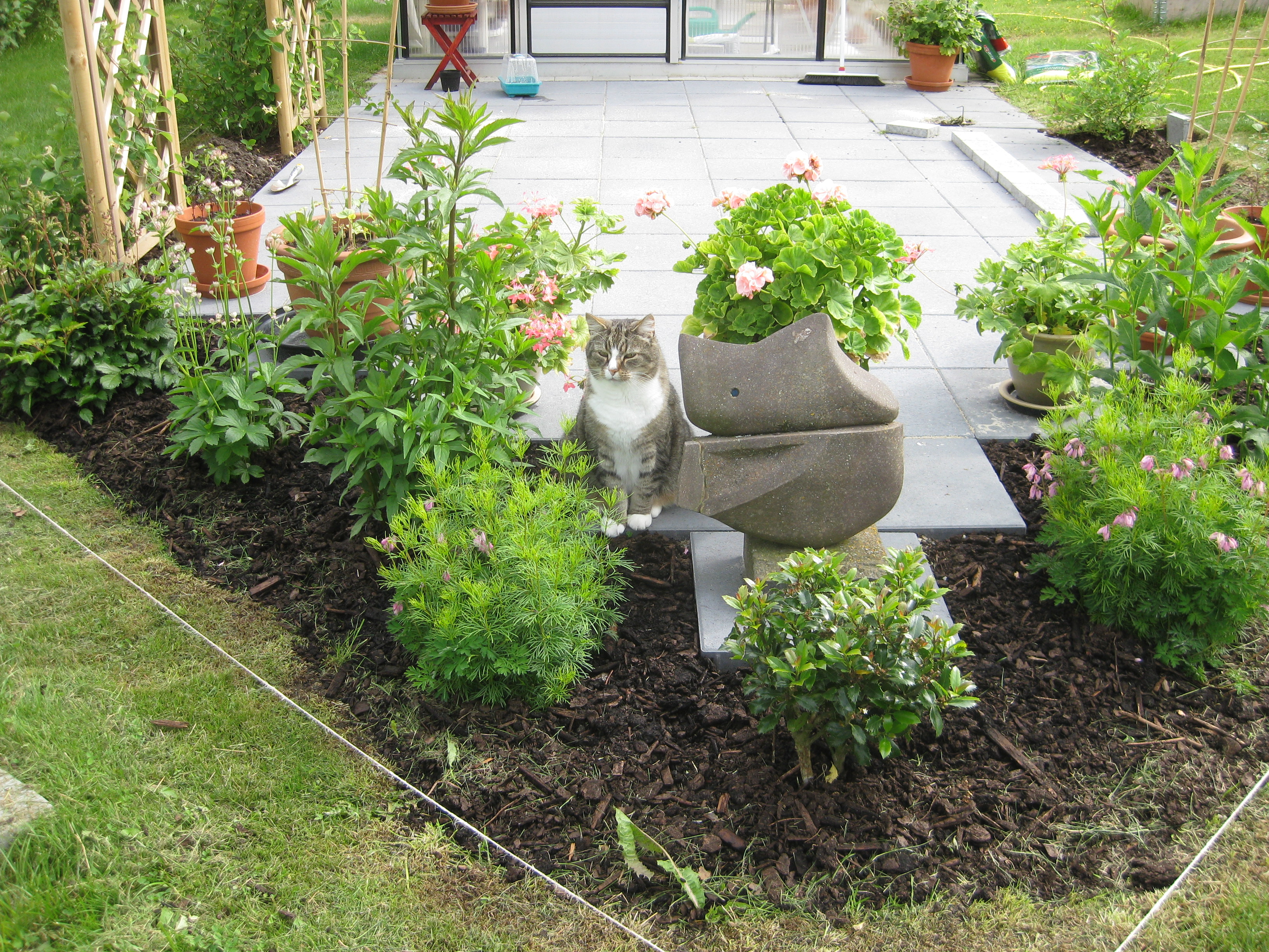 VI gödslar och vattnar på syrénhäcken, konstaterar att brysselkålen håller på att växa ut genom det skyddande höljet, planterar fler fackelblomster i kanten på ”bäcken”, planterar bl.a. lite smörbollar mm inköpt på den lokala trädgårdsmarknaden.