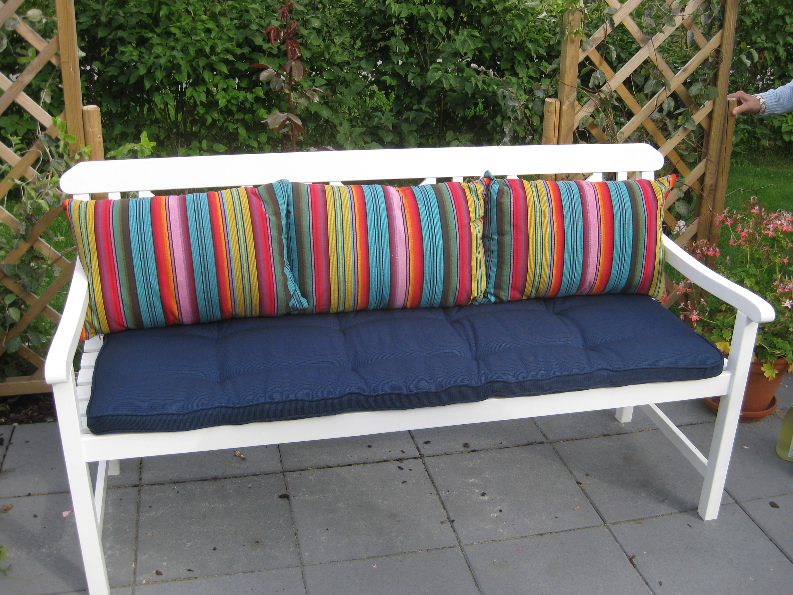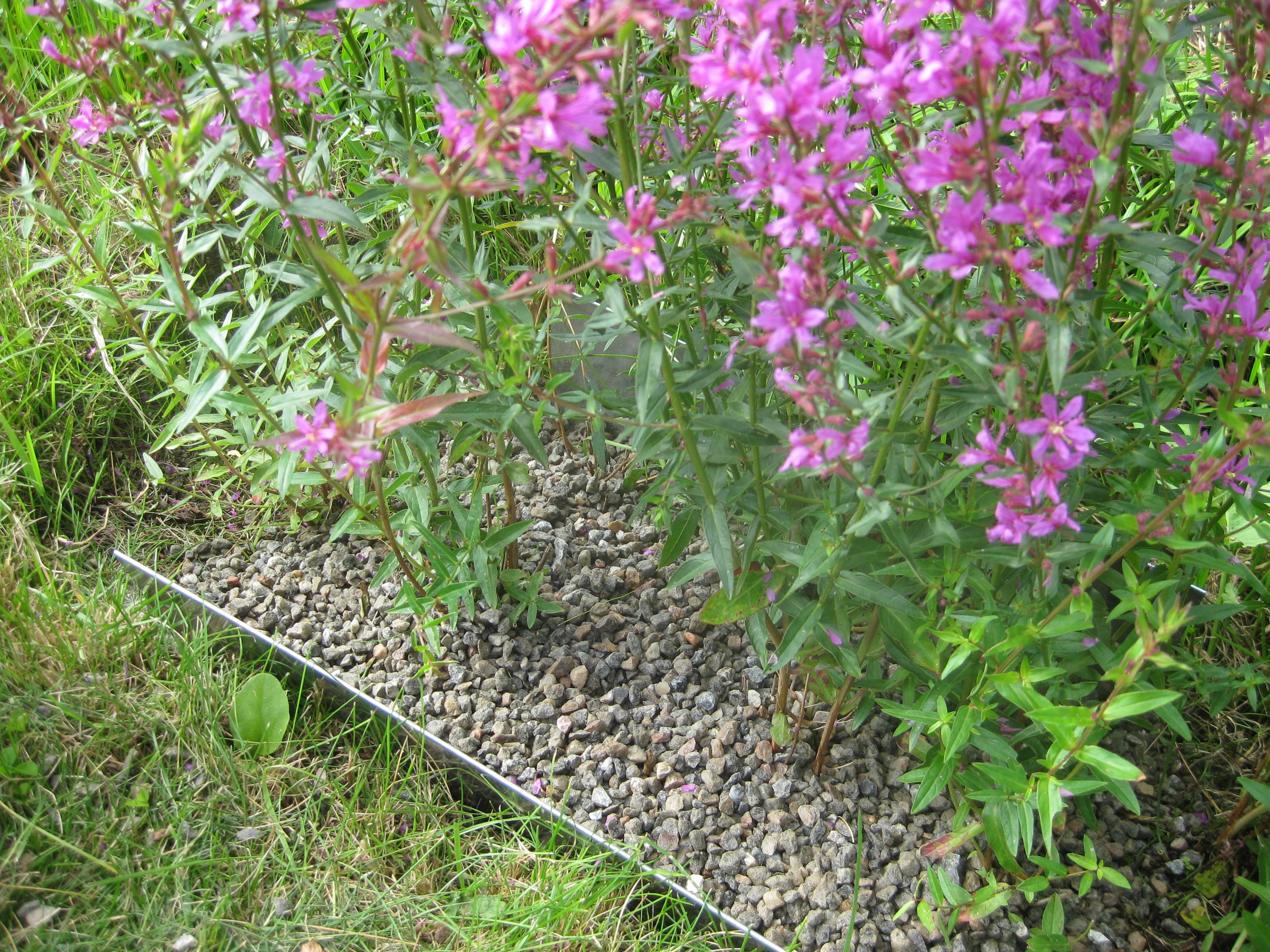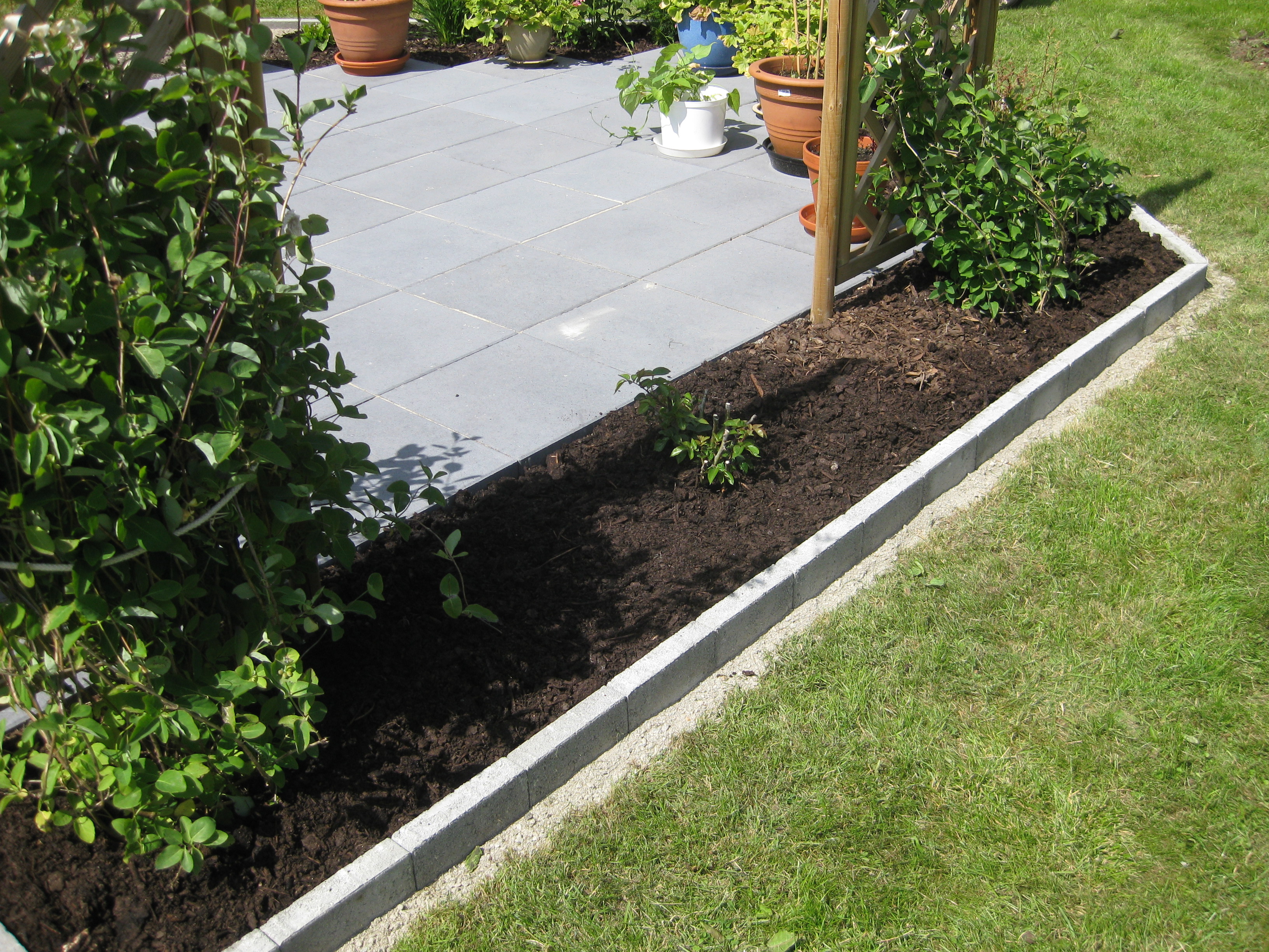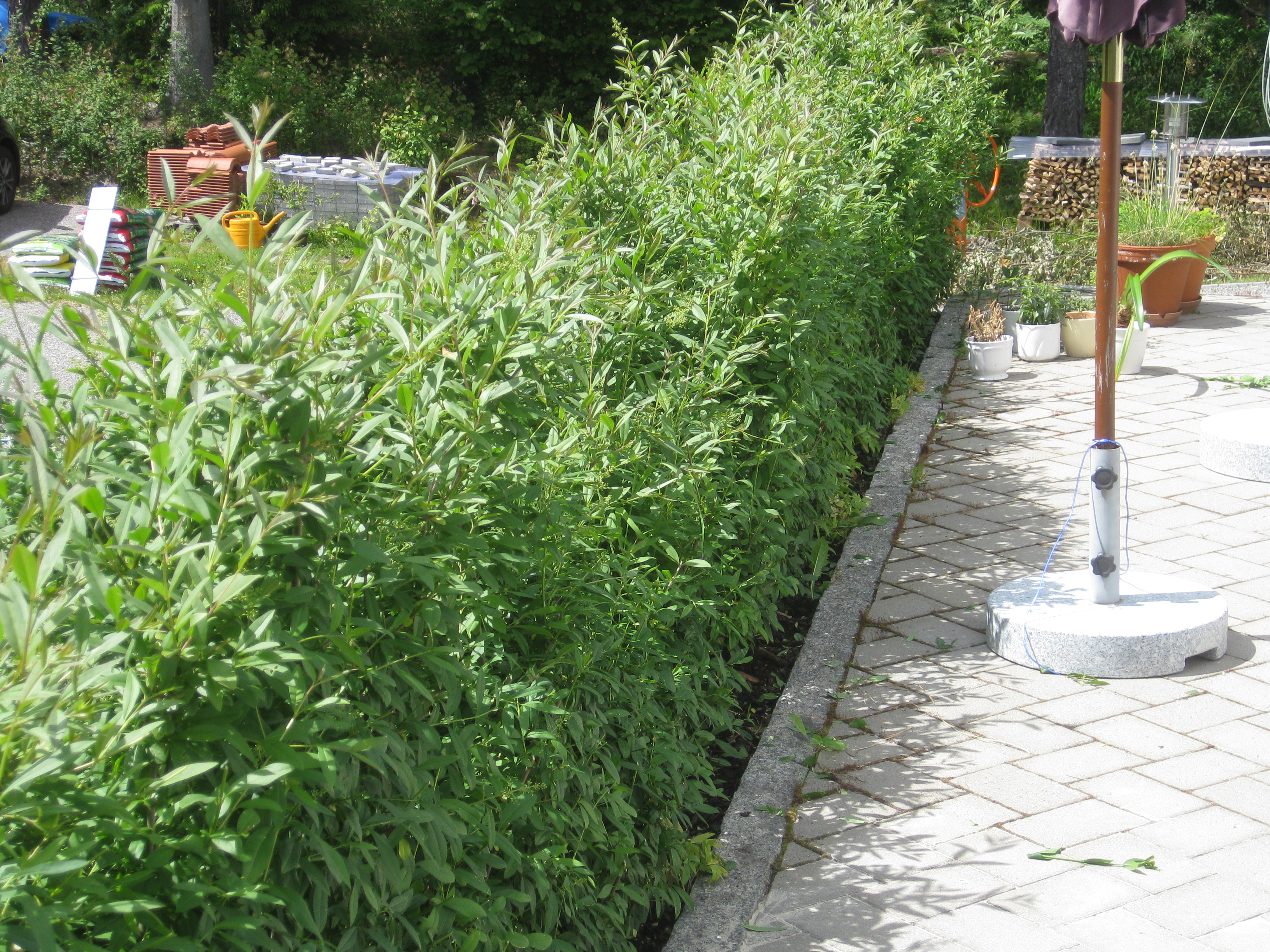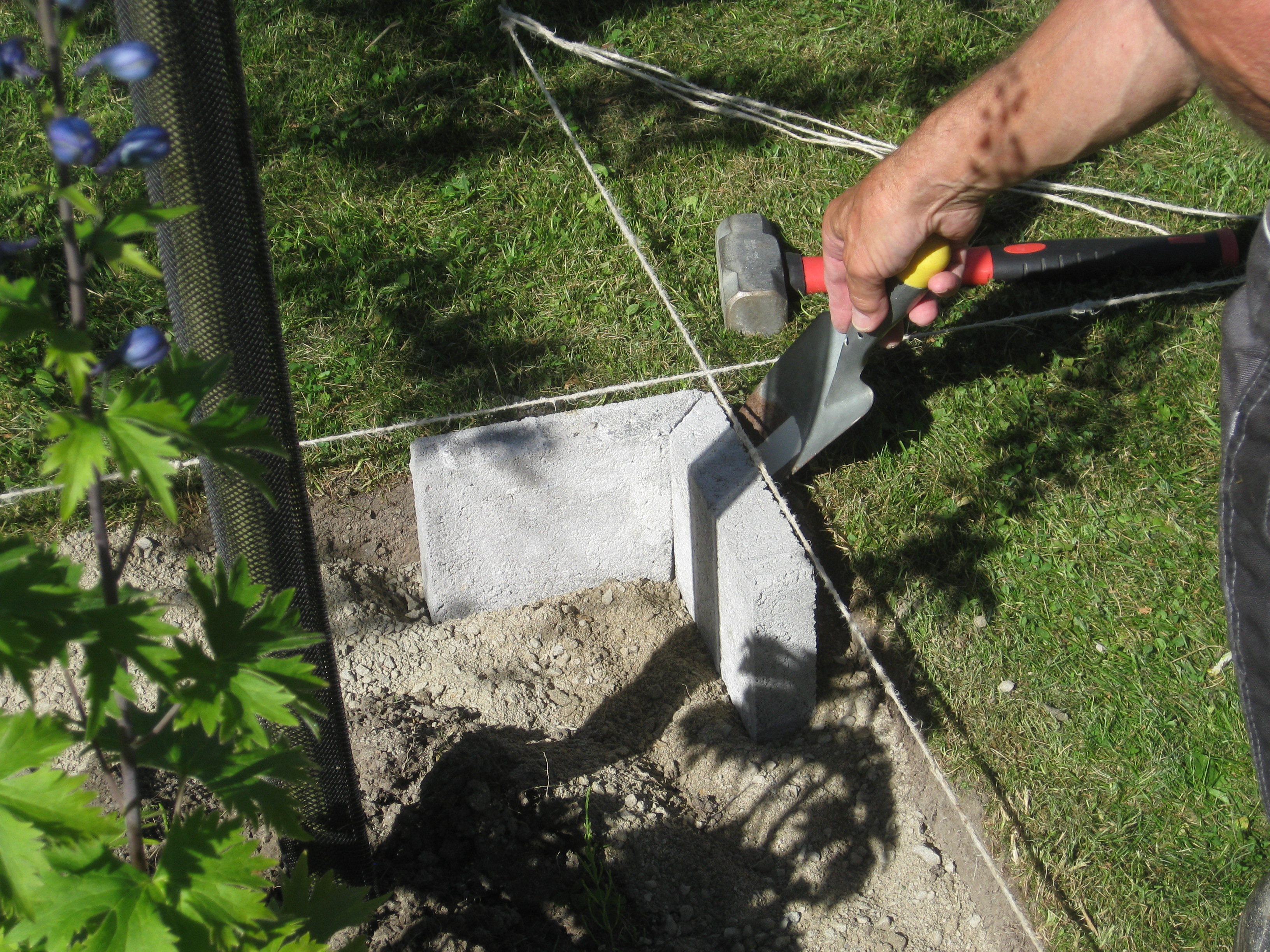 VI gödslar och vattnar på syrénhäcken, konstaterar att brysselkålen håller på att växa ut genom det skyddande höljet, planterar fler fackelblomster i kanten på ”bäcken”, planterar bl.a. lite smörbollar mm inköpt på den lokala trädgårdsmarknaden.