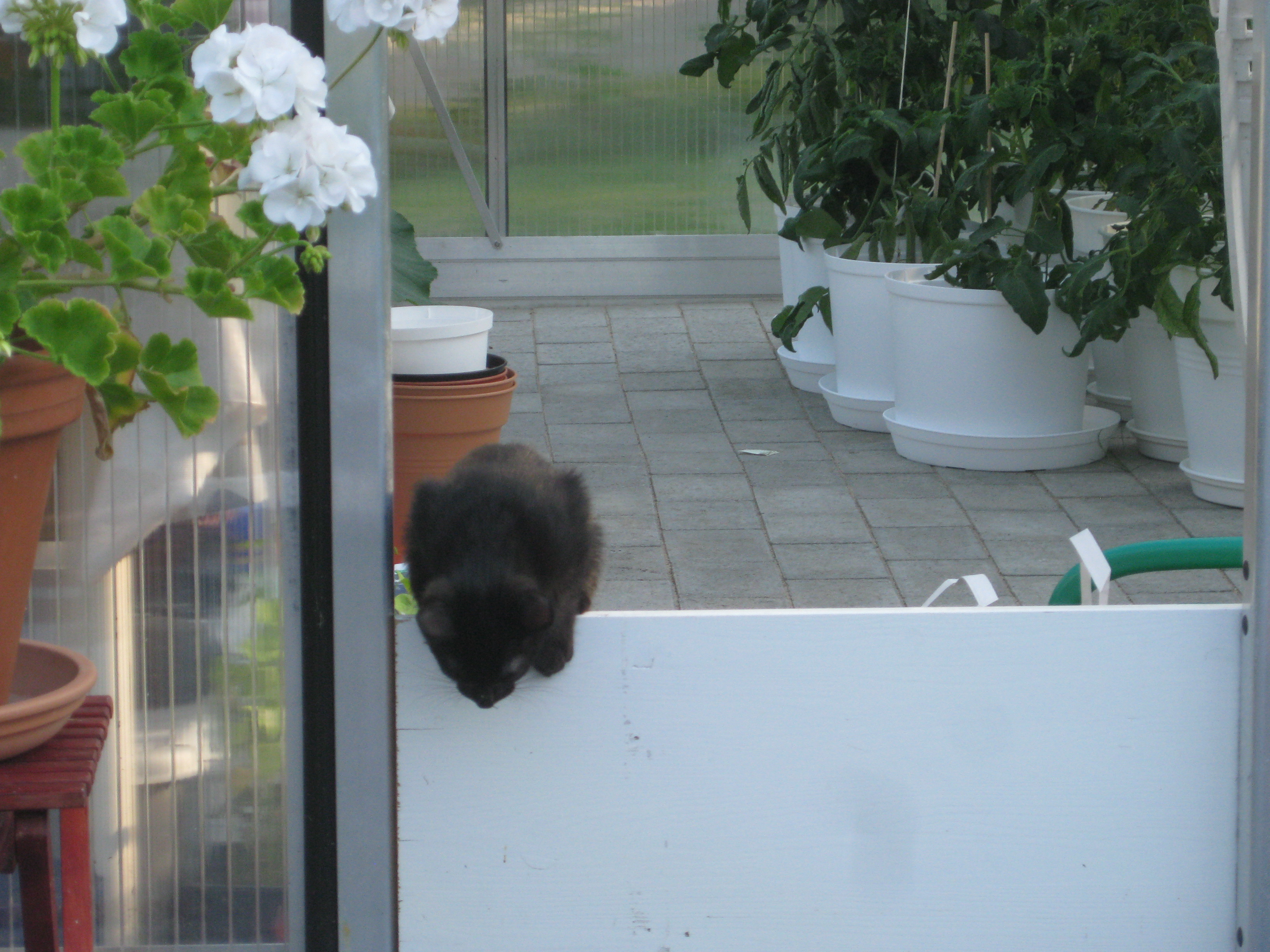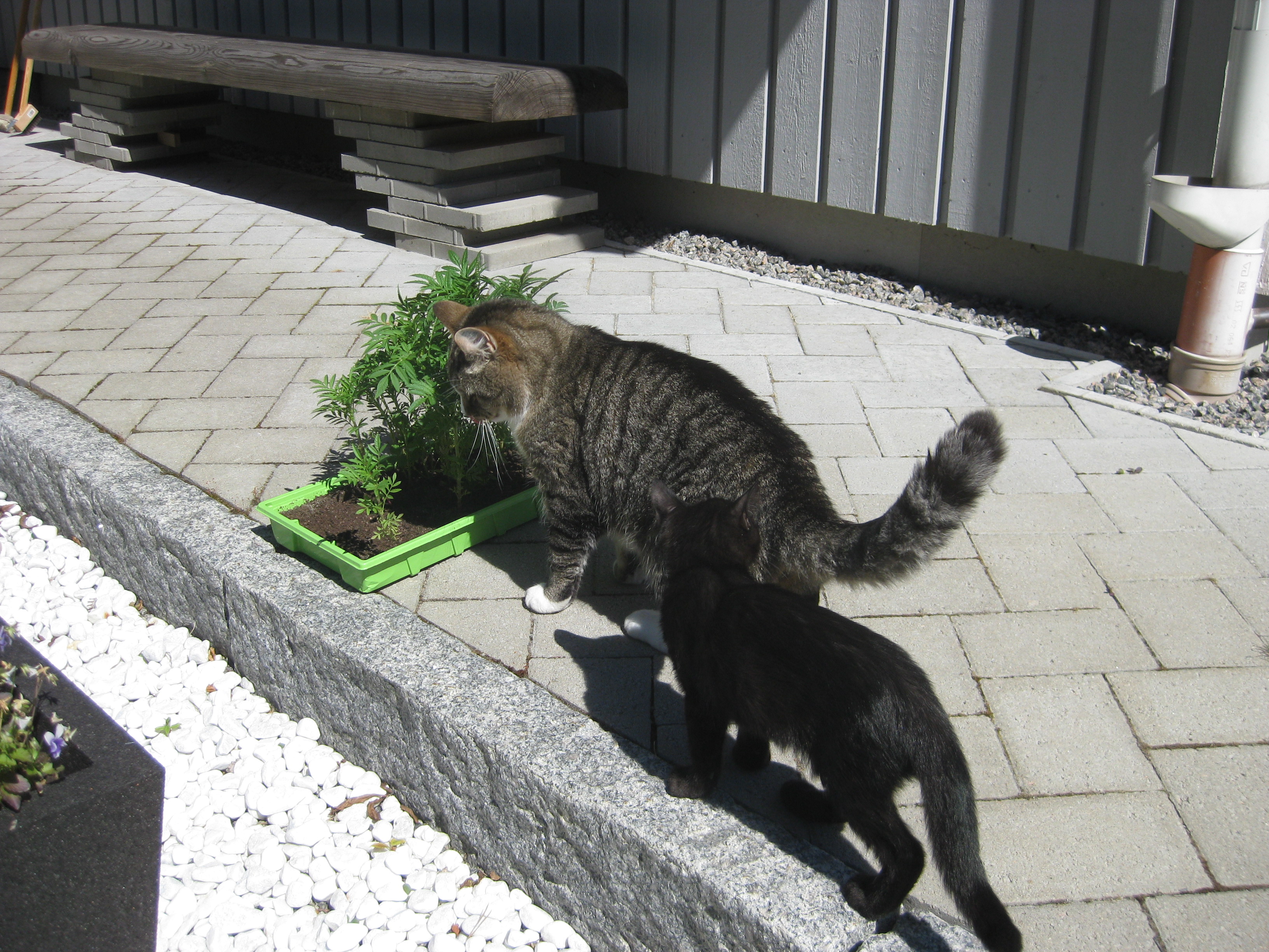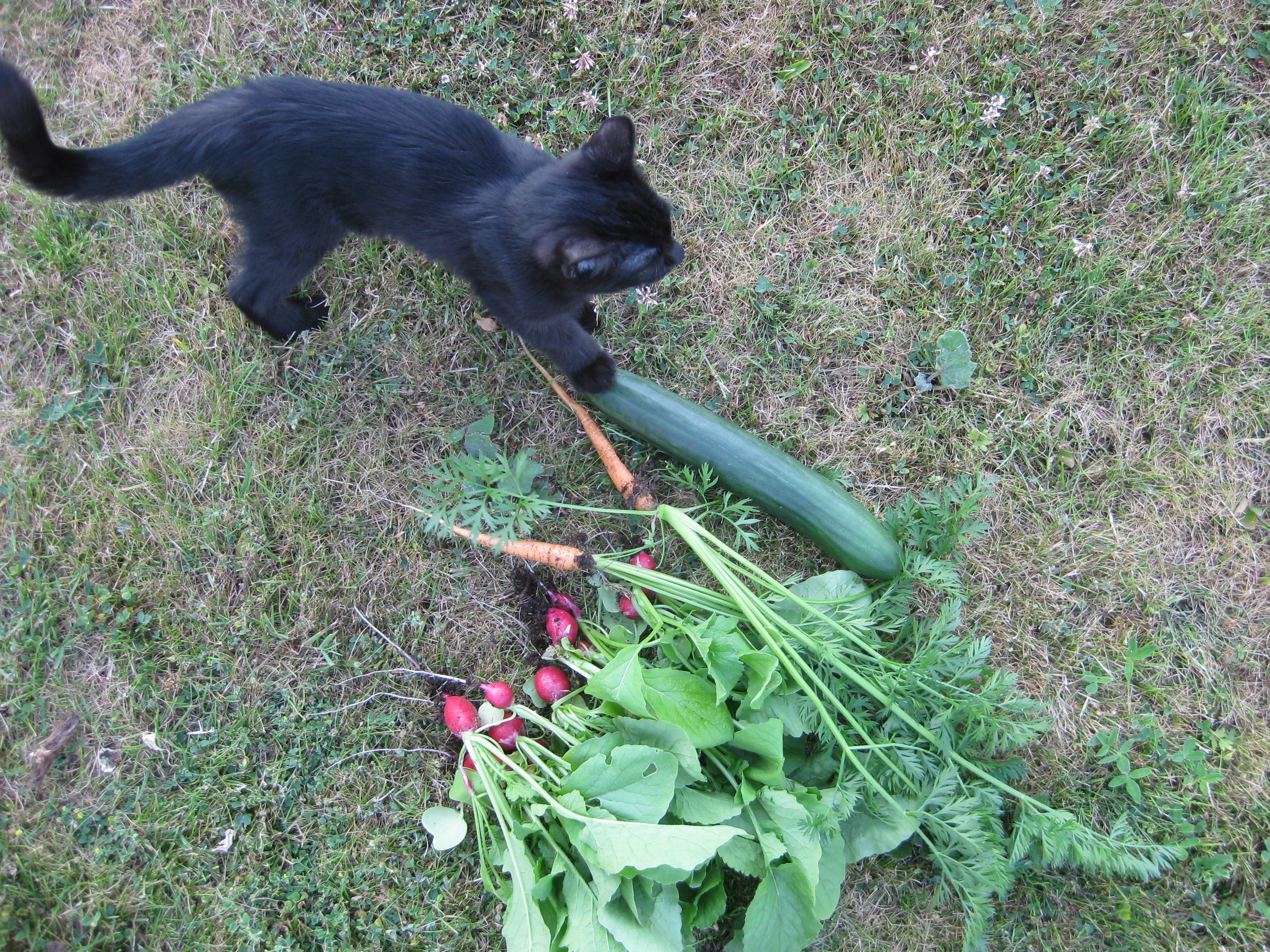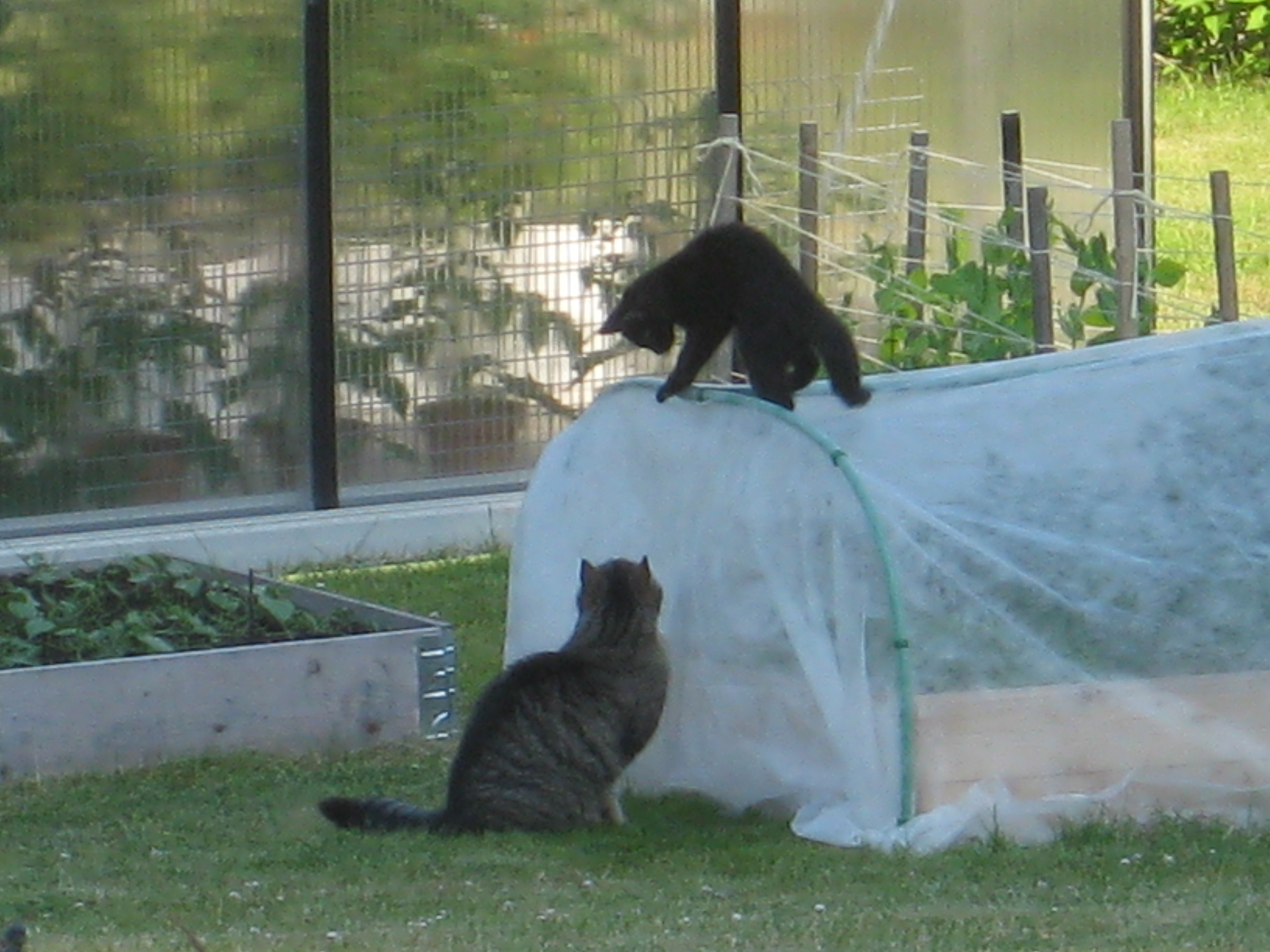 Katterna fortsätter att bekanta sig med varandra, och Moses kommer till mattes förtrytelse på idén att klättra på skyddshuven till pallkragen. Kattungeklorna gör förstås ett antal hål i densamma, innan matte hinner ingripa. Morr! Och så skördar vi första gurkan för säsongen! 🙂