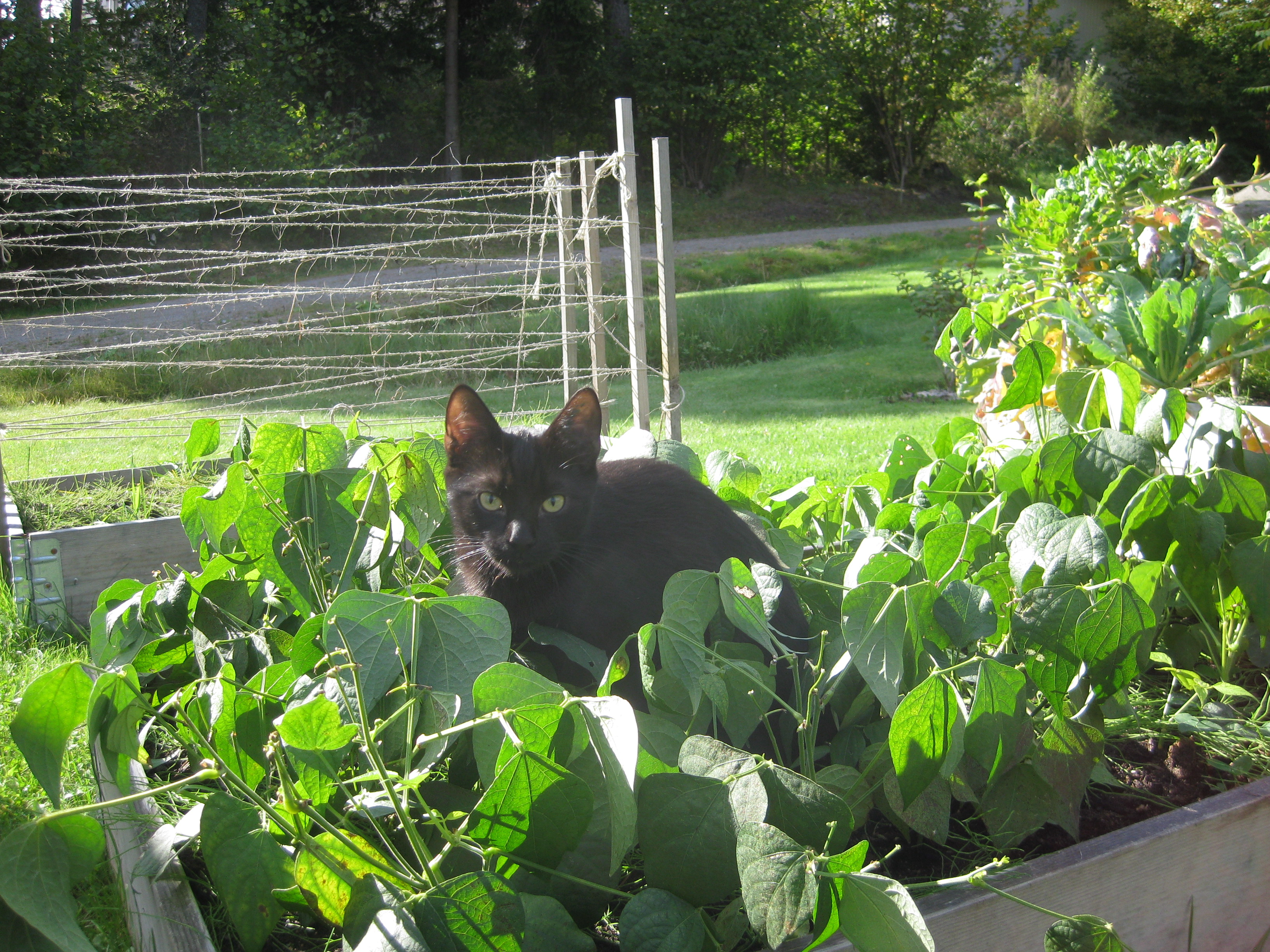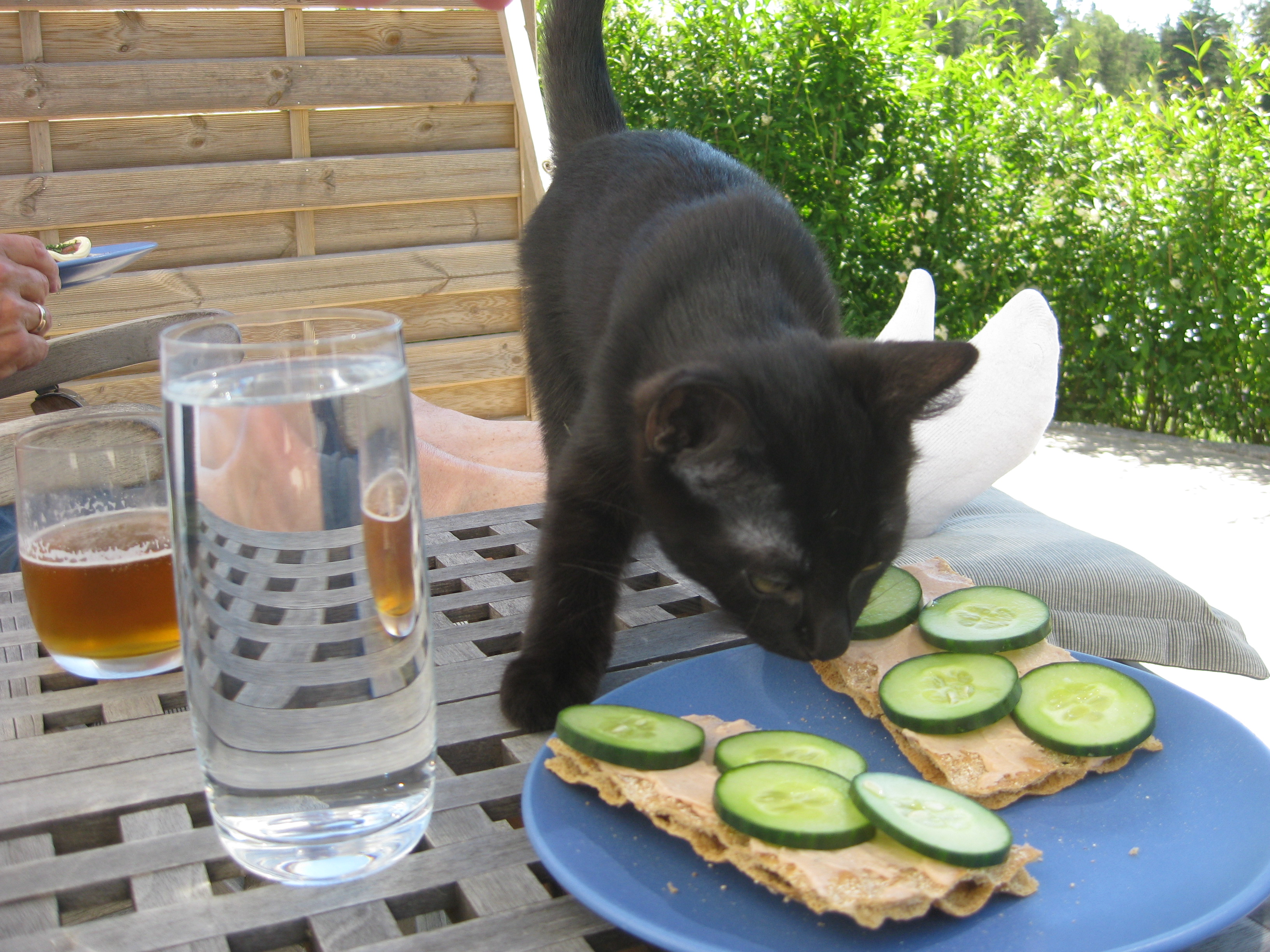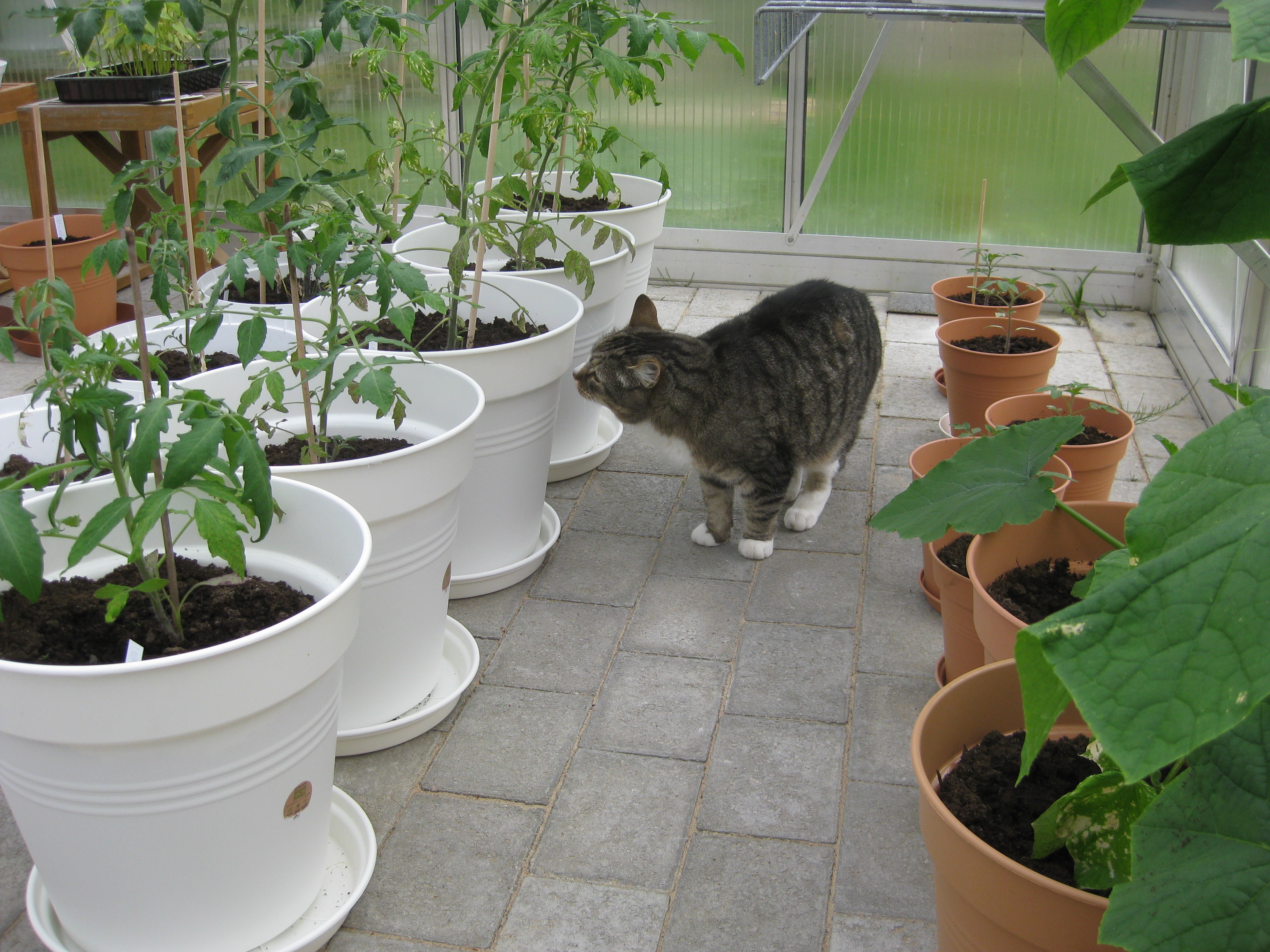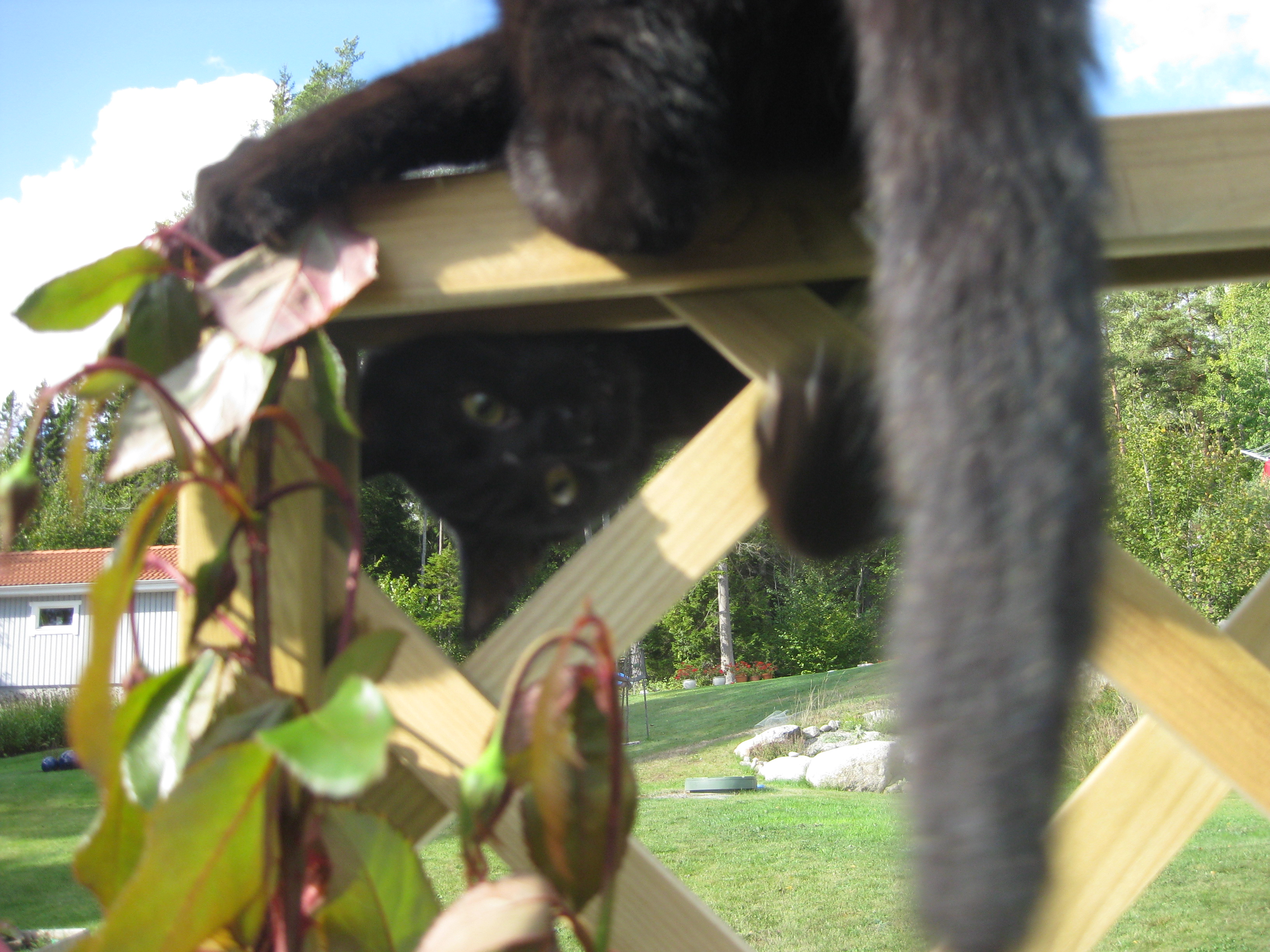 Katterna fortsätter att bekanta sig med varandra, och Moses kommer till mattes förtrytelse på idén att klättra på skyddshuven till pallkragen. Kattungeklorna gör förstås ett antal hål i densamma, innan matte hinner ingripa. Morr! Och så skördar vi första gurkan för säsongen! 🙂