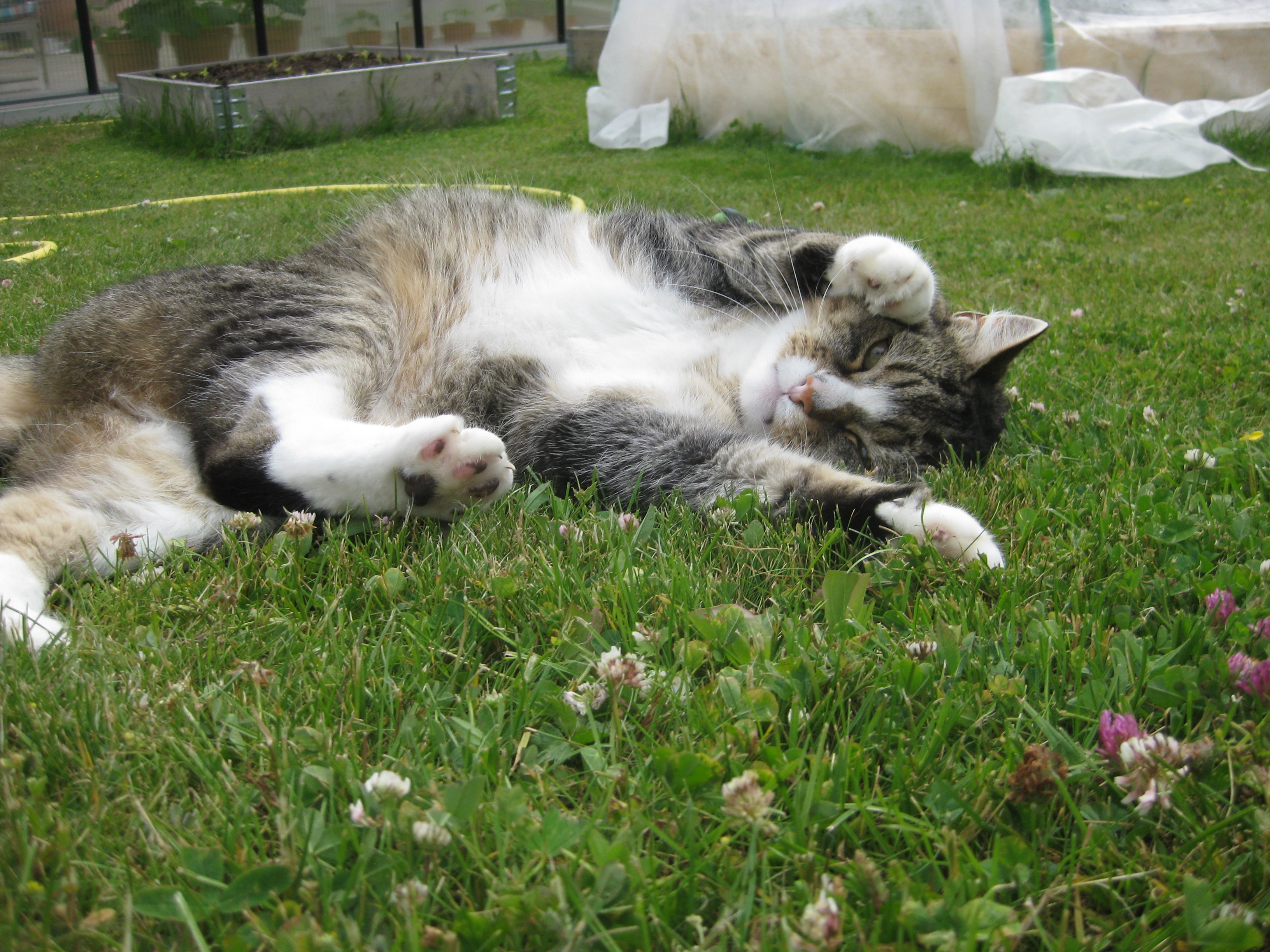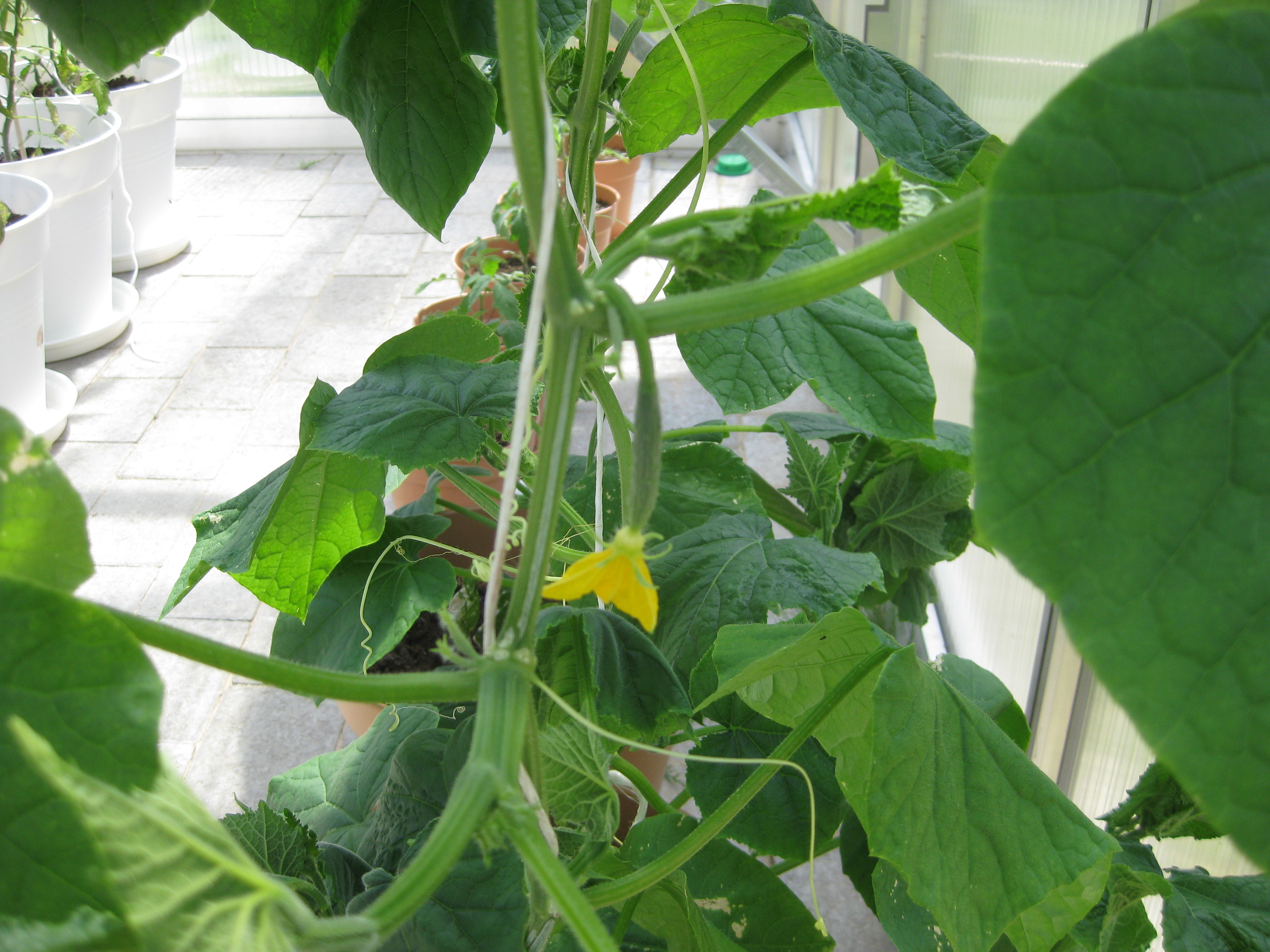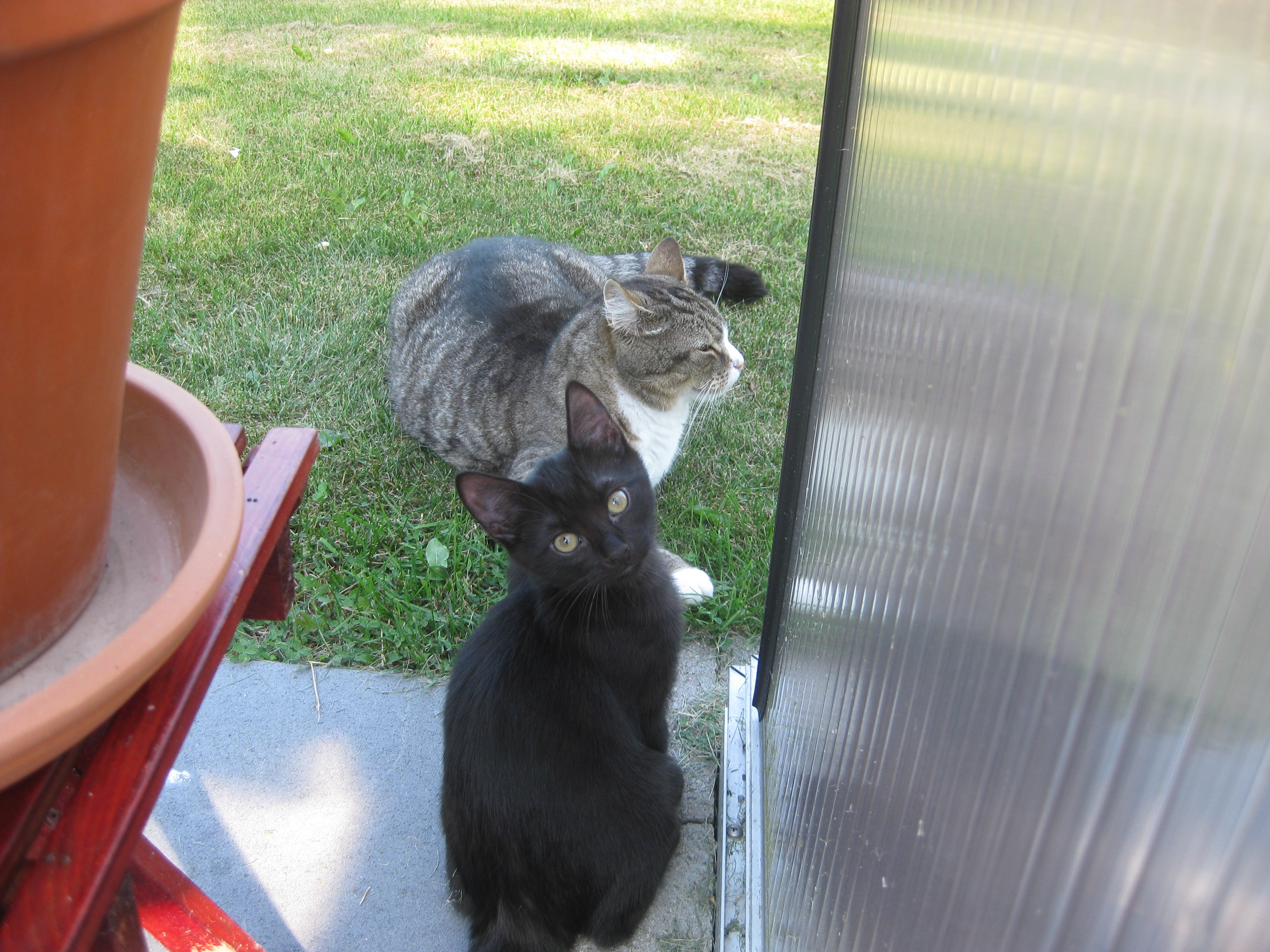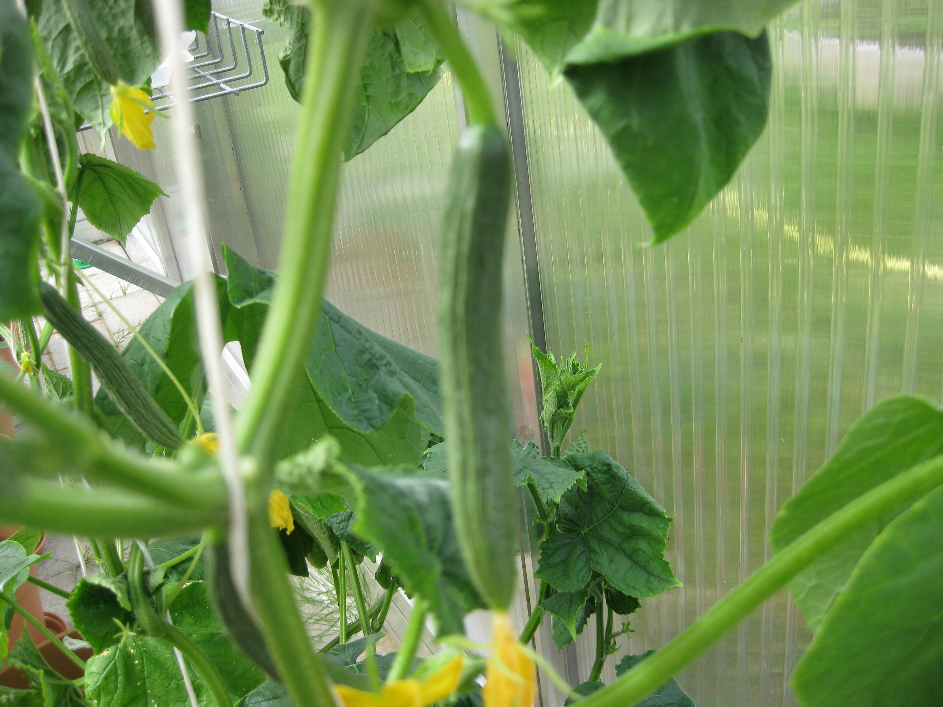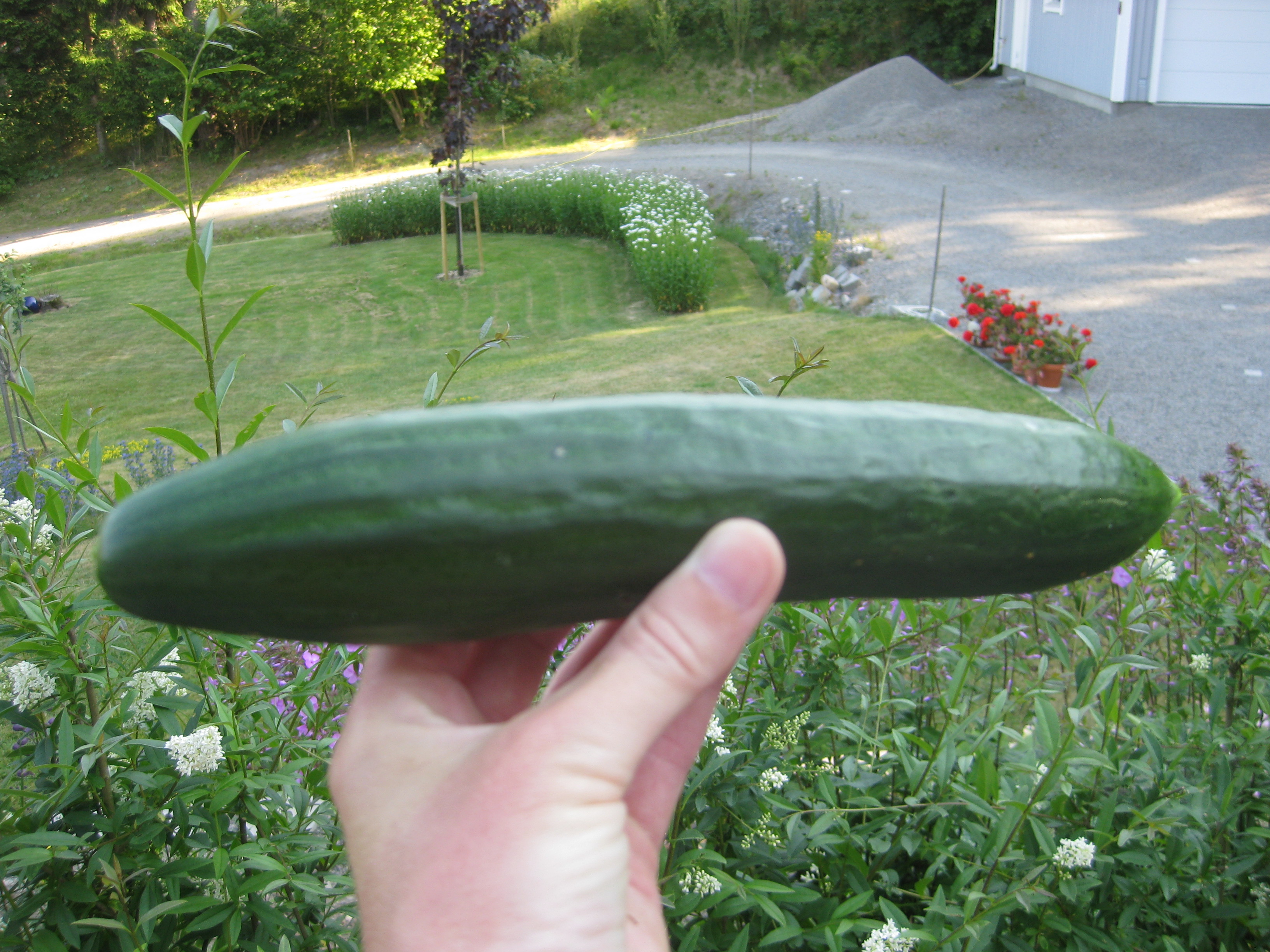 Katterna fortsätter att bekanta sig med varandra, och Moses kommer till mattes förtrytelse på idén att klättra på skyddshuven till pallkragen. Kattungeklorna gör förstås ett antal hål i densamma, innan matte hinner ingripa. Morr! Och så skördar vi första gurkan för säsongen! 🙂