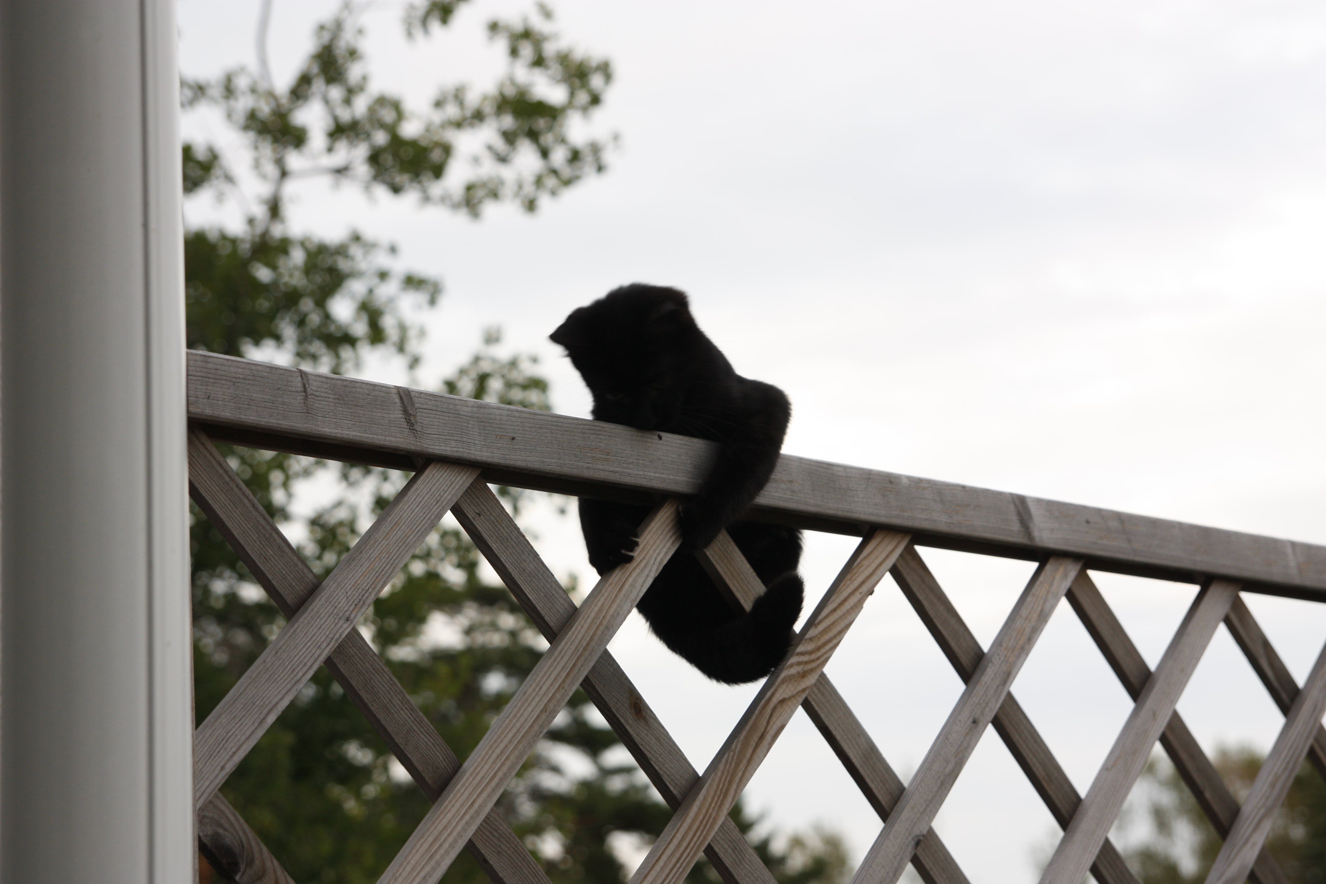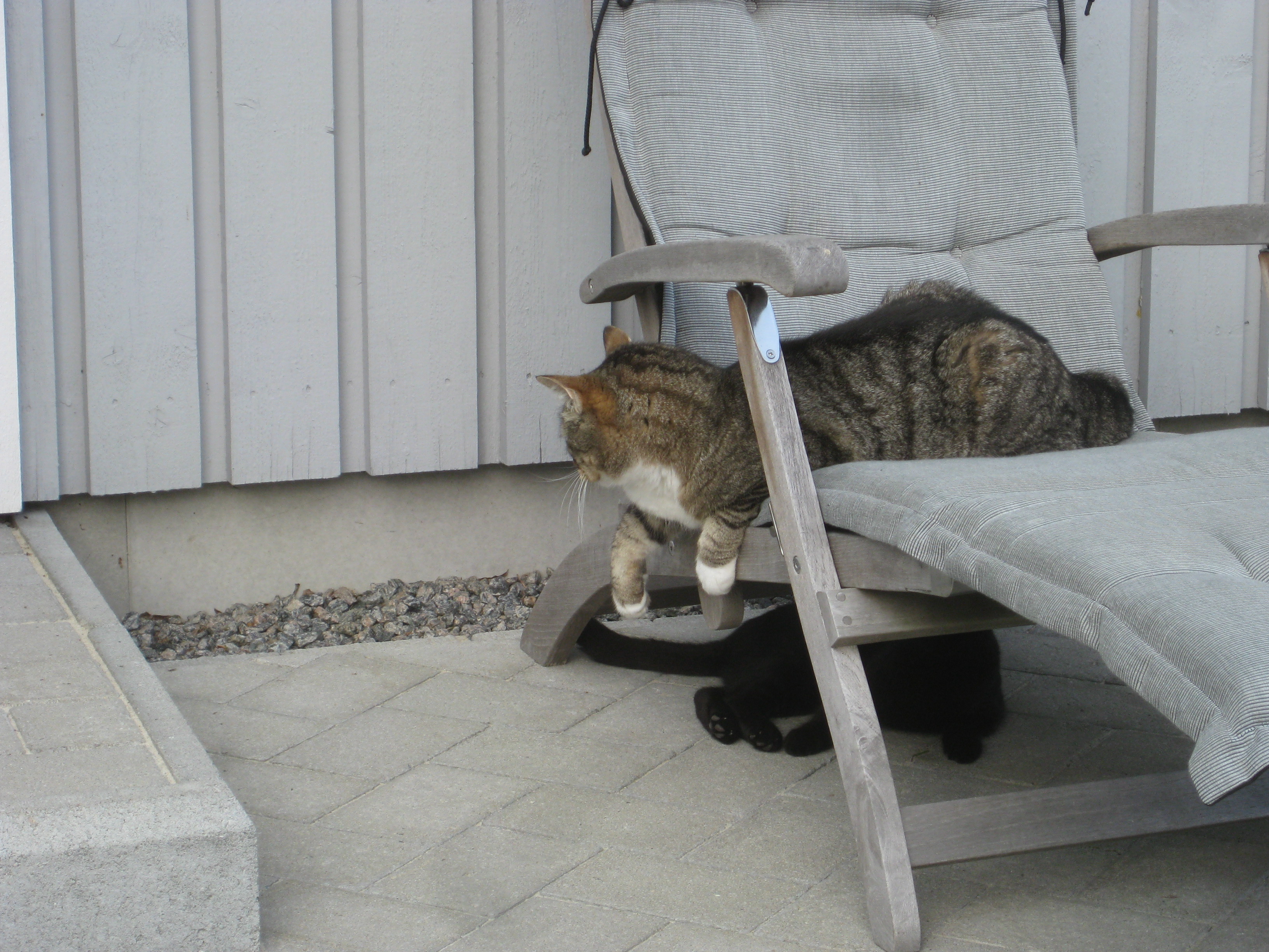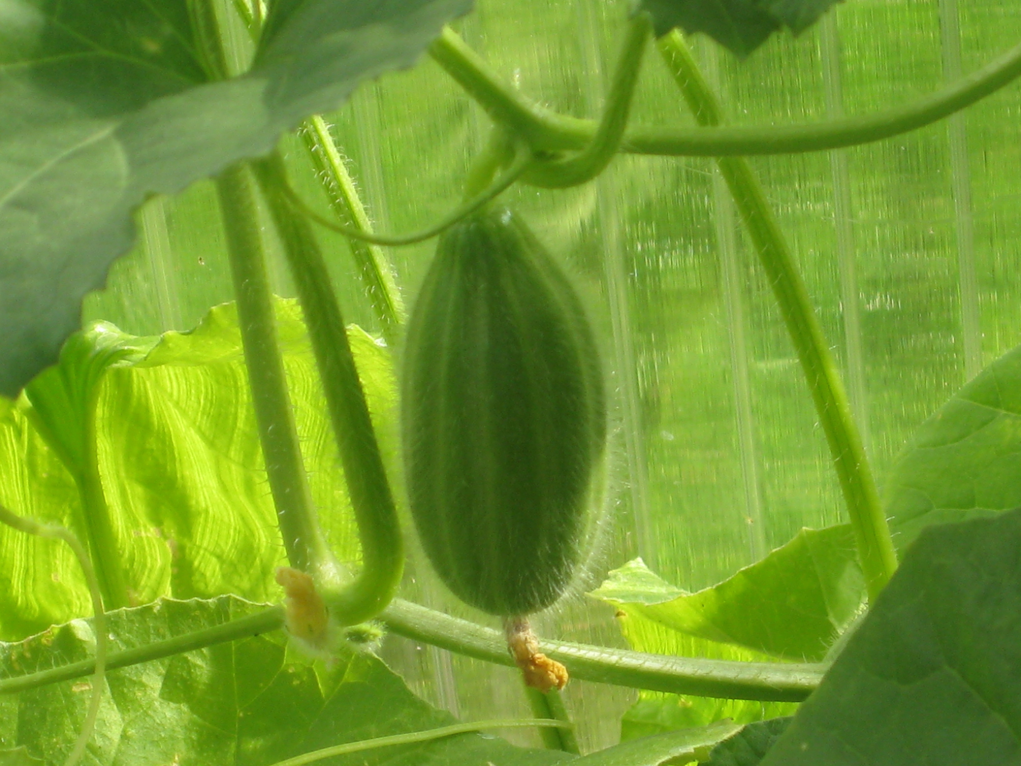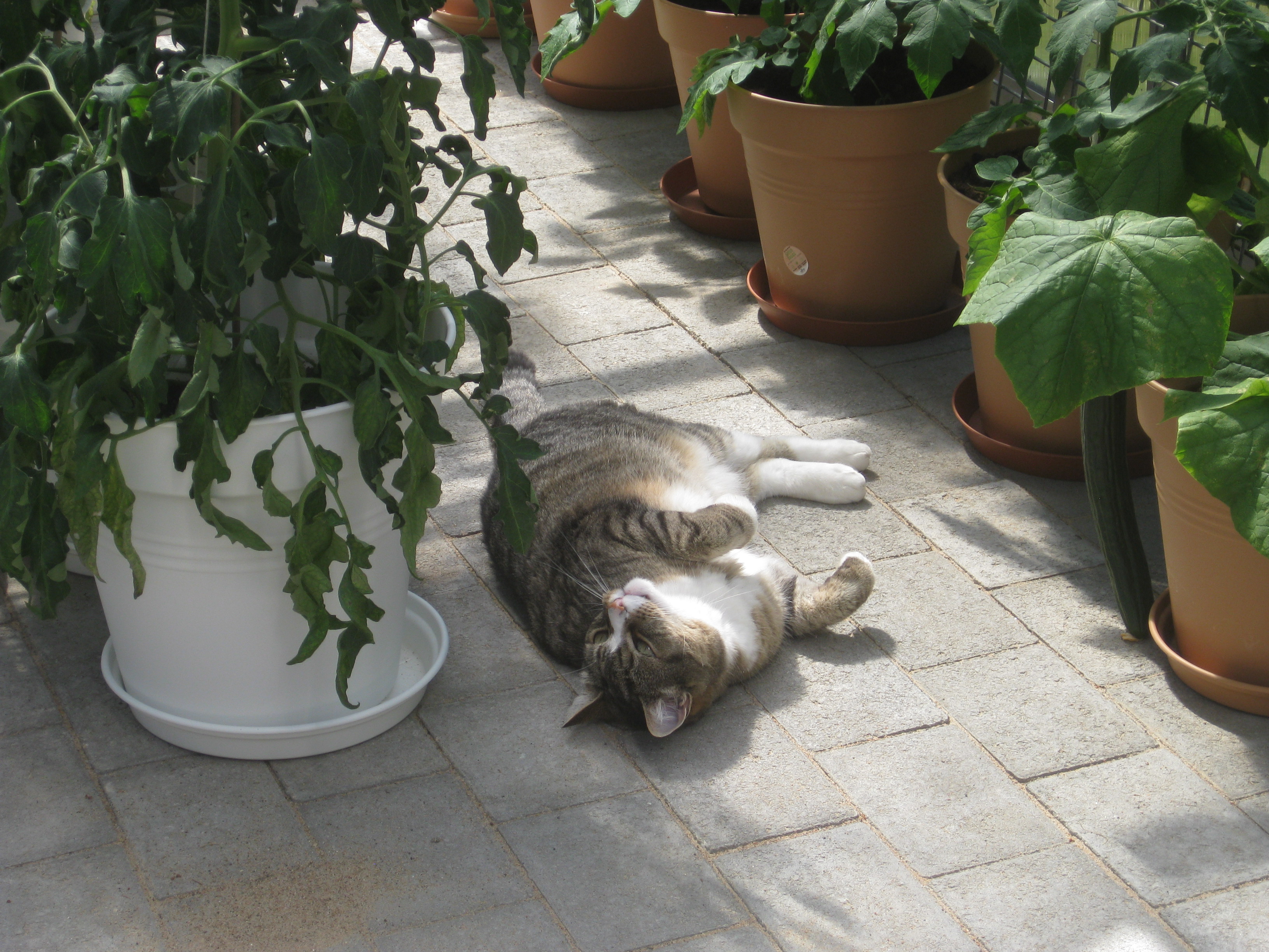 Katterna fortsätter att bekanta sig med varandra, och Moses kommer till mattes förtrytelse på idén att klättra på skyddshuven till pallkragen. Kattungeklorna gör förstås ett antal hål i densamma, innan matte hinner ingripa. Morr! Och så skördar vi första gurkan för säsongen! 🙂