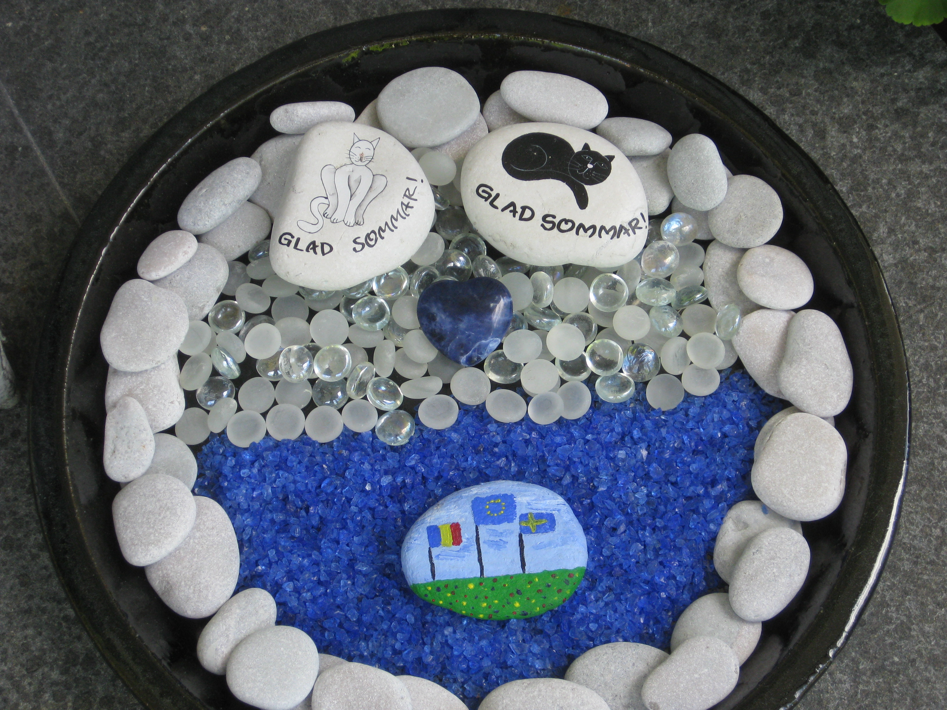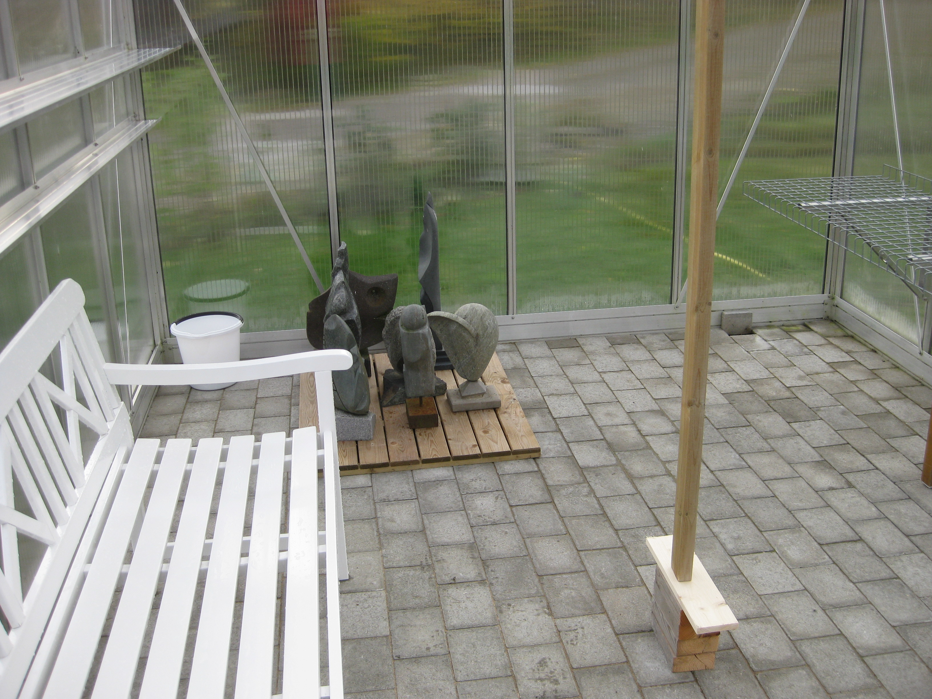 Syrénerna börjar knoppas. Vi flyttar ut våra skulpturer, varav den blå är ”ny” för i år. Den har stått i verkstaden skruttig och ful och behövt åtgärdas i några år – men i vintras kom vi oss för med att måla om den. Tjusigt! Håkan får i uppgift att klippa kaprifolerna som också börjat skjuta skott. Katarina städar i växthuset, borstar ner ny sand i fogarna, och konstaterar att vi behöver inhandla div. myrbekämpningsmedel. Men nu är där prydligt och fint, och allt är redo för växtsäsongen. 😀 Och vi kan avsluta arbetsdagen med en kopp kaffe i växthuset … 😉