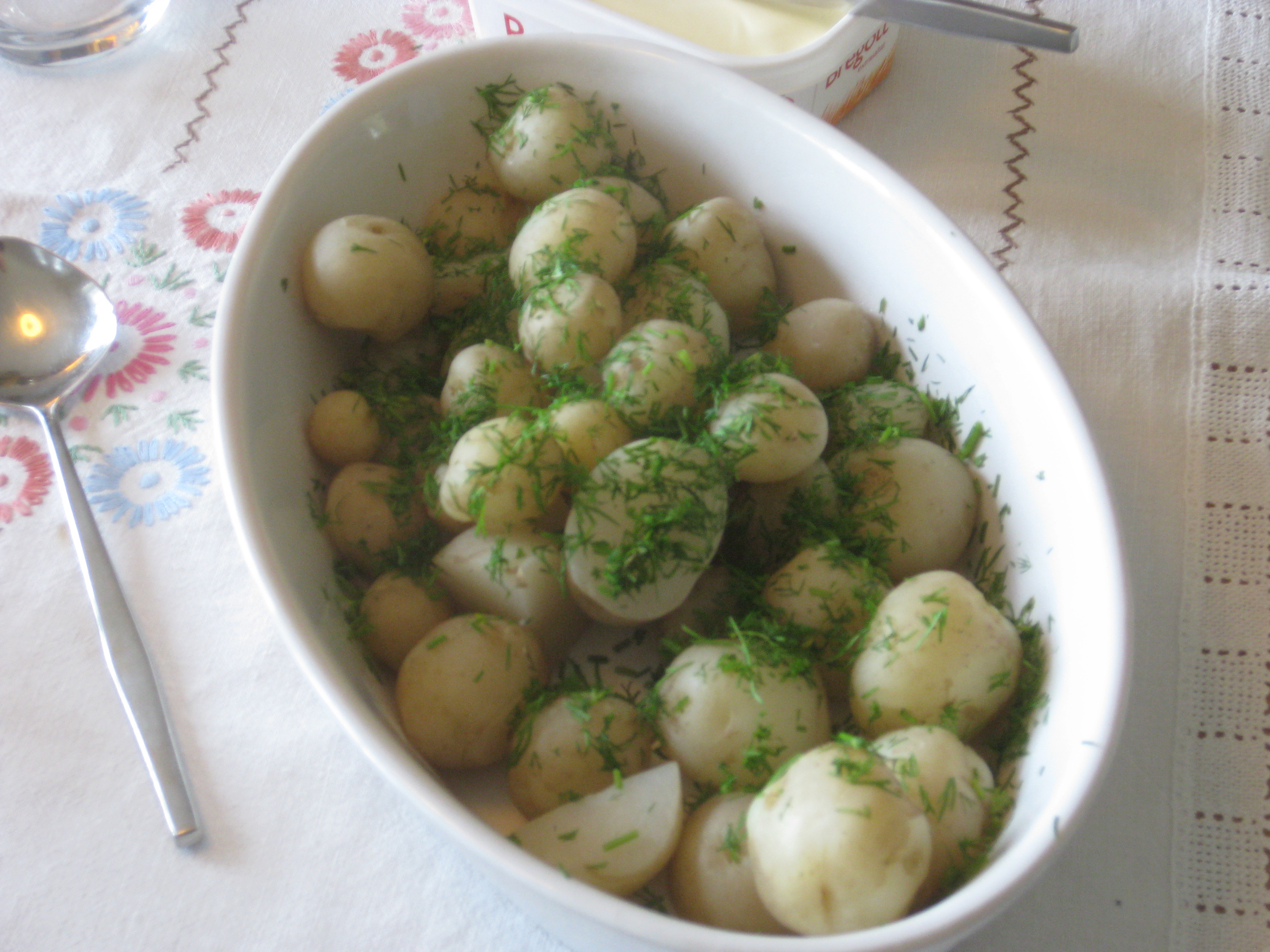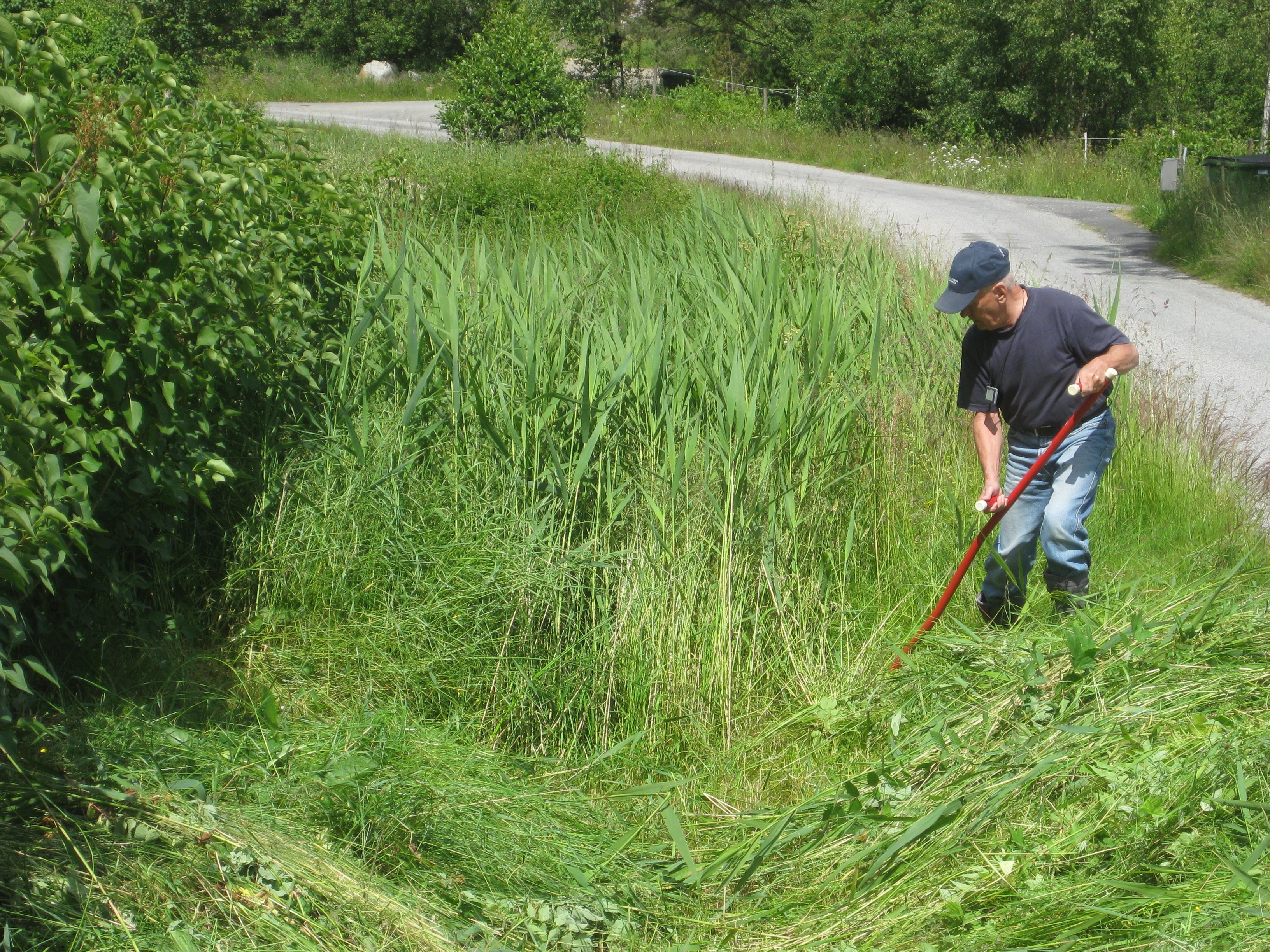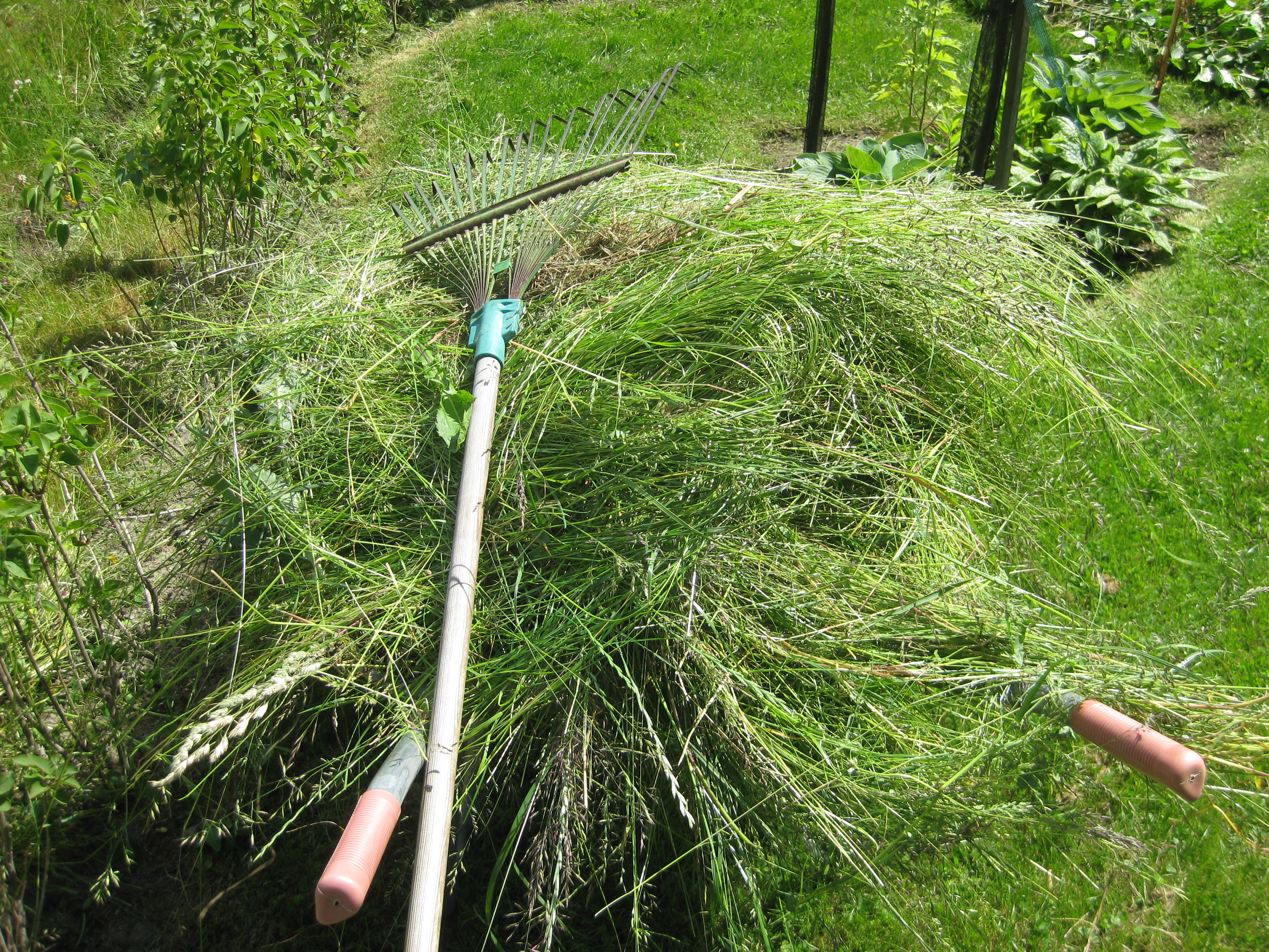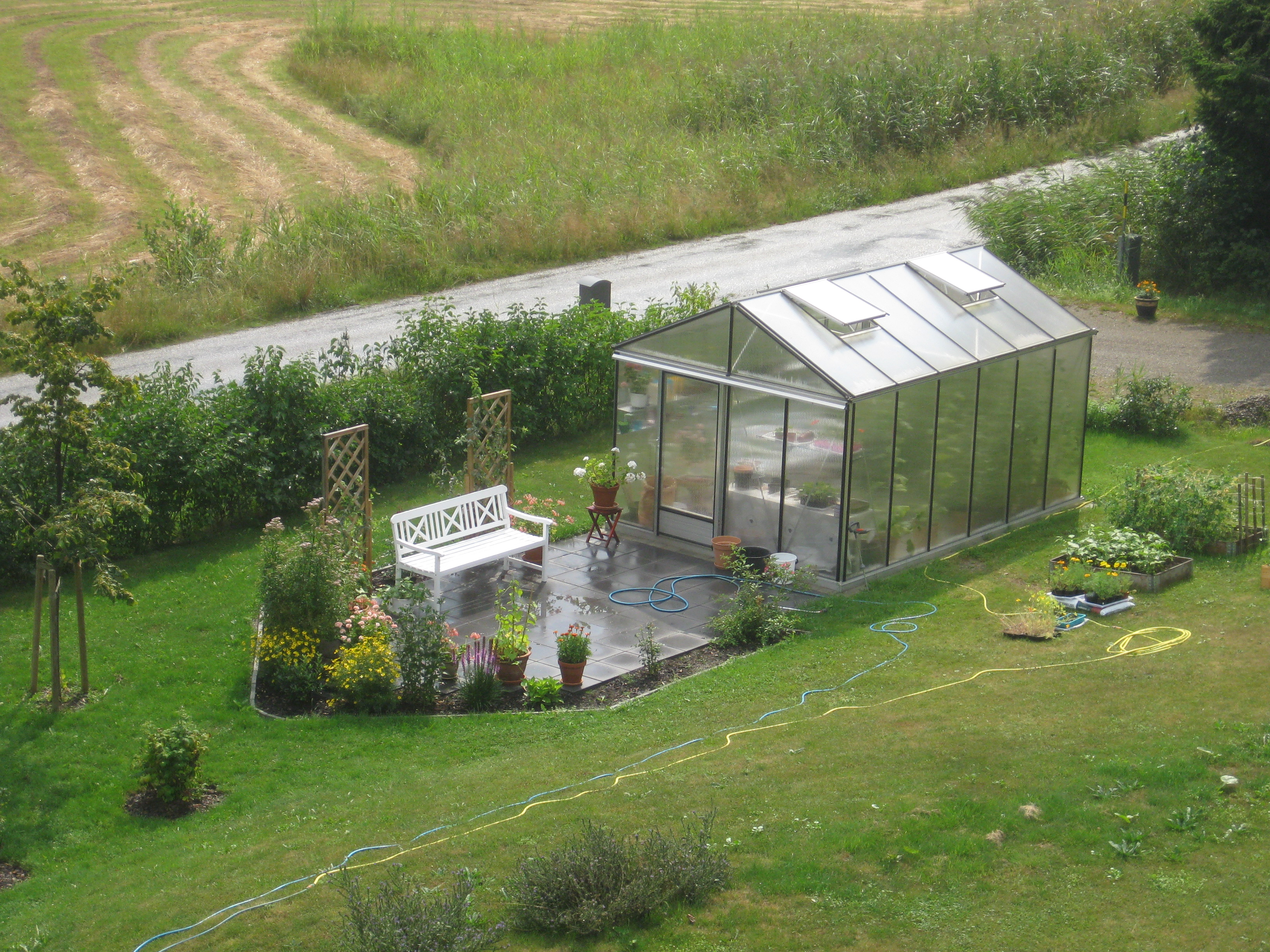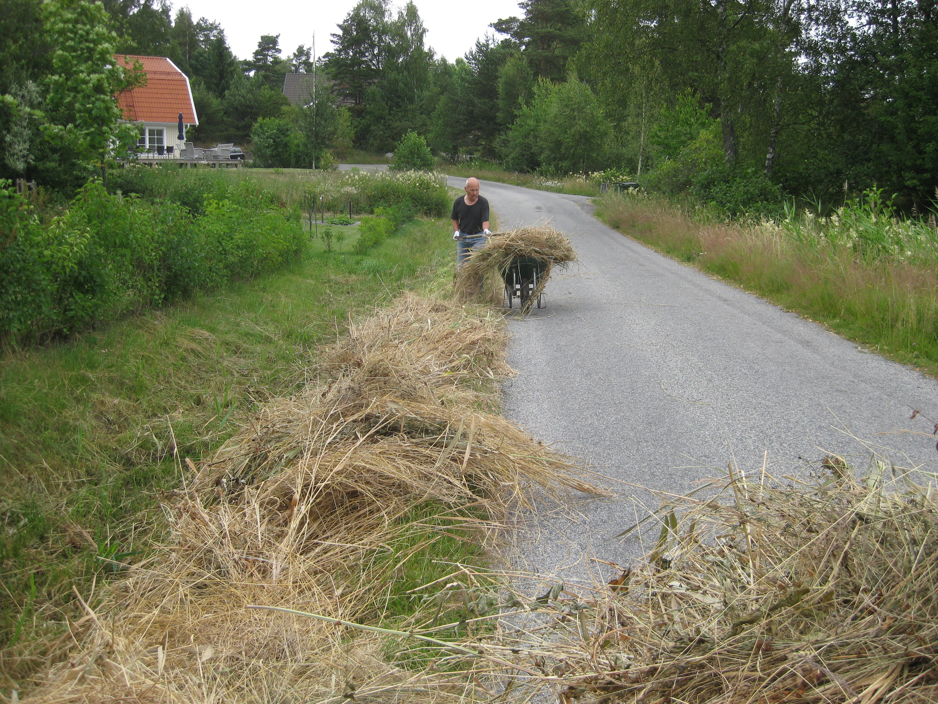 Vi tar hand om vassen Håkan slagit i diket. Katarina planterar om körsbärstomater och ”möblerar om” i växthuset. Och vi äter den första egna potatisen för året.