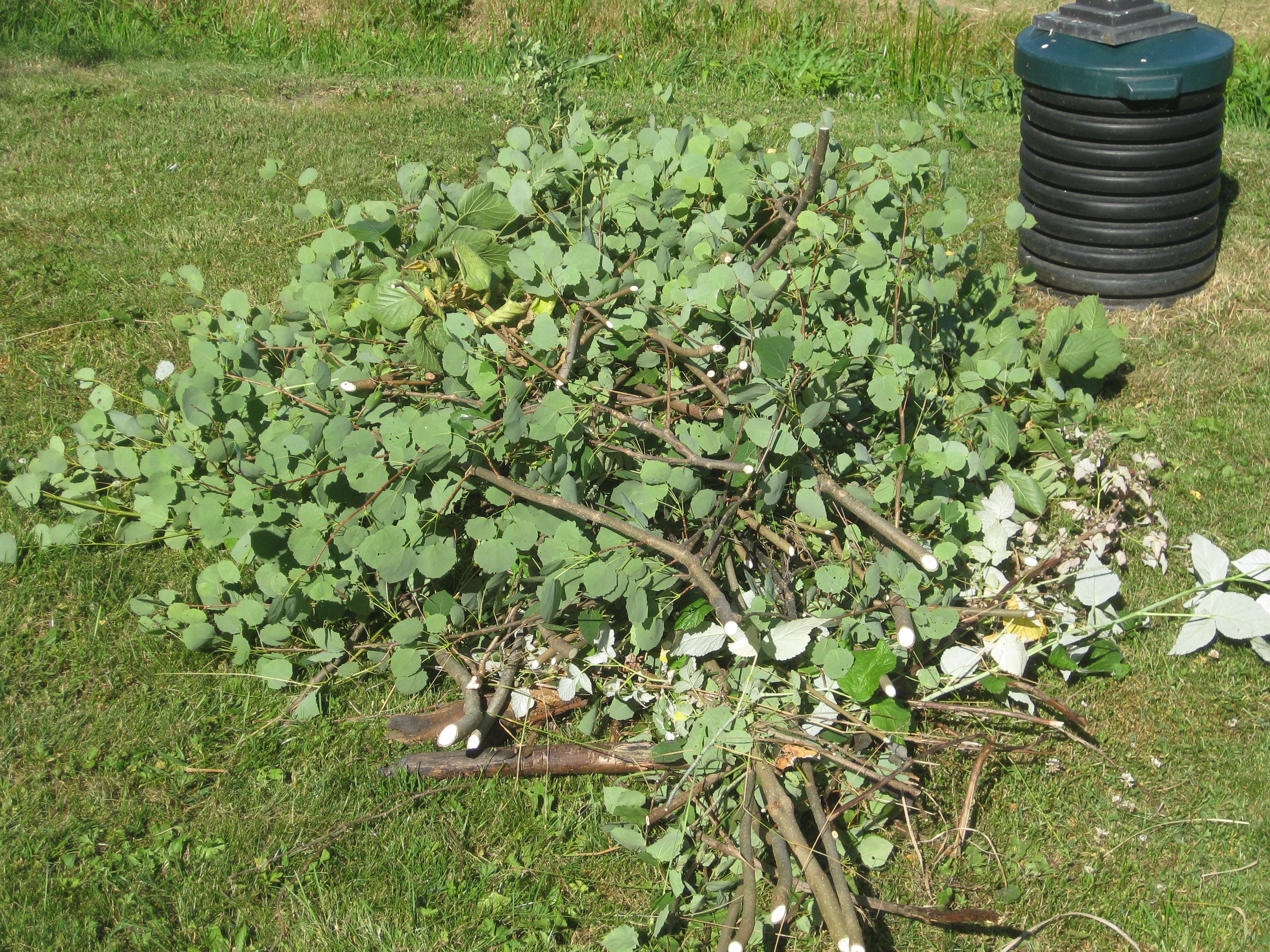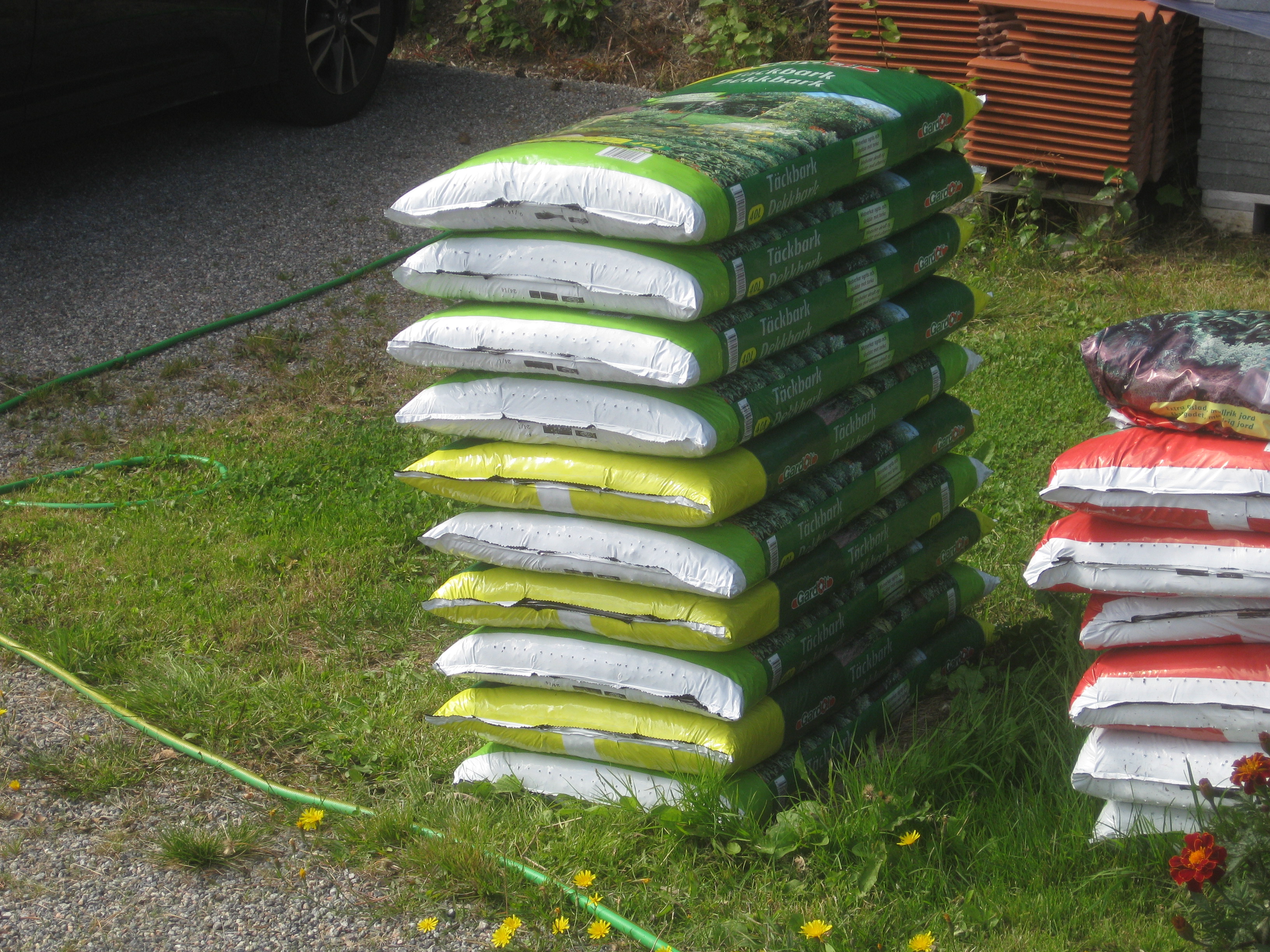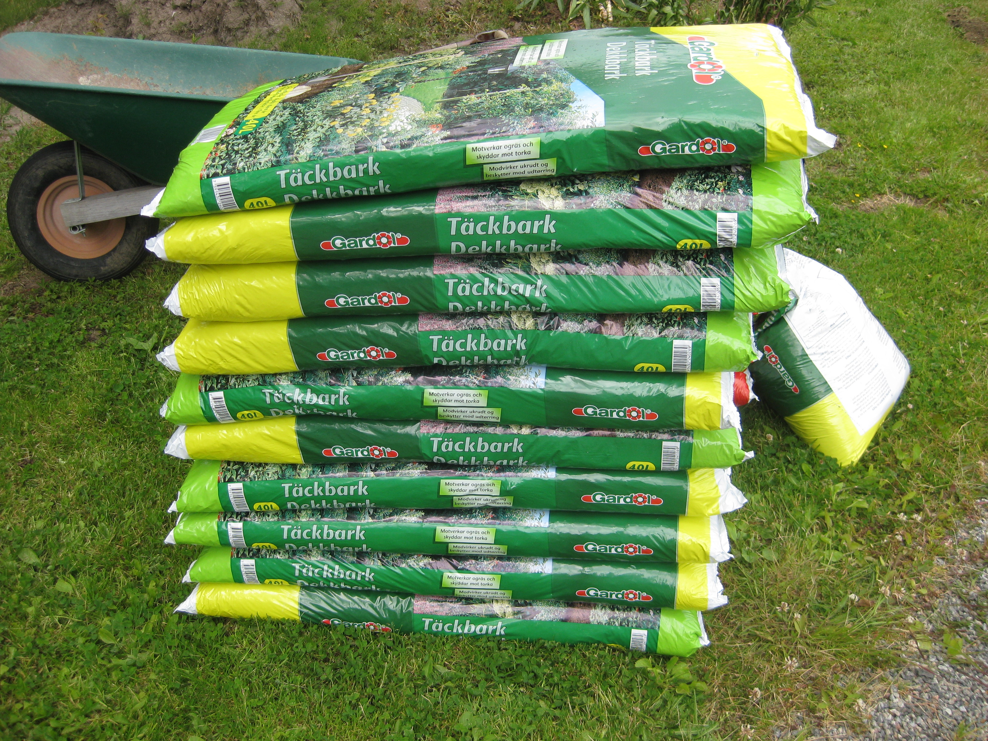 Brysselkålen har varit utsatta för värsta larvangreppet, vi har sprutat och så får vi se om det hjälper. Håkan har satt upp en spaljé till Händel, gurkmelonen har tagit ordentlig fart, och så har vi inhandlat mera täckbark – jag vet inte hur många säckar det blivit hittills i år, men tycker att vi borde ha någon sorts rabatt vid det här laget!