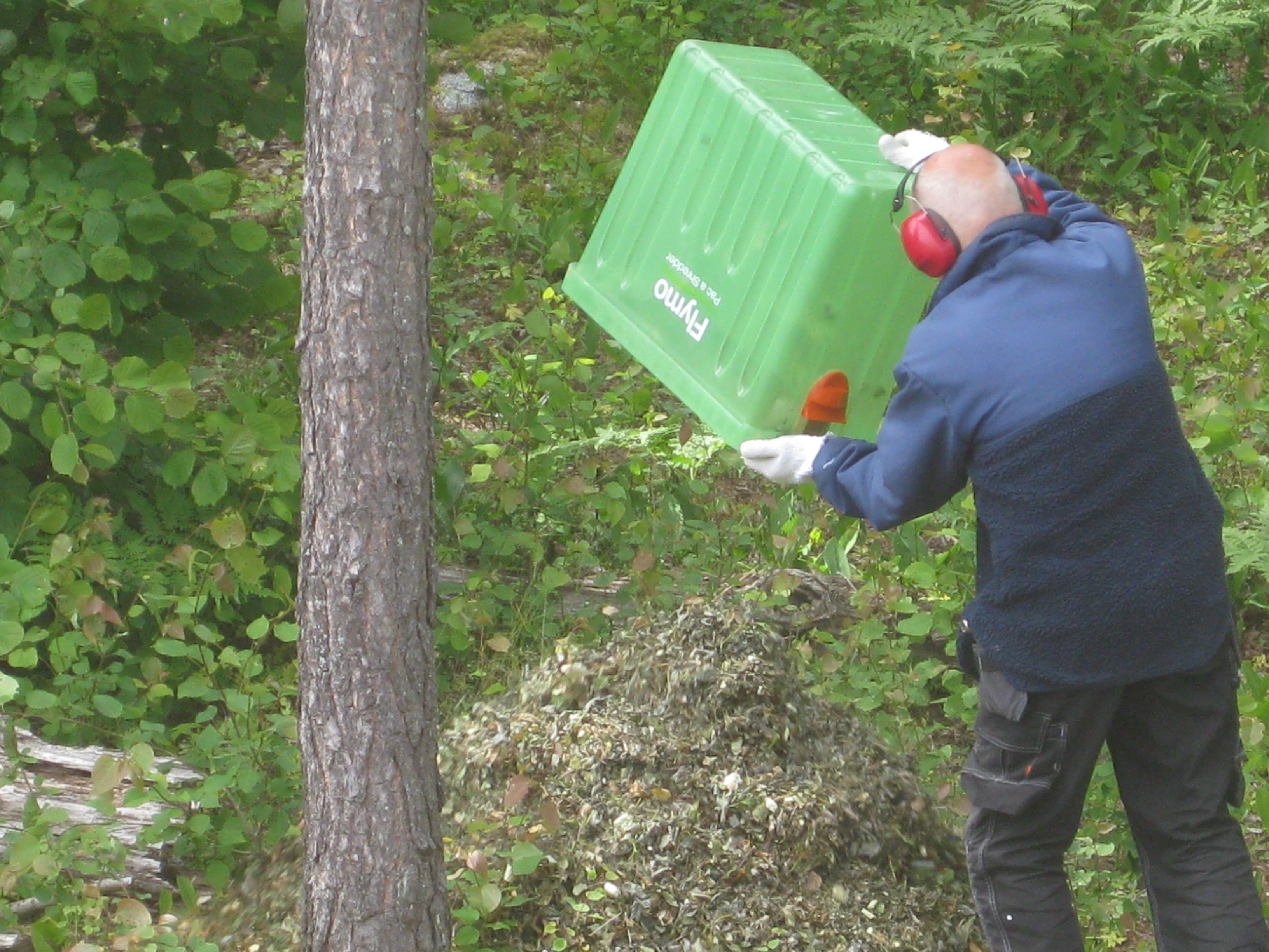 Vi kör mera täckbark till den senast planterade syrénhäcken. Katarina experimenterar med Fackelblomstren vid bäcken, och så kör vi mera jord och lägger bakom verkstaden, och jämnar till. Det går att klättra i pilen också – vilken tur! Och Håkans verkstadsprojekt gör framsteg!