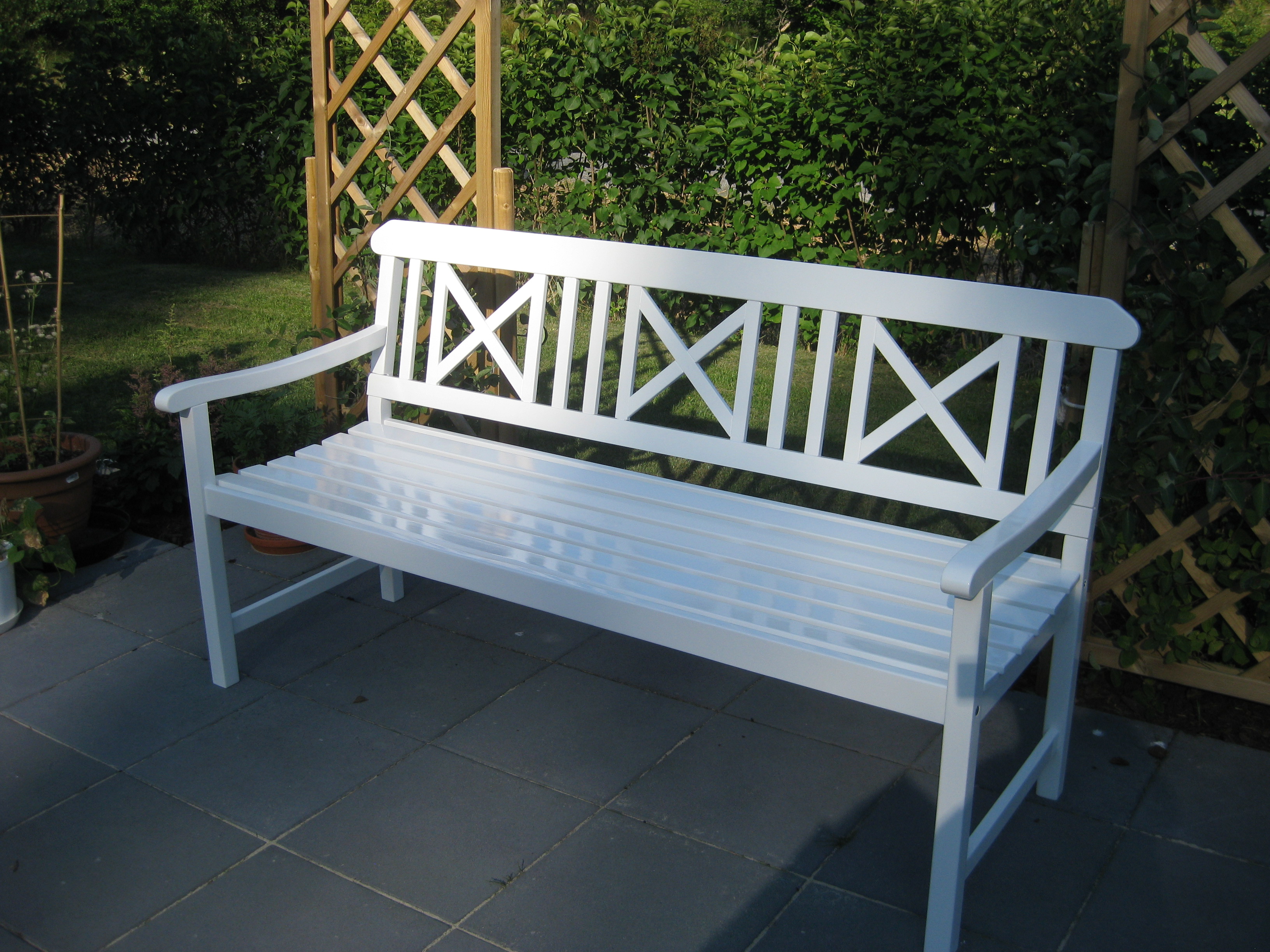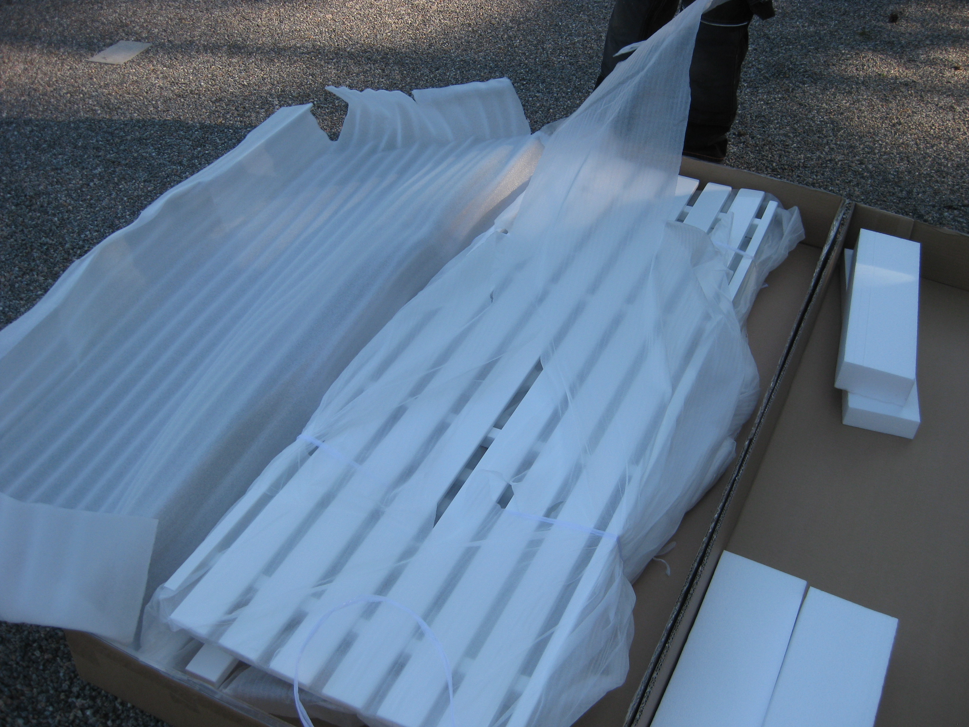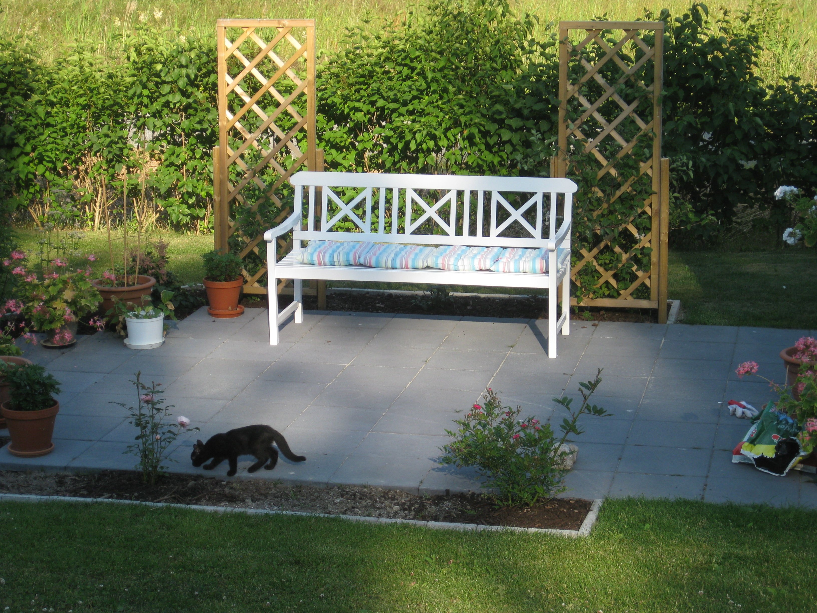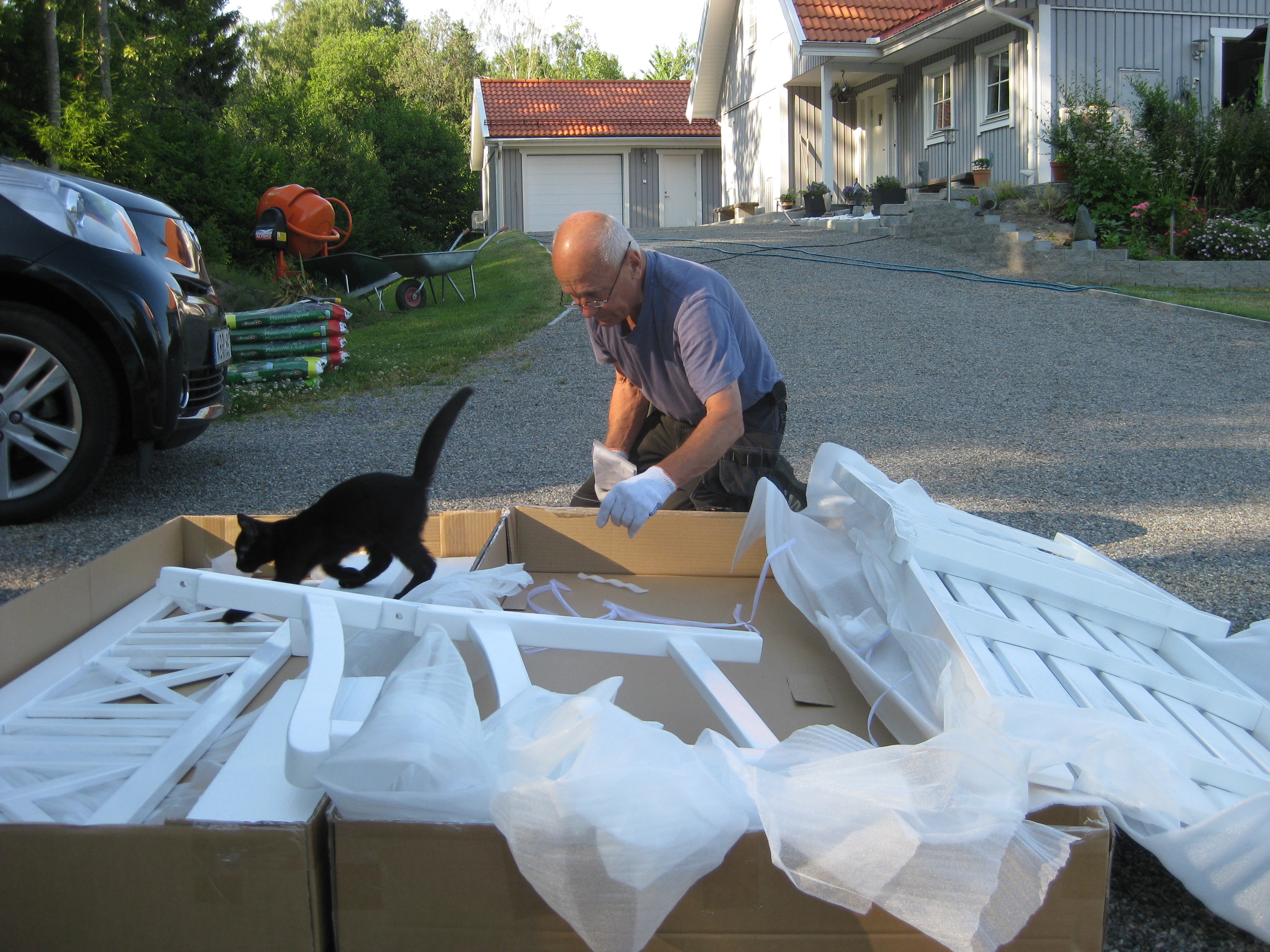 Första dagen vi släpper ut Moses på äventyr utanför huset… Lite nervöst är det. Kombinationen av att vara väldigt liten och mycket nyfiken är väl inte den optimala, men det går ganska bra. Floxen har slagit ut. På eftermiddagen sätter vi oss i bilen där temperaturen går att reglera till behaglig nivå, och ger oss ut på shoppingtur. Vi kommer hem med ett platt paket som vi packar upp, och med några få skruvtag har vi fått en väldigt fin soffa! 🙂 Ingen champagne-invigning idag, men vi sitter där en stund sedan solen sänkt sig bakom trädtopparna, och betraktar vår ännu något ofullständiga rosenrabatt….