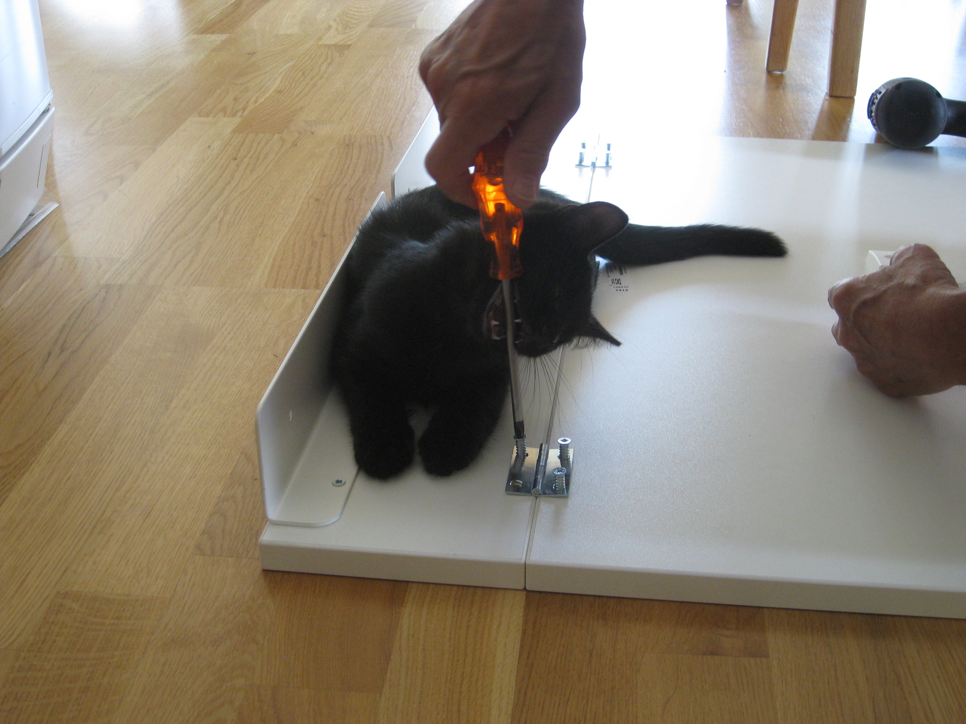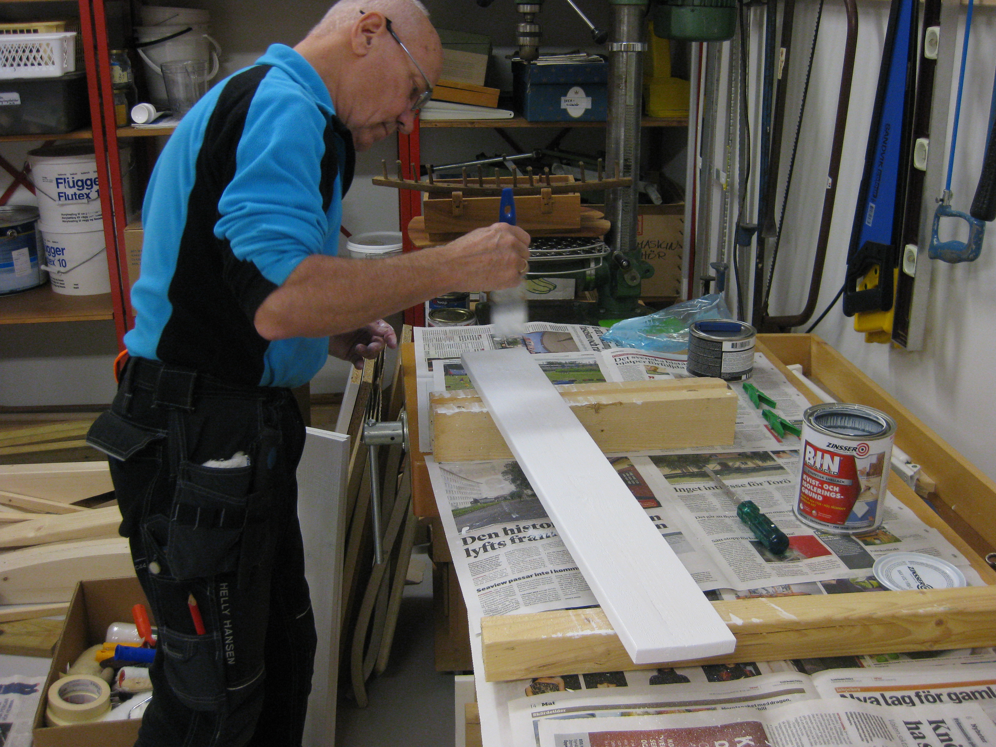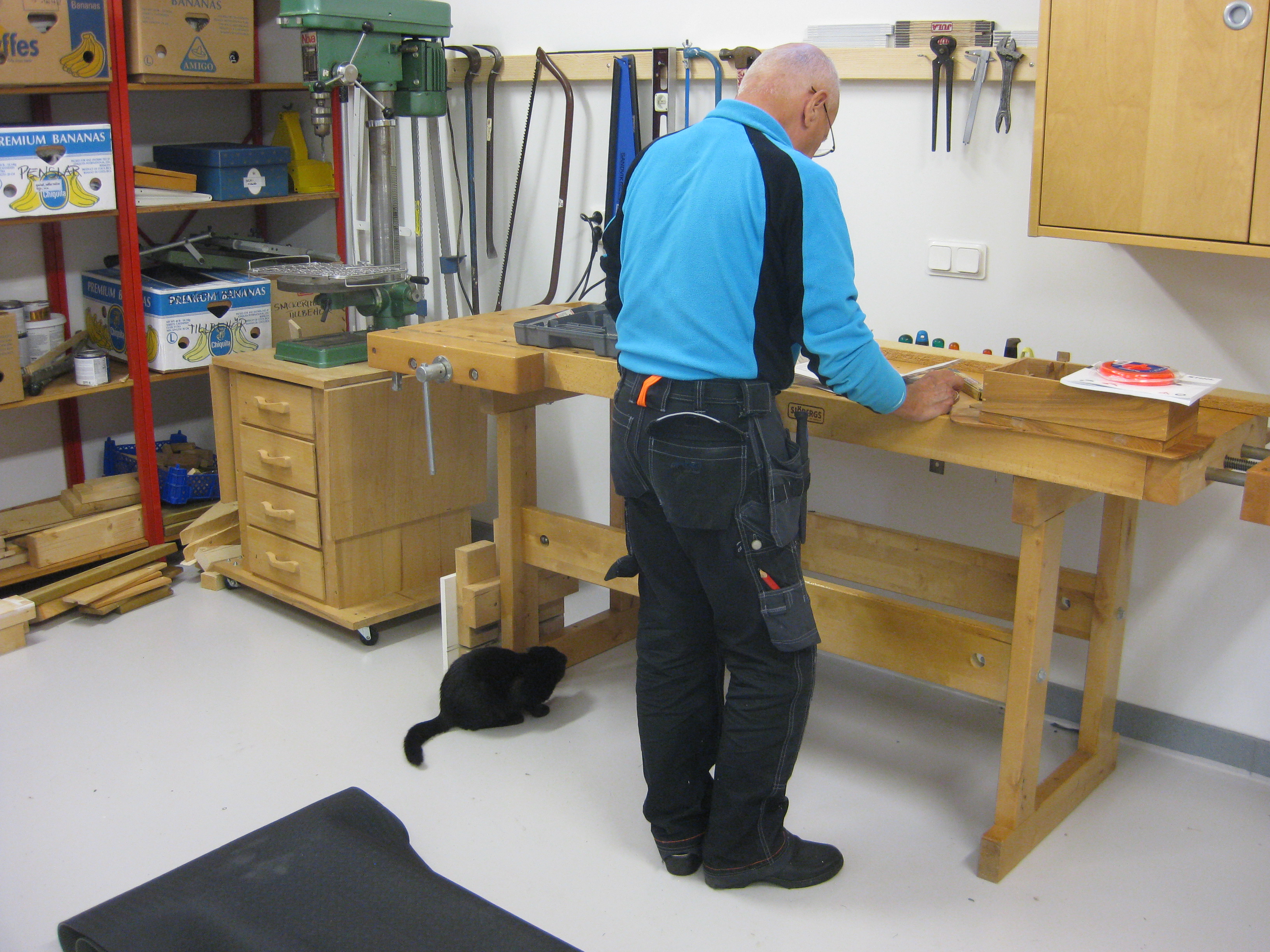 Hm. Moses hittar de mest dumma ställen att gömma sig på… Men herrn i verkstaden låter oss förstå vad det ska bli, det som han håller på med. Nu ska vi bara försöka komma överens om vilken färg det ska vara på den – som vanligt har vi olika uppfattningar om vad som passar bäst.