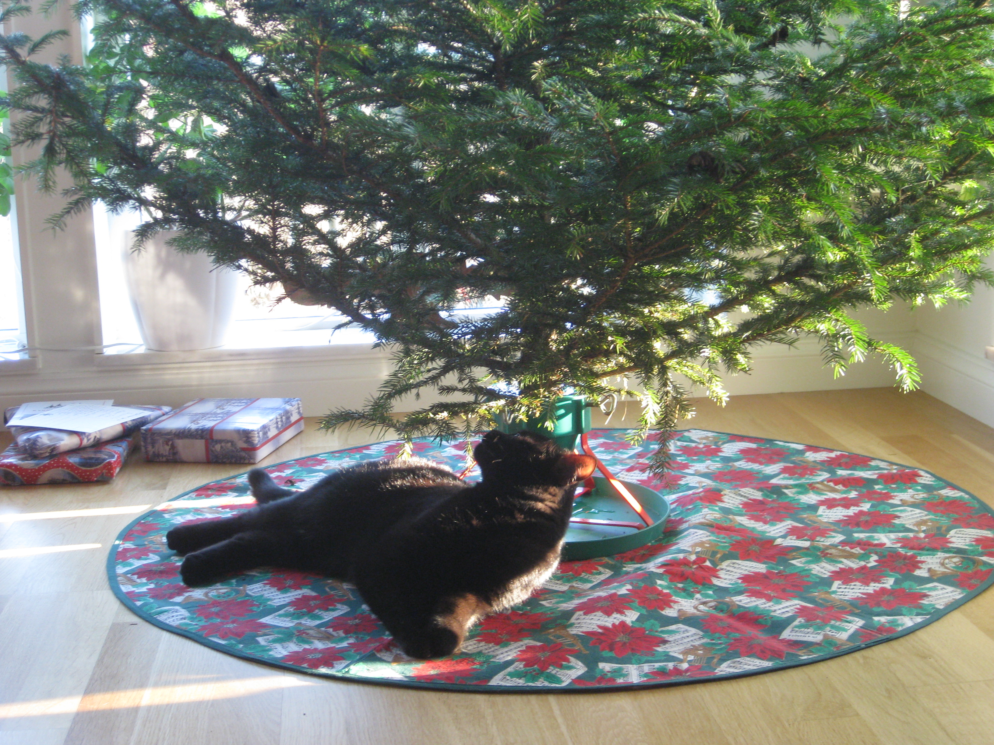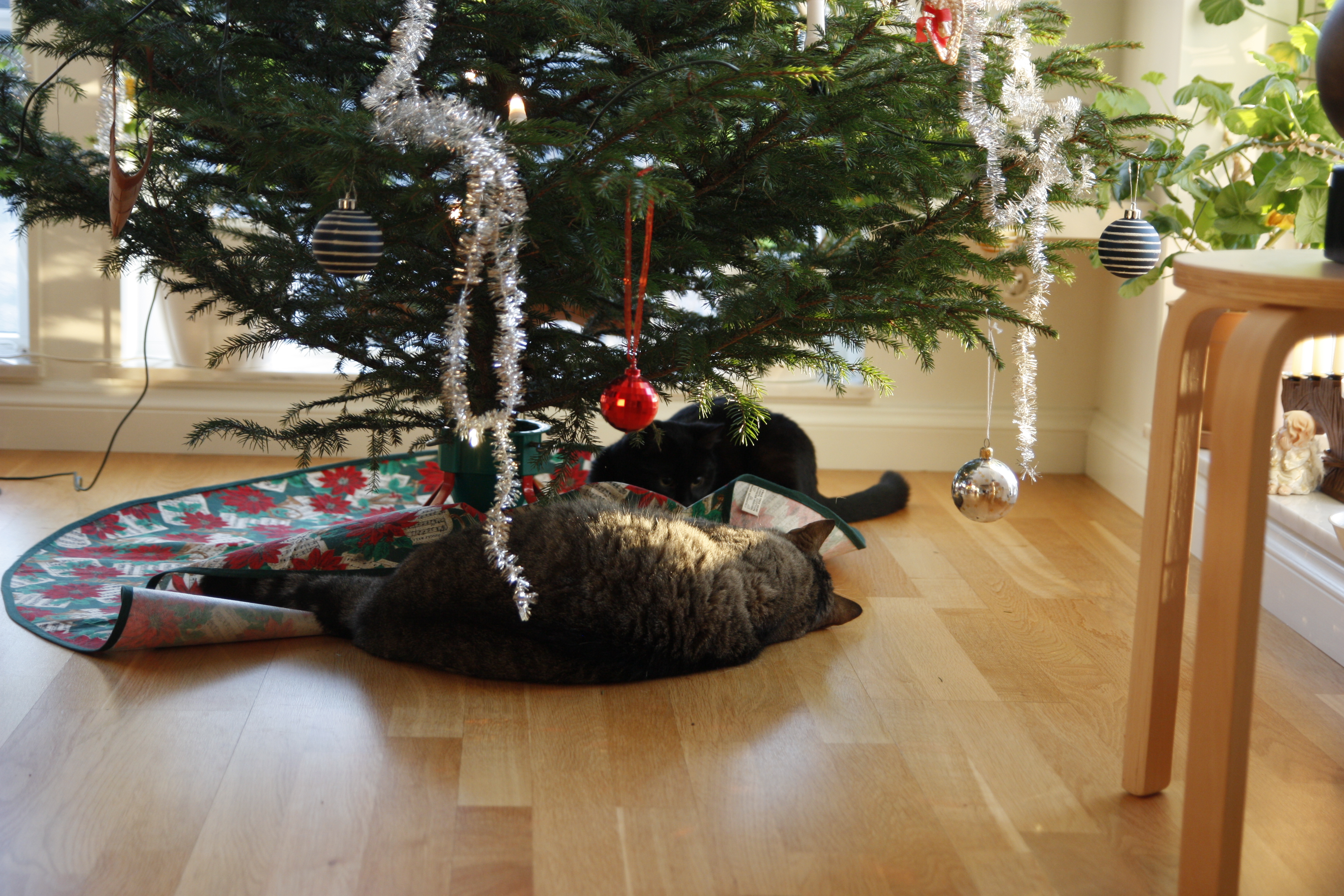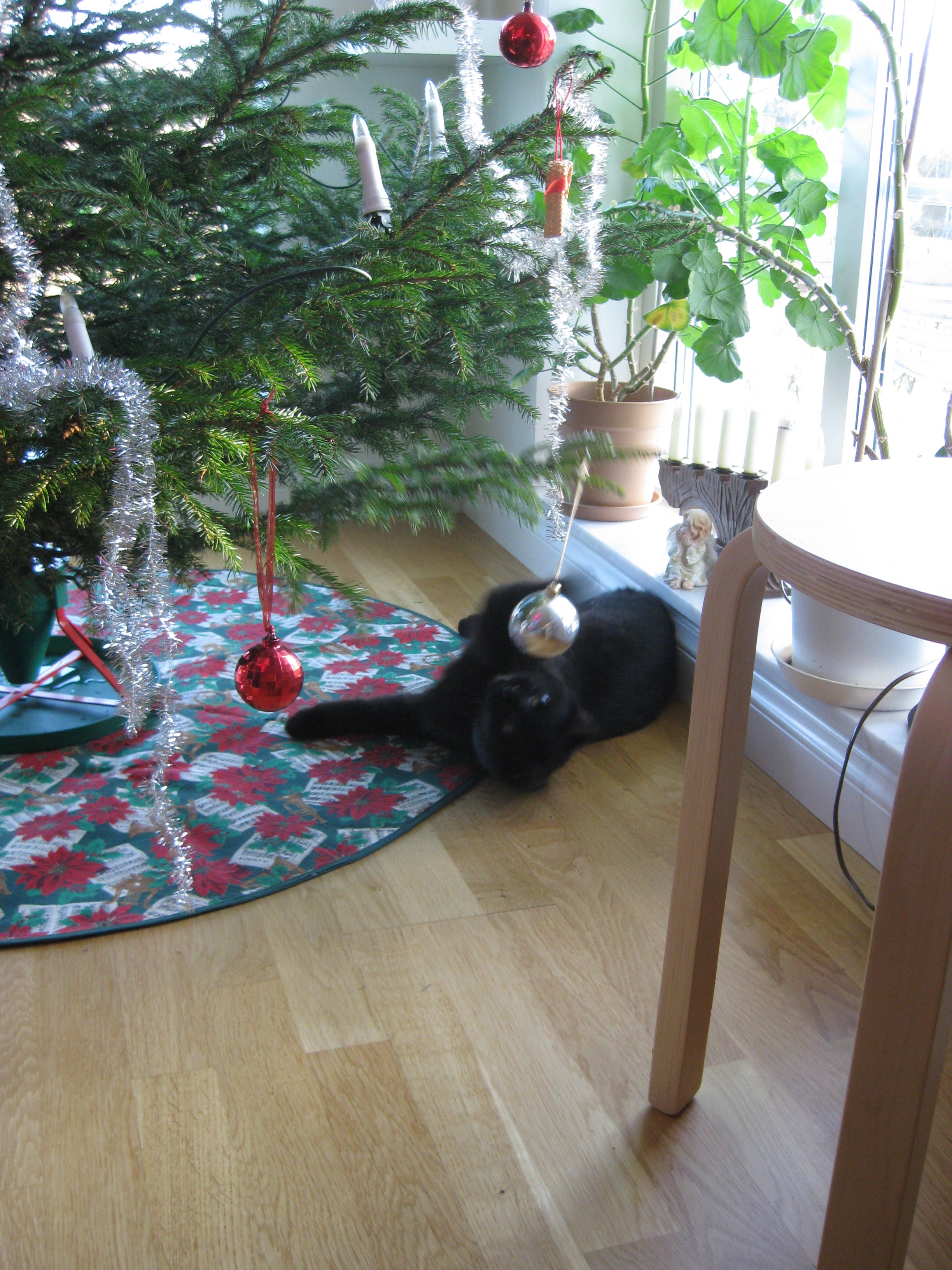 Förberedelser inför en ledig julhelg… Ska vi ha gran i år, när vi har kattunge? Ok, vi skaffar en gran och tar in. Vi klär granen, pyntar och pysslar, bakar, städar, lagar mat. Och allt är frid och fröjd fram tills julaftonsmorgonen, då vi väcks av dunder och brak, för att upptäcka att en liten Moses troligen försökt klättra i granen, och den ligger prydligt utsträckt på golvet simmandes i vatten och trasiga kulor… 😀
