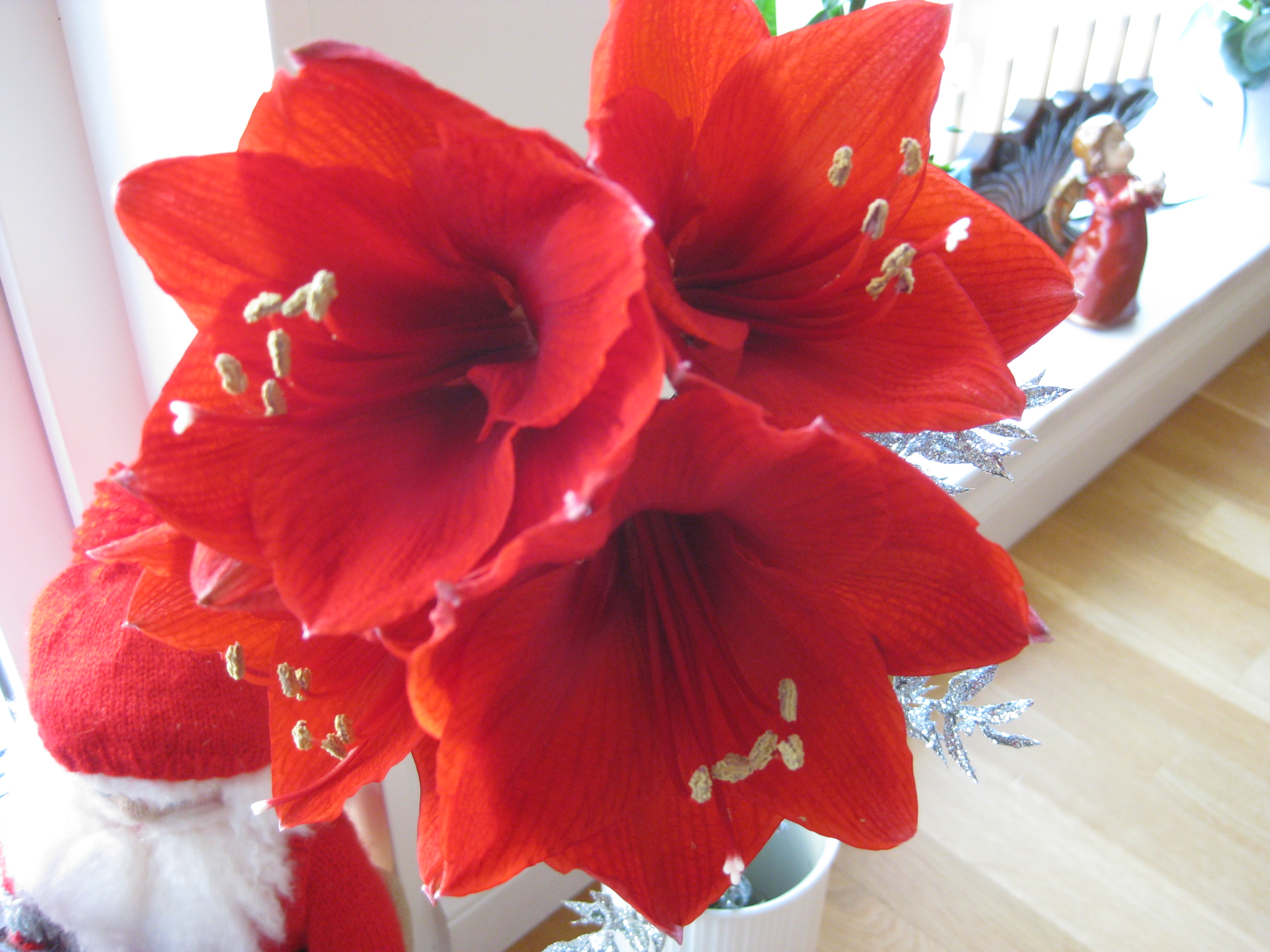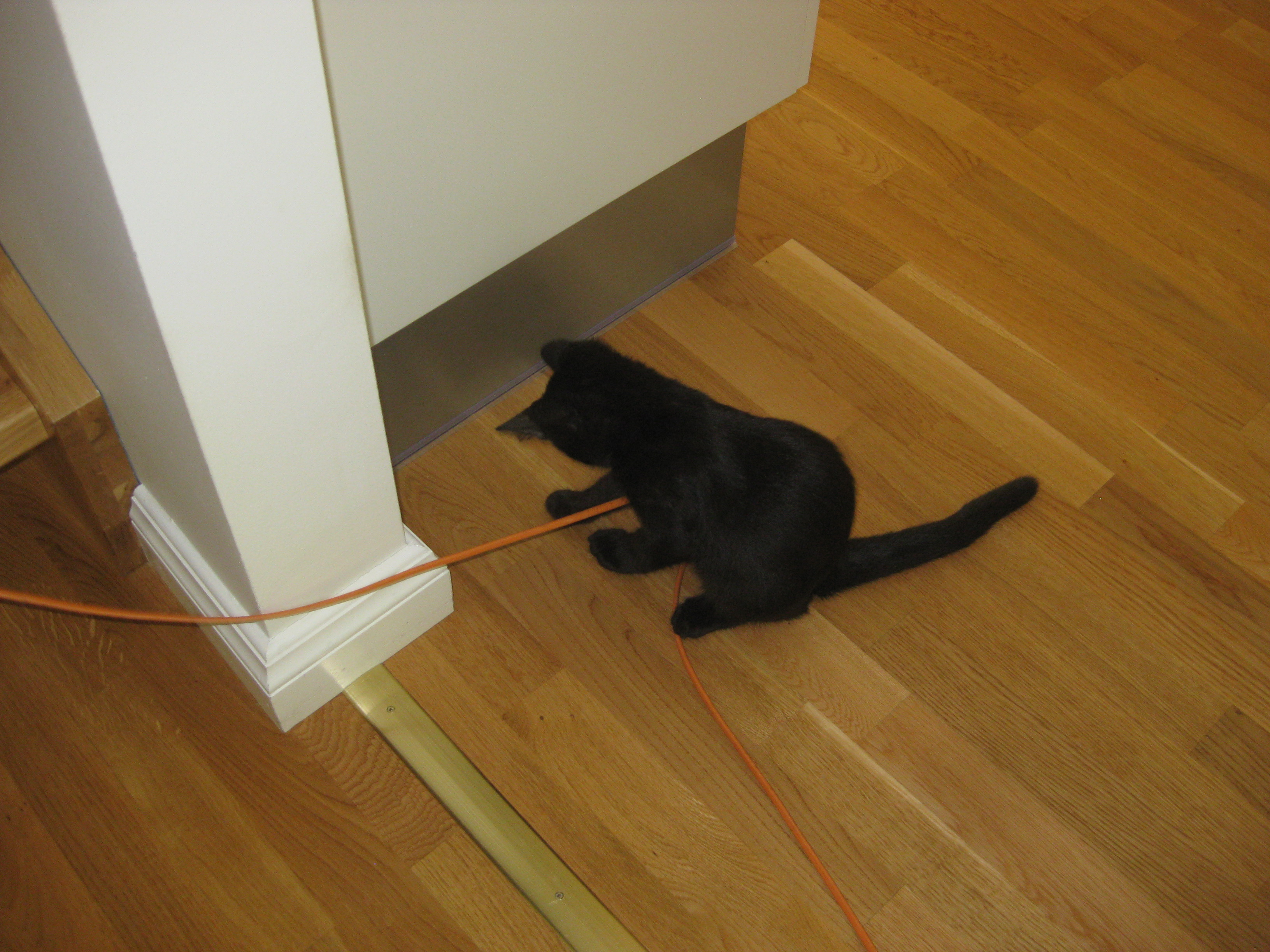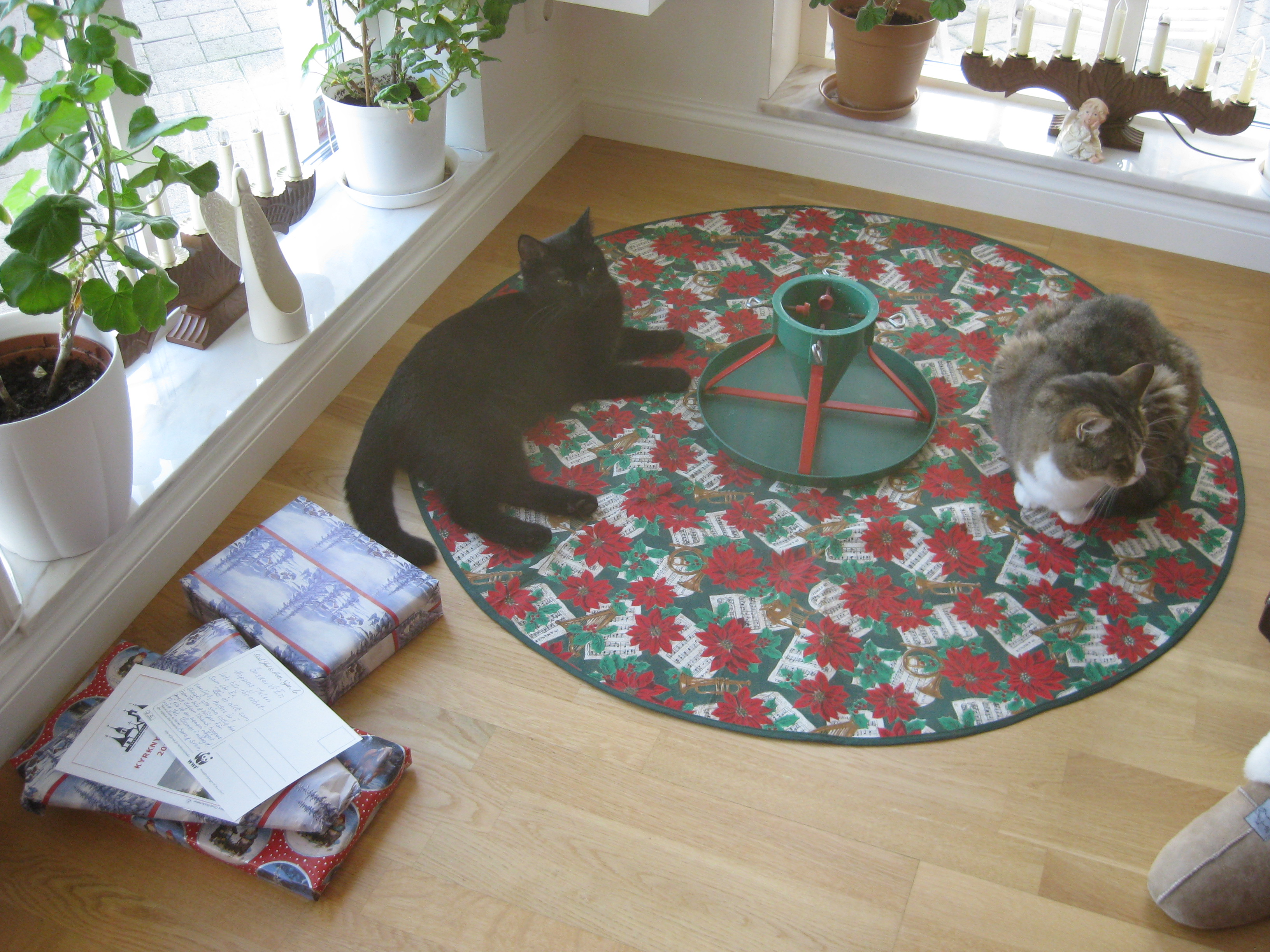 Förberedelser inför en ledig julhelg… Ska vi ha gran i år, när vi har kattunge? Ok, vi skaffar en gran och tar in. Vi klär granen, pyntar och pysslar, bakar, städar, lagar mat. Och allt är frid och fröjd fram tills julaftonsmorgonen, då vi väcks av dunder och brak, för att upptäcka att en liten Moses troligen försökt klättra i granen, och den ligger prydligt utsträckt på golvet simmandes i vatten och trasiga kulor… 😀