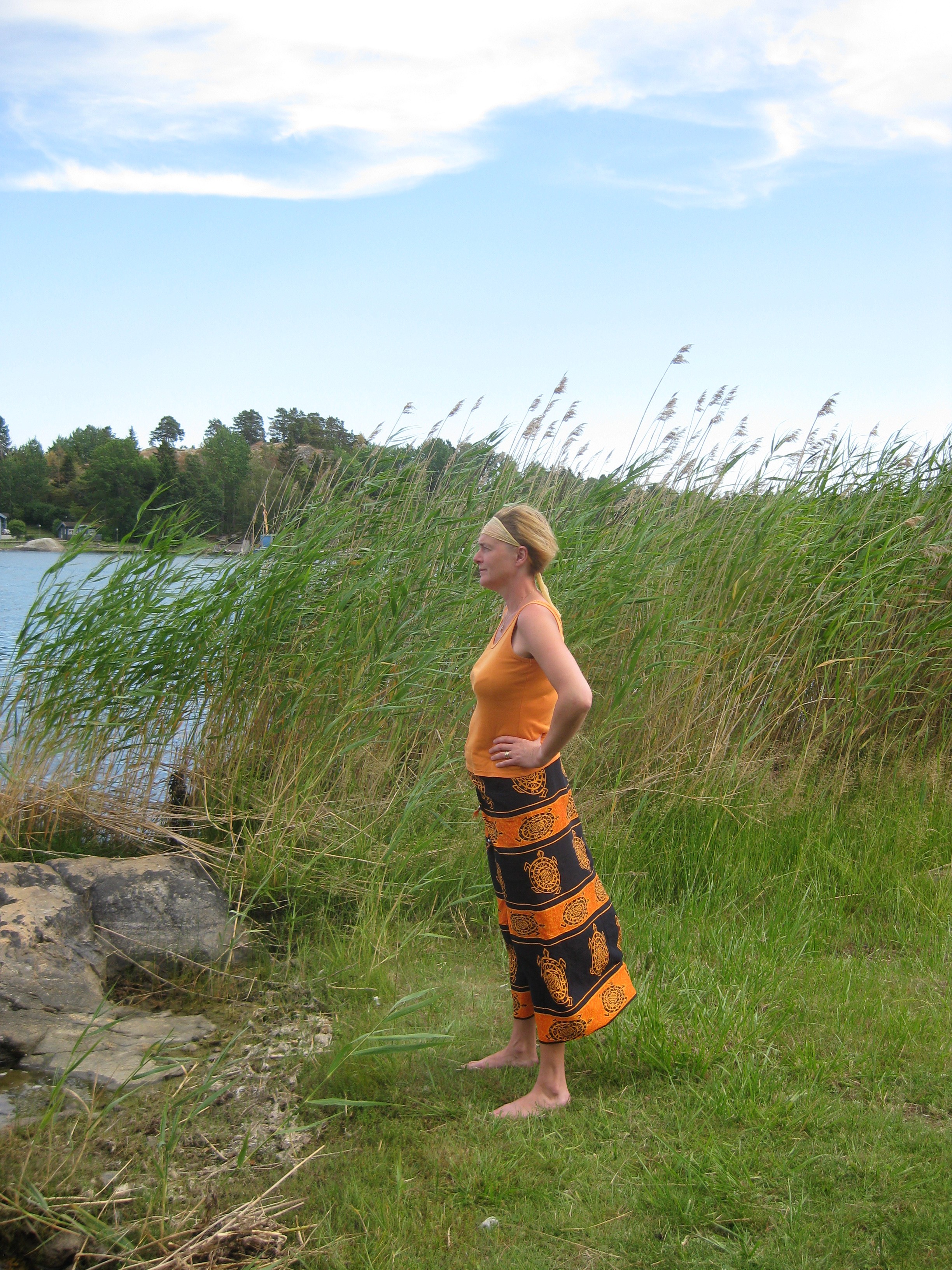 Vi tvättar. Moses tittar intresserat på. Vi noterar vi får hallon på busken i år, och att det är tid att plocka dessa. Vi pysslar med lite av varje, och mot kvällen blir det dags för årets första dopp.