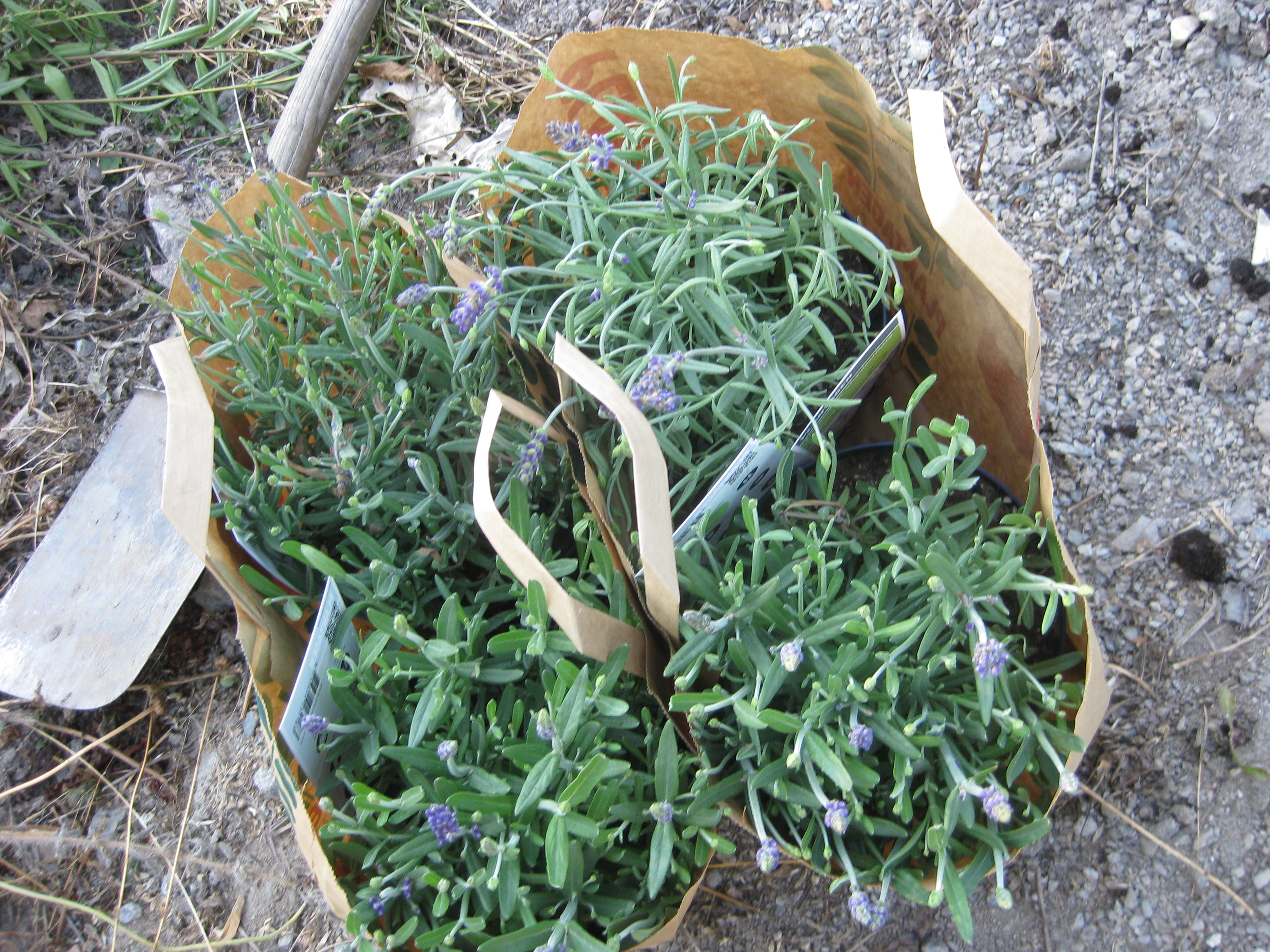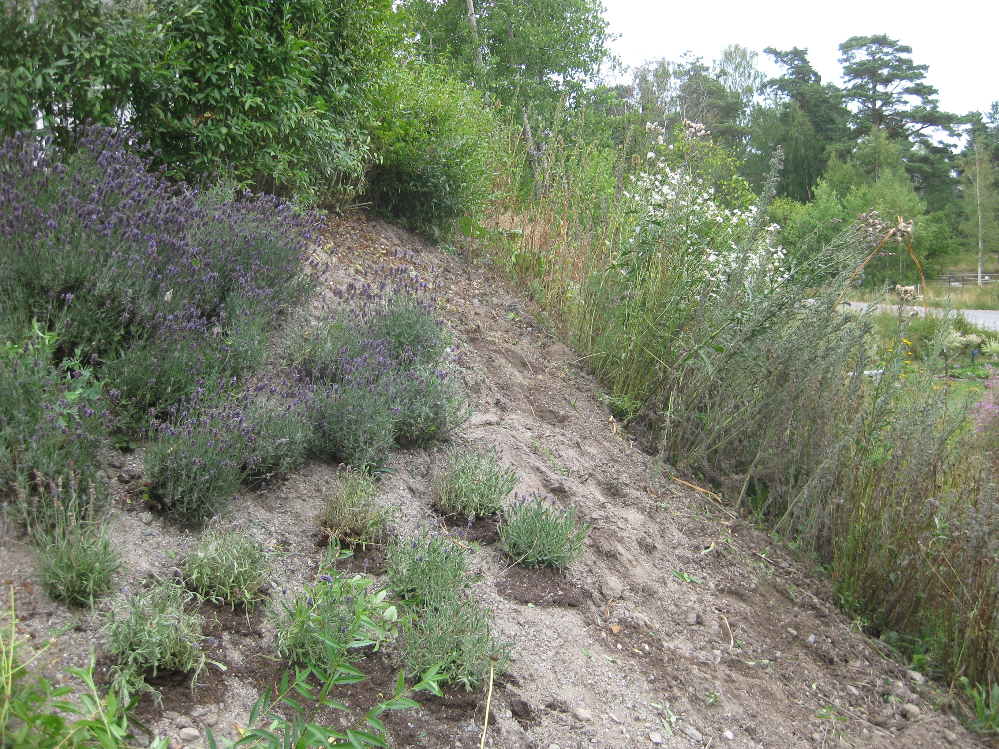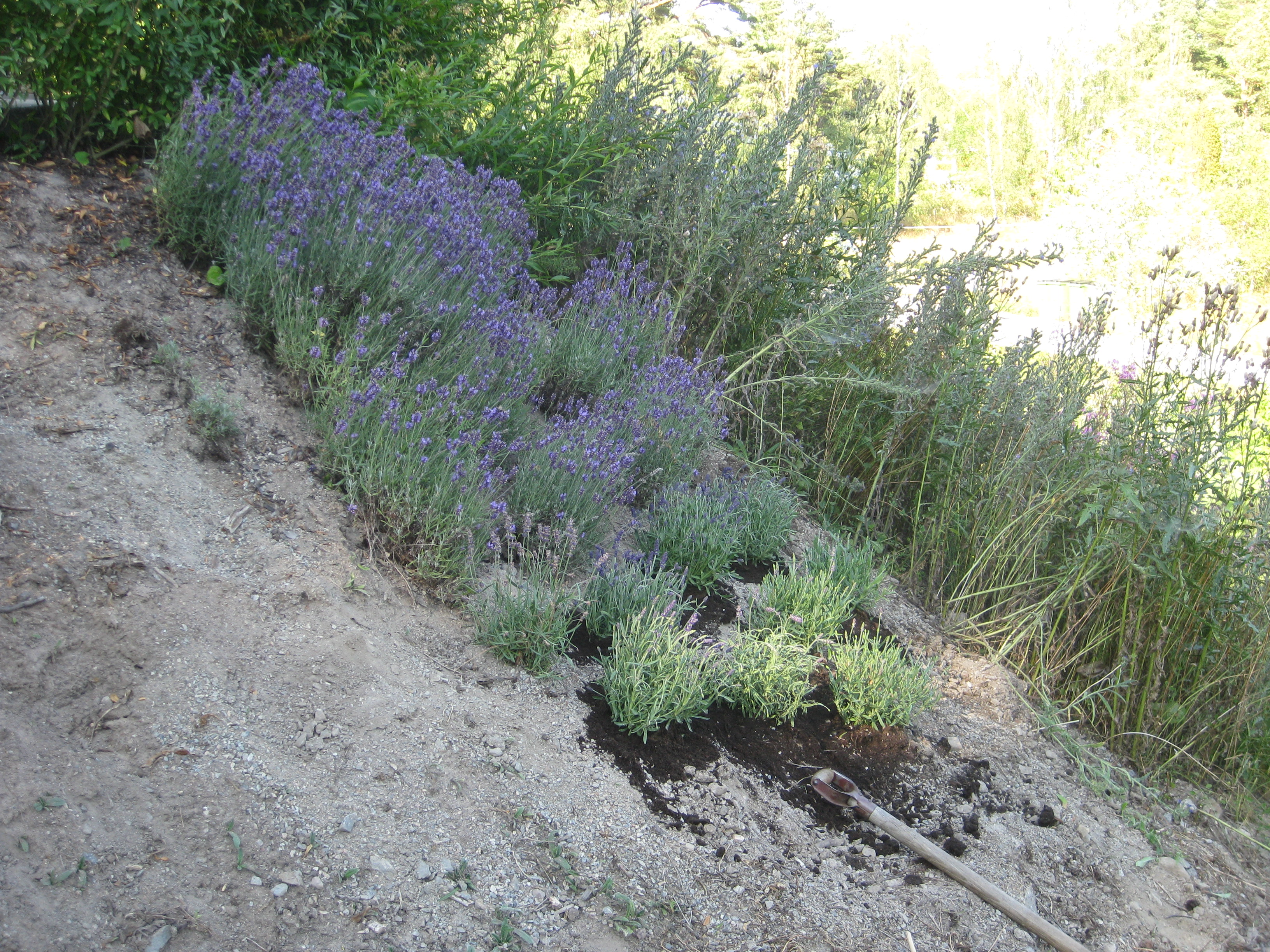 Äntligen! Beställningen som vi gjorde i början på juni, som skulle levereras inom ett par veckor, har äntligen anlänt…. :-/ Levande växter står det på paketet – det bådar ju gott… Häckpopplar, lavendel och ett par rosor åker ner i backen med en väldig fart. Det vattnas och pysslas om, och så hoppas vi på god tillväxt.