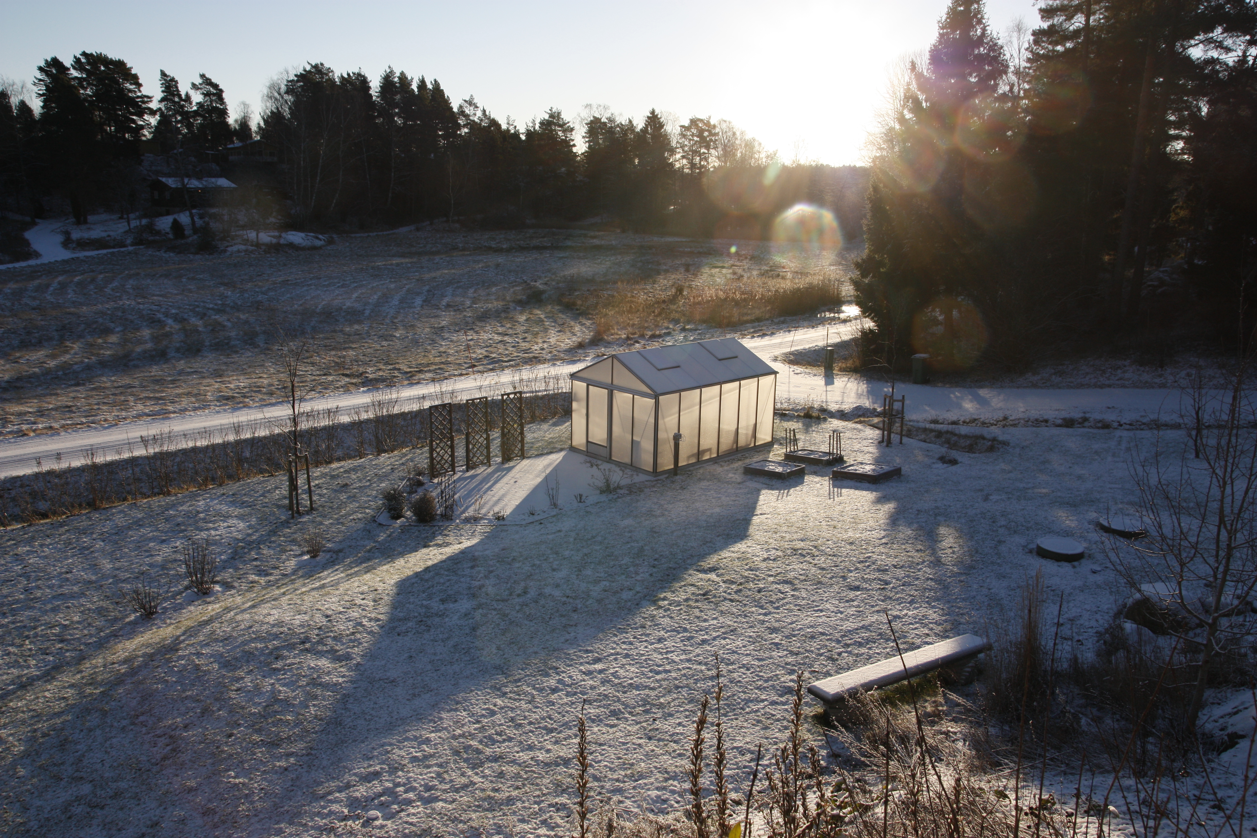 Äntligen lite sol! Den har verkligen lyst med sin frånvaro denna vinter. Och den tittar bara kortvarigt fram nu också. Men vi hinner njuta en kopp kaffe i växthuset, och drömma om årets odlingar. Vi konstaterar att det återigen behöver fyllas på med mera sättsand – vart tar den vägen?
