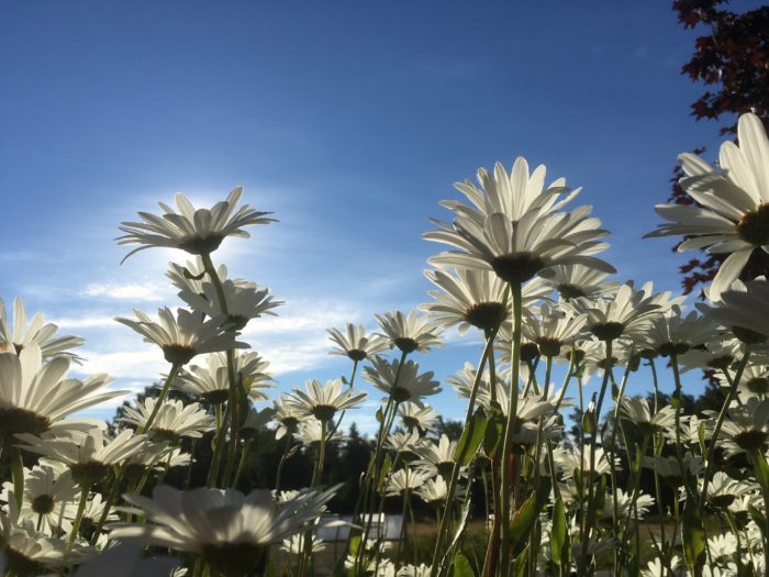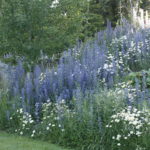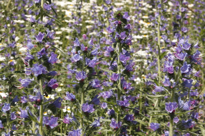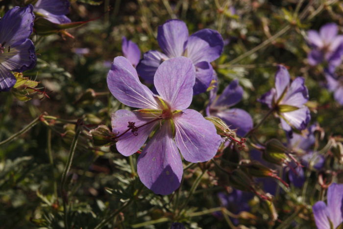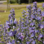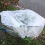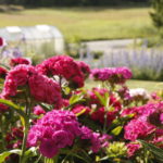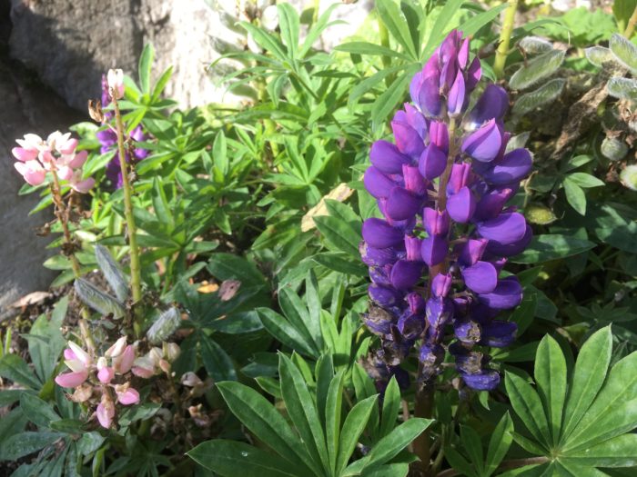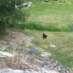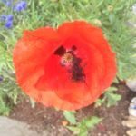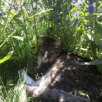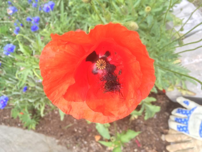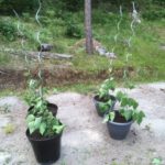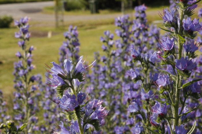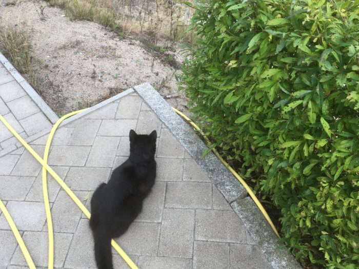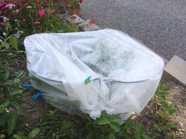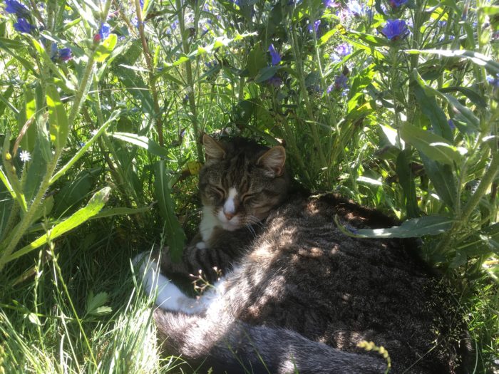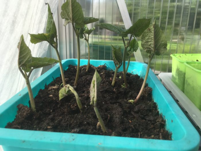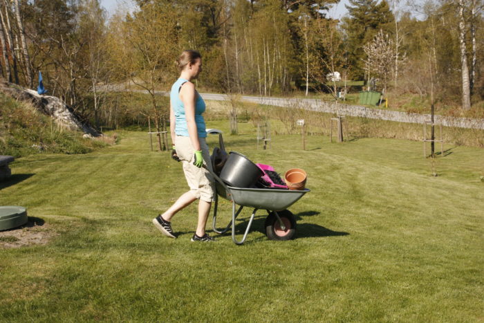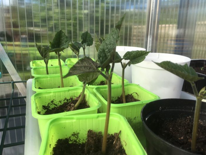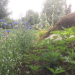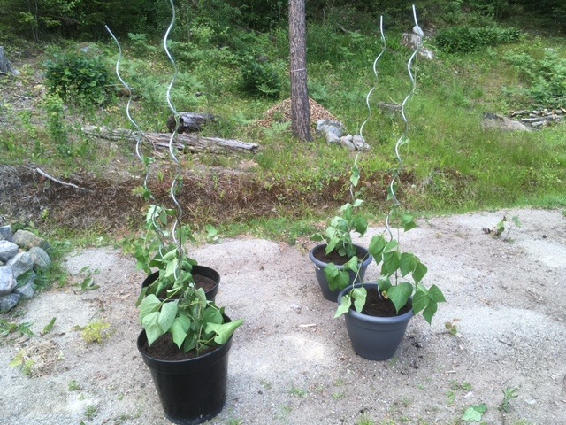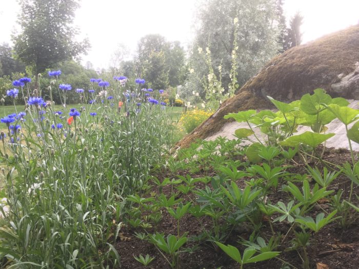 Vi klär in jordgubbsplantorna, då jordgubbarna blivit ätna på. I år drunknar vi i blomsterbönor, och några får flytta från växthuset ut i stora krukor. Muren vid ”hängmattehörnet” är klar, och vi fyller på med jord och planterar stockrosor, lupiner, blåklint och vallmo.