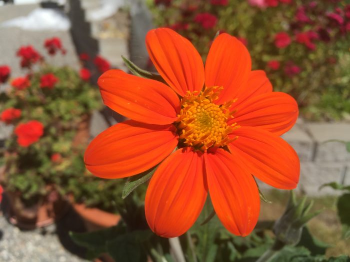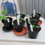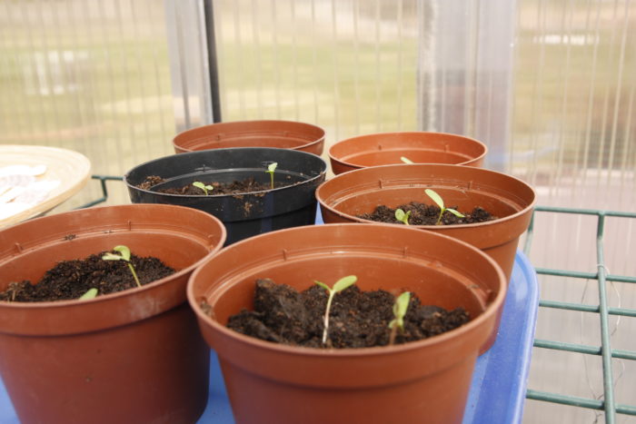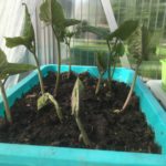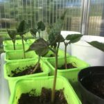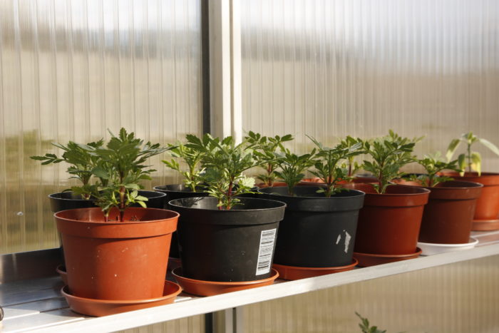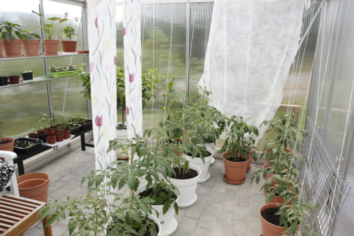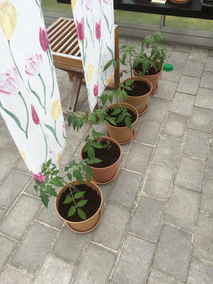 Tomaterna flyttades optimistiskt ut i växthuset i början på månaden, men fick snabbt flytta in igen när det blev frost. Nu provar vi igen, och har dessutom planerat om dem till större krukor. Dessutom blommar det nu lite varstans!