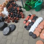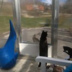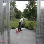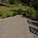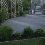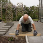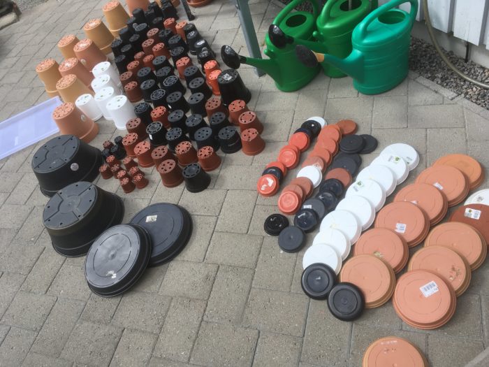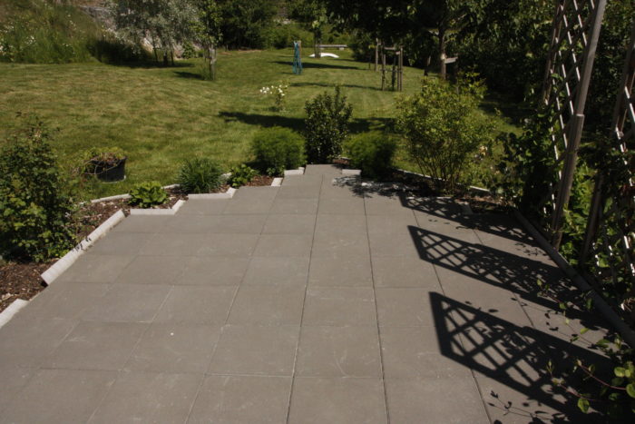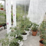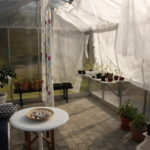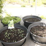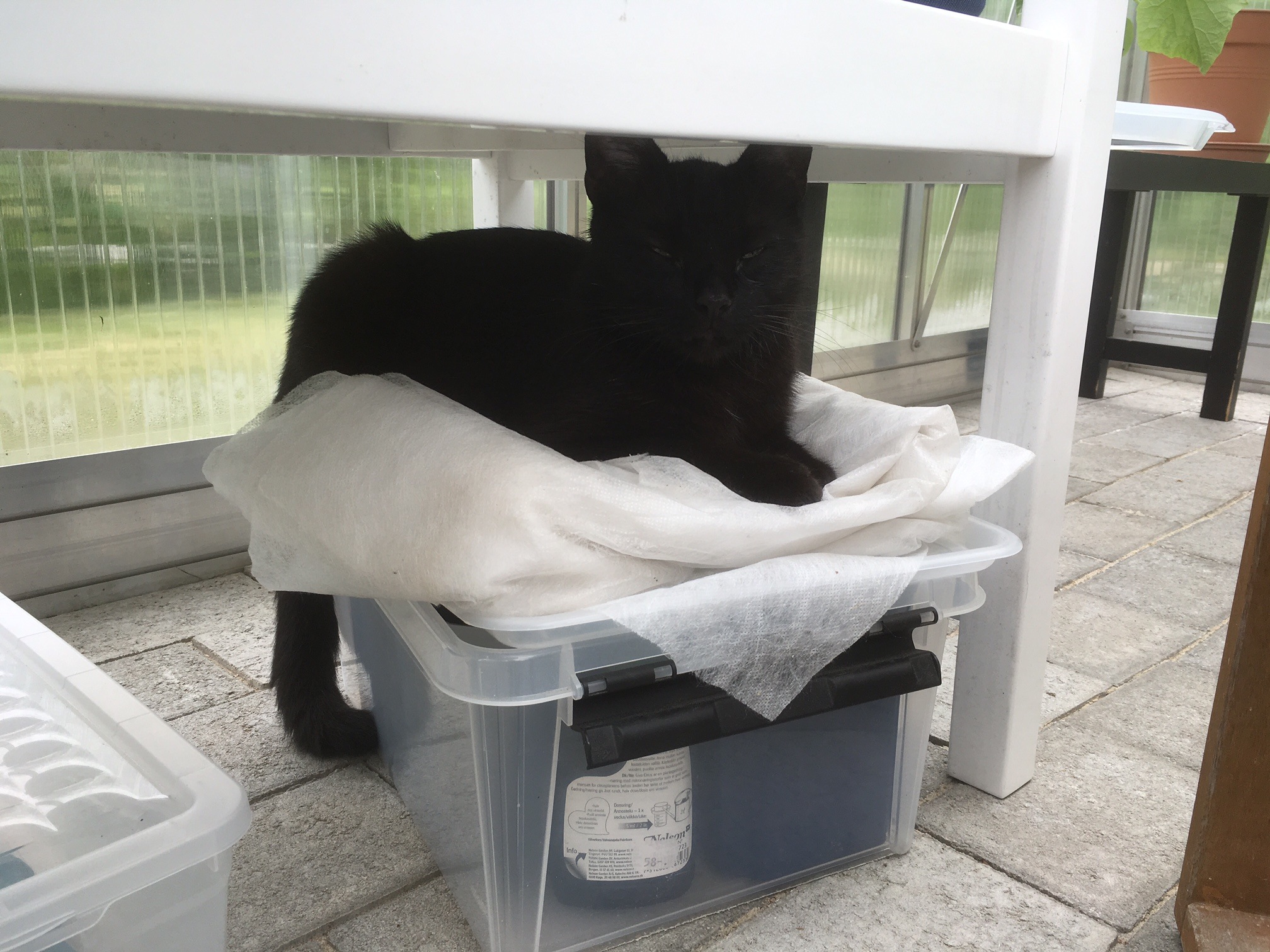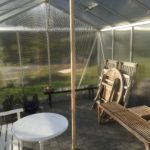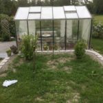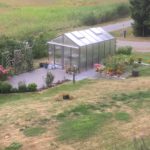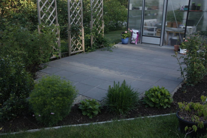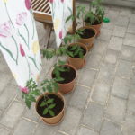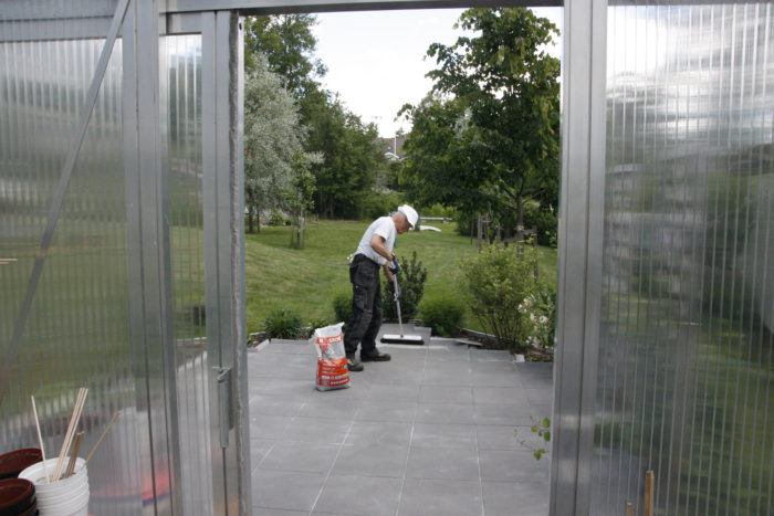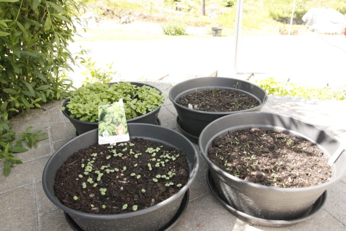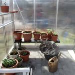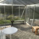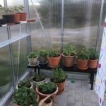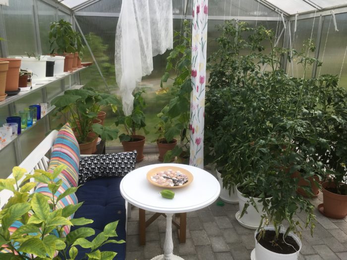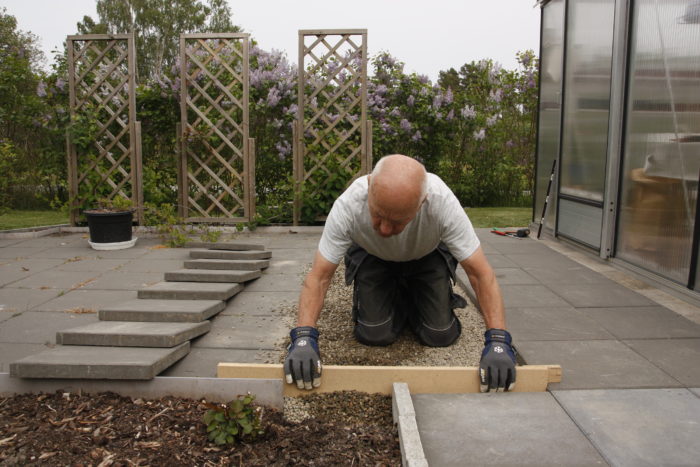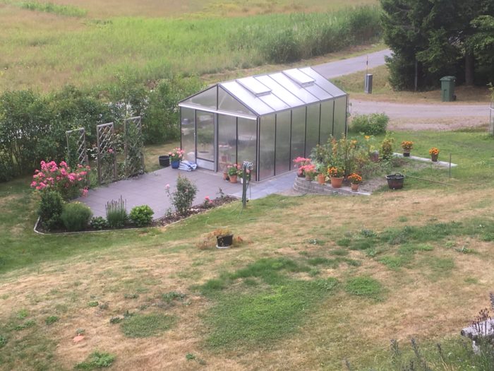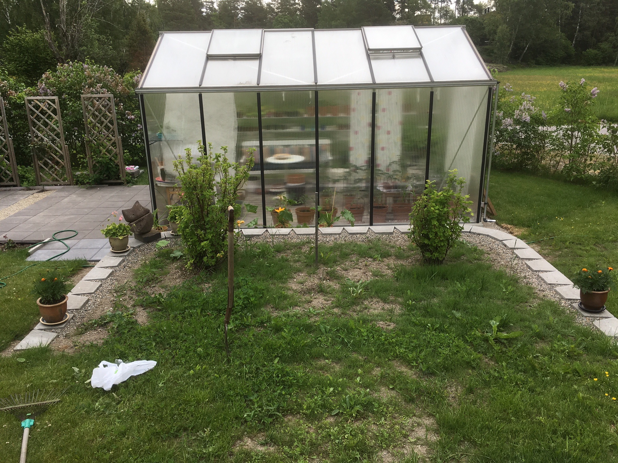 Alla tomater är nu omplanterade i större krukor. Håkan har gjort klart upphöjningen av stenläggningen vid växthuset, och borstar nu ner fogsand för att minimera ogräsväxandet… Lite kryddväxter får lämna värmen i växthuset för en behagligare temperatur på terrassen vid huset.