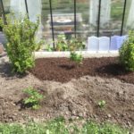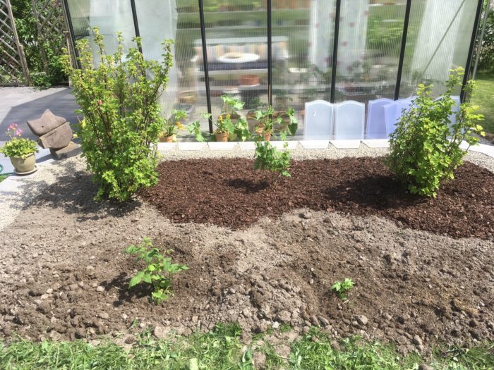 Dags att rensa runt vinbärsbuskarna! Bild på hur det såg ut före – och efter! De två röda vinbären har fått sällskap av en svart vinbärsbuske, och två nyinköpta hallonbuskar. Den gamla hallonbusken, som såg helt död ut, grävdes upp, och två skott försöker vi rädda.
