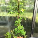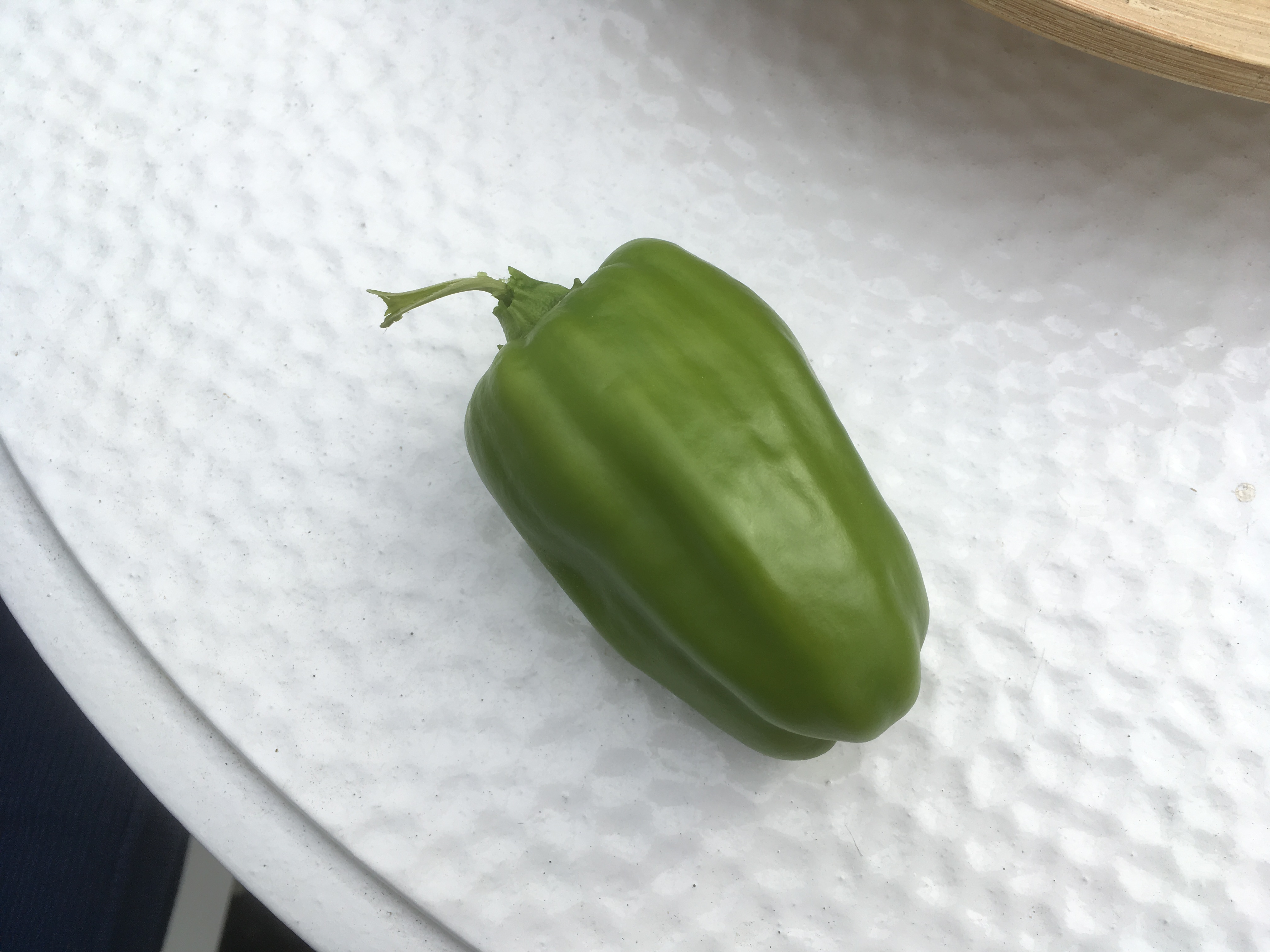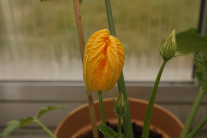 Inkakrage i full blom! Dags att tvätta krukor, då det mesta i växthuset flyttat till större krukor. En paprika är ”färdig” och musselsquashen, som är ny för i år, är på gång.