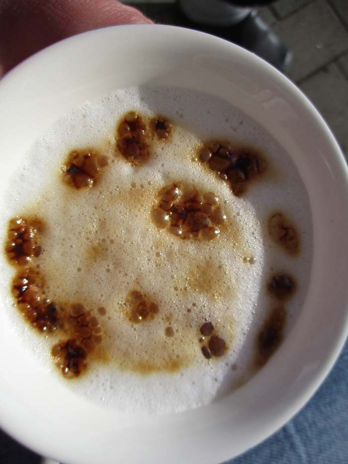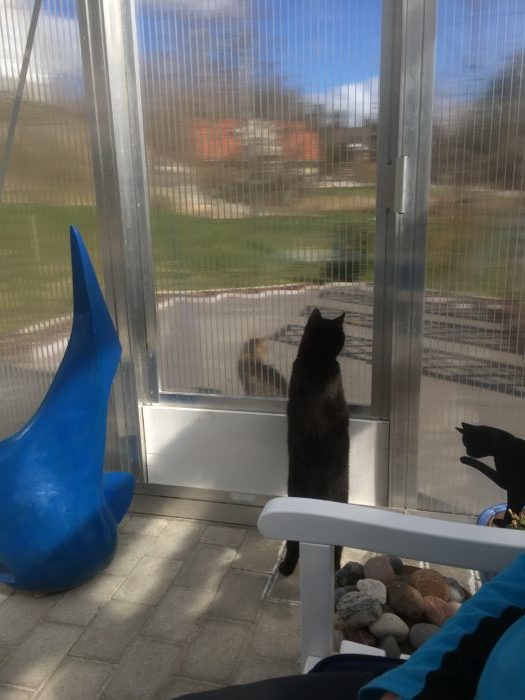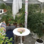 Förmiddagskaffe på terrassen! Något sticker upp ur krukorna i växthuset.