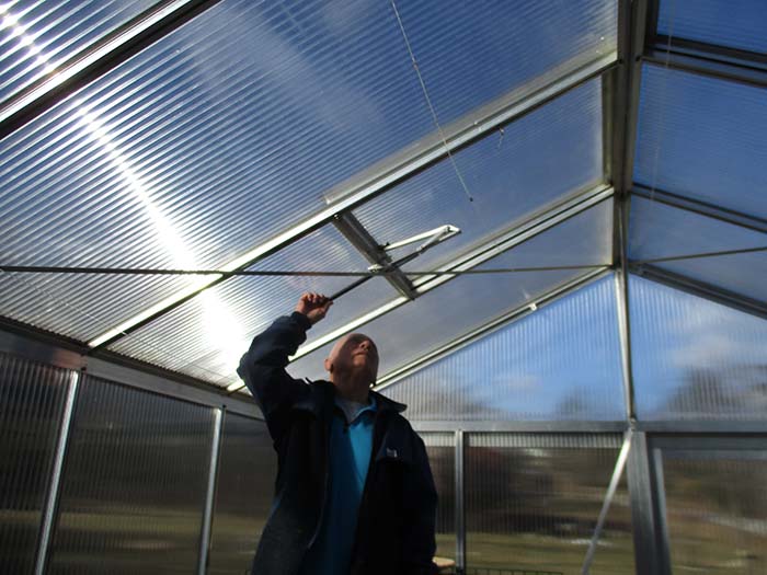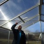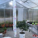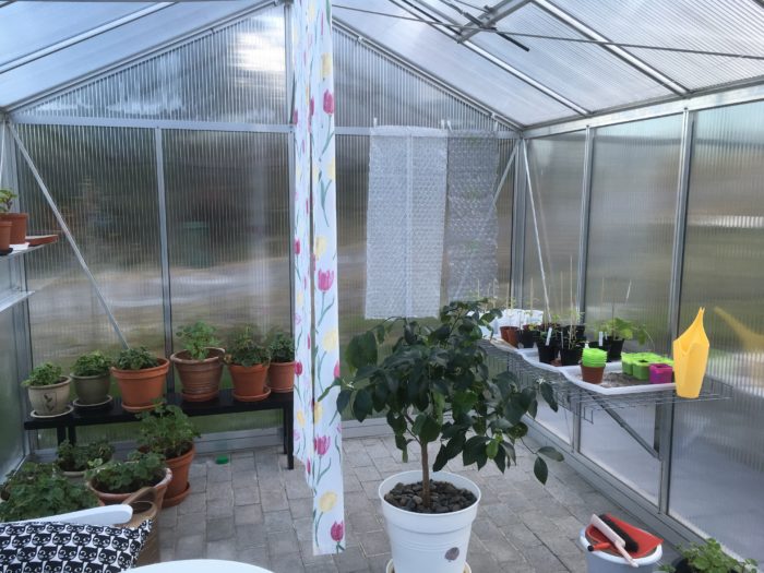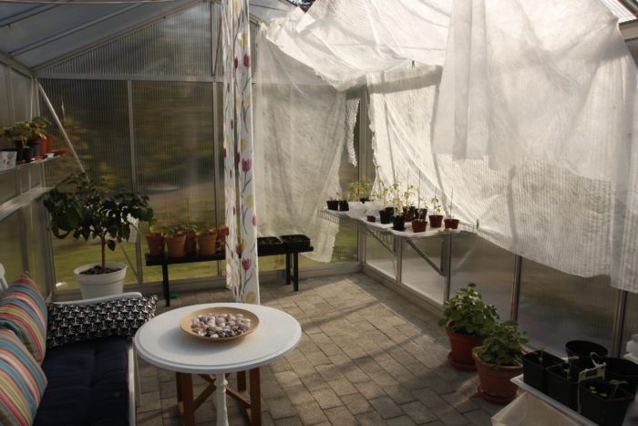 Vi hänger upp fiberduk i växthuset som skydd mot de starka vårsolsstrålarna. Tagetesen tar sig fint!