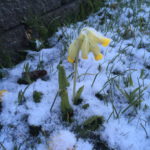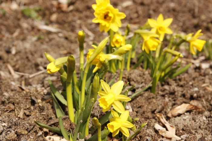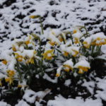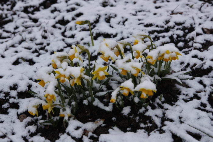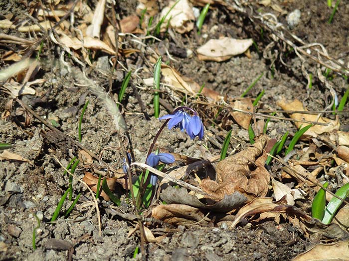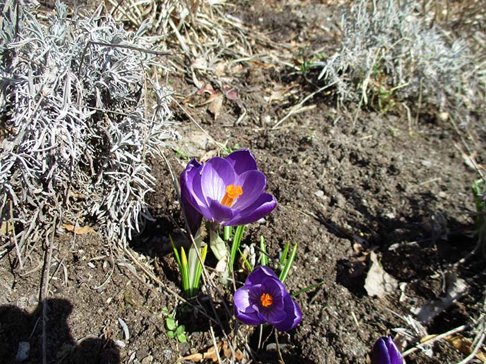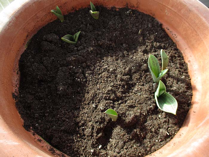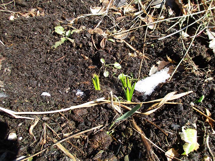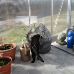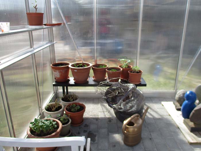 Det tar sig i växthuset, lite tulpaner sticker upp. Även i rabatten anas något grönt. Alla pelargoner har nu fått ny jord och blivit ljust placerade. Vi har sått ett par olika tomatsorter och kapkrusbär, samt planterat om ett par tomat- och gurkplantor som fått flytta ut i verkstaden.