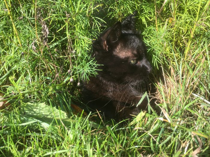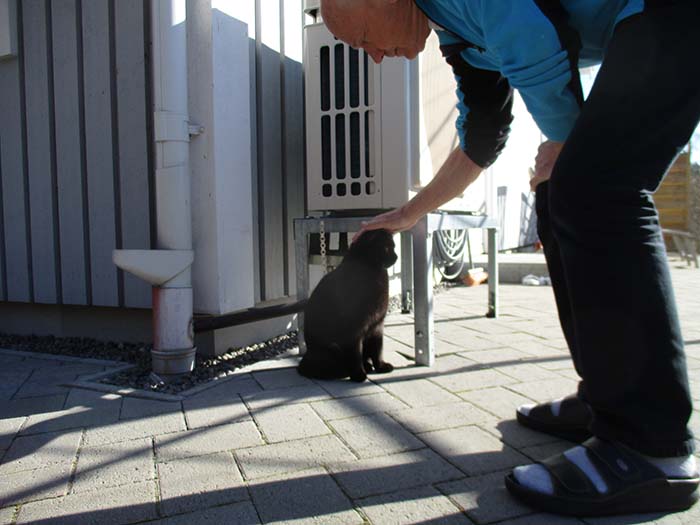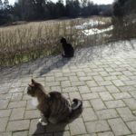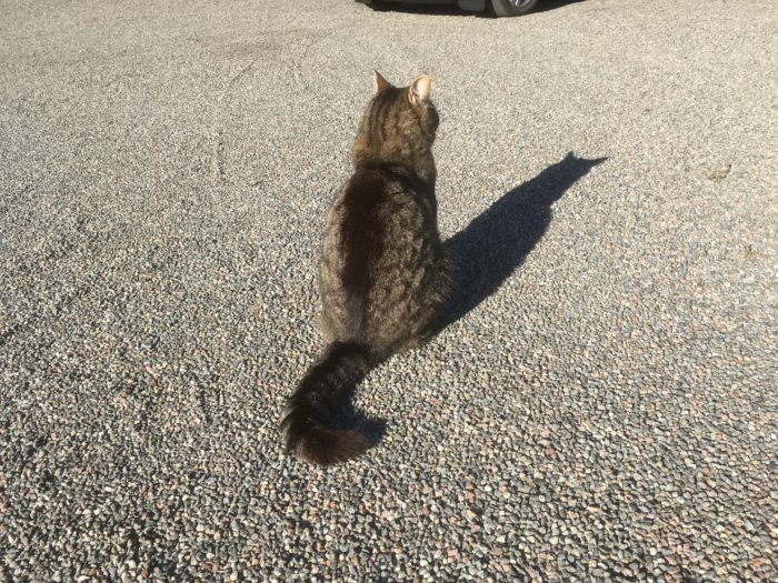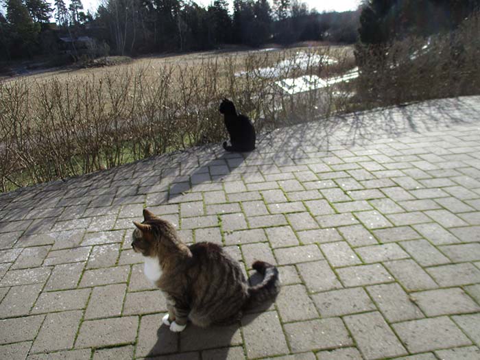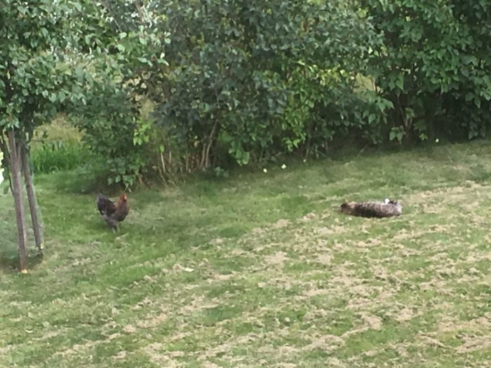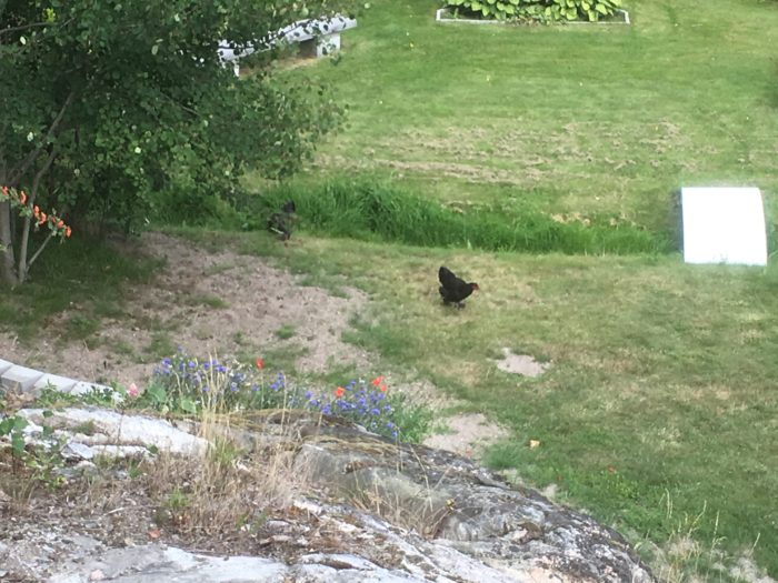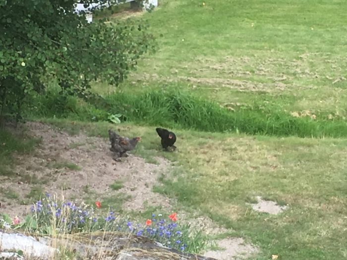Besök i trädgården. Grannarnas lustiga hönor. Matteus är måttligt intresserad, trots att det kacklas ordentligt från ”ledar”-hönset och görs små närmanden mot honom. Moses spanar från sin upphöjda position på terrassen.