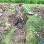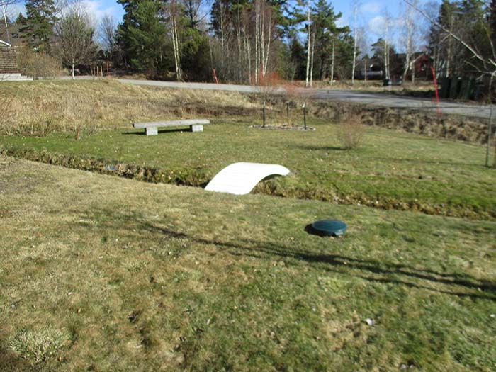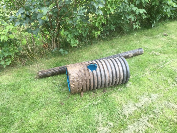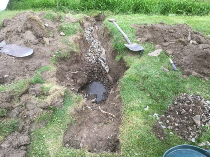 Håkan vill gräva bort en onödig dränering. Katarina tar itu med det, men får lite handräckning efter ett tag. Lite rensning i slänten kan man också roa sig med, trots att det är torrt.