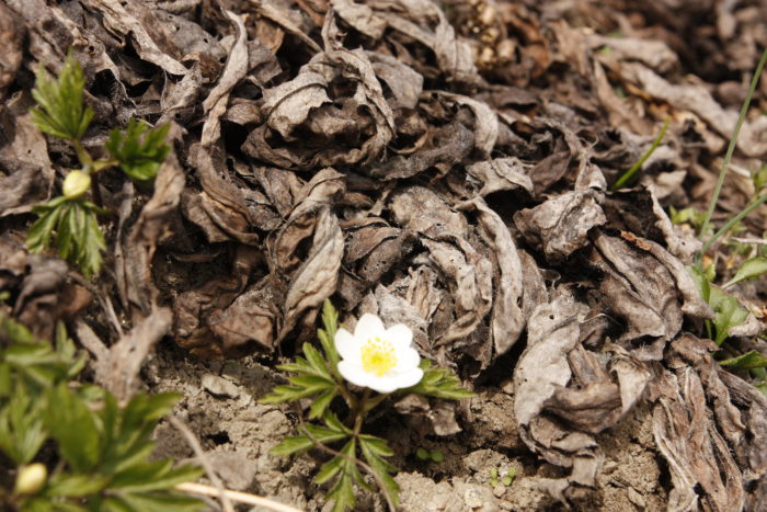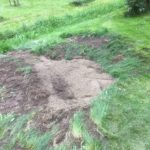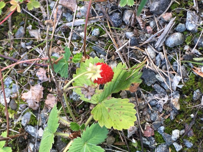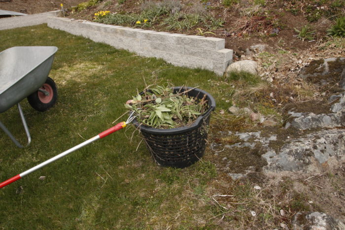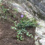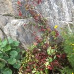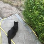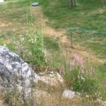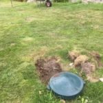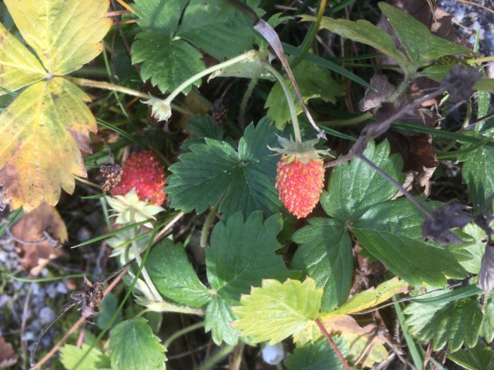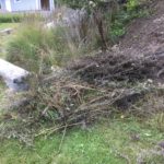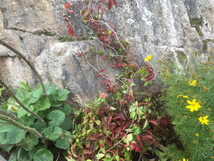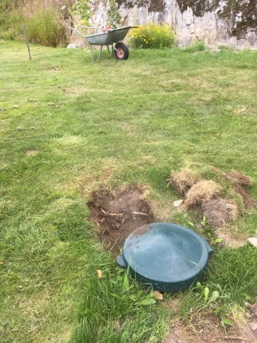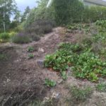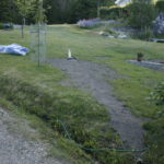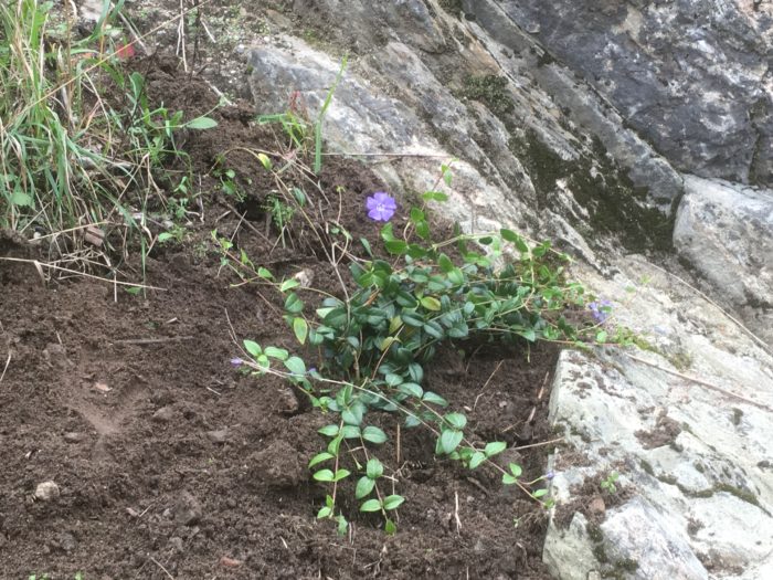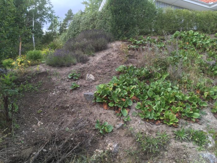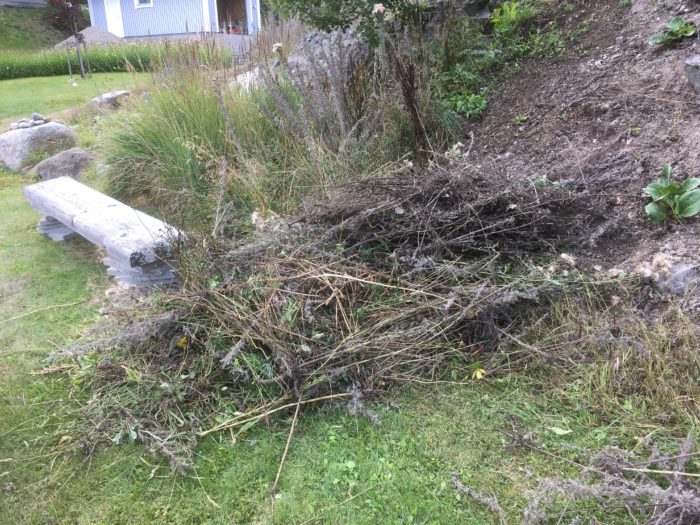 Vi planterar en vinka i kanten på slänten, rensar vinbärsbusksrabatten och lägger på hemmagjord flis. Ett par av våra vildvin grävs upp och flyttas till rabatten vid kanten av berget – kanske kan de växa uppåt längs berget? Vi har fått bort en del av dräneringen, och gräver nu igen hålet. Vi får se om vi tycker det är värt besväret att fortsätta arbetet till våren.