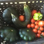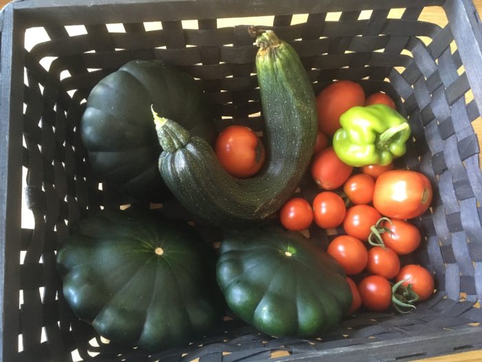 Skörd! Tomater, vanlig squash och musselsquash, som visar sig vara en höjdare!