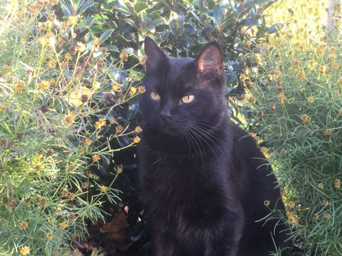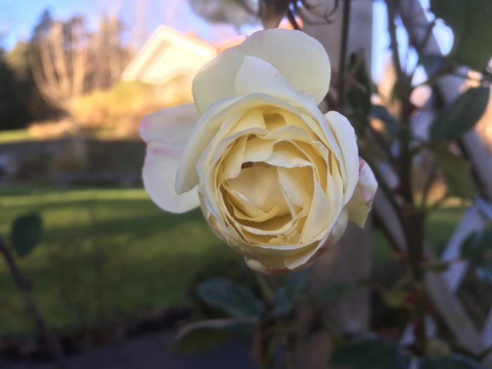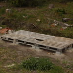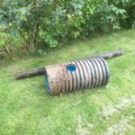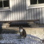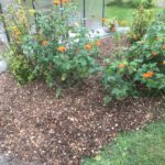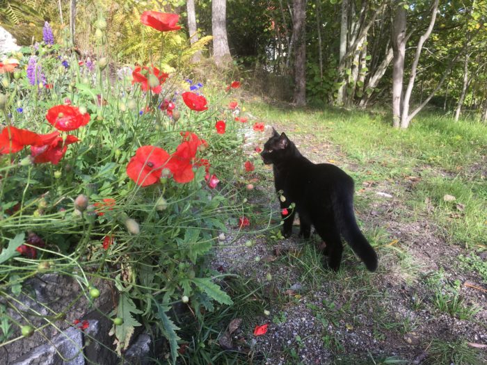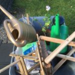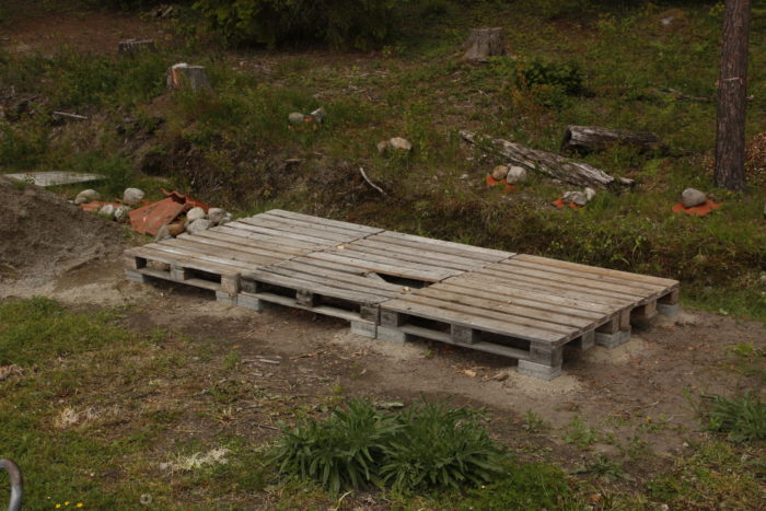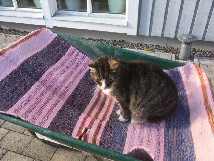 VI har fått hjälp att tillverka ett skydd för infarten till verkstaden, som gått sönder när vi rullat in bilen över ”kanten”. Påfågelsöga har lämnat växthuset för att få plats i rabatten.