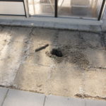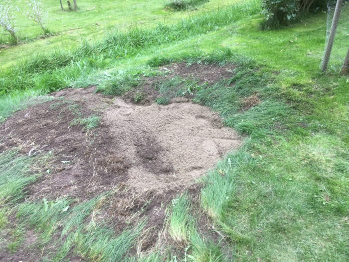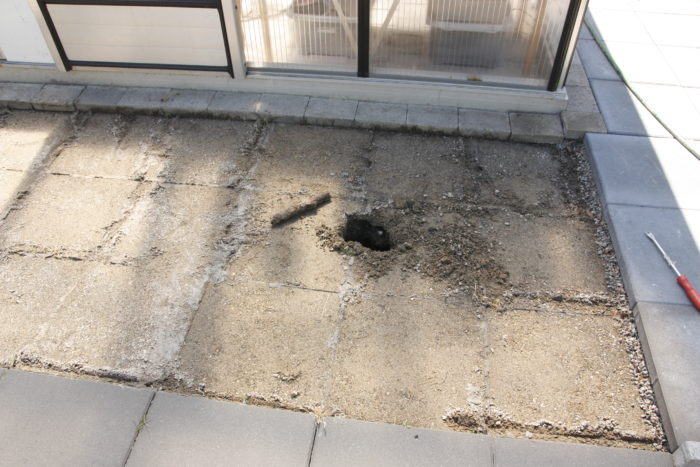 Vi höjer upp plattläggningen vid växthuset lite grand, och råkar på ett ordentligt hål under en av plattorna. En hel del mängd grus krävs för att täppa till det, då hålet verkar sluka hur mycket som helst.