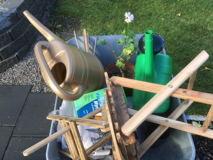 Vi städar ur växthuset och gör lite fint, samt ställer dit ett par av pelargonerna. Trädgårdsbron får flytta ut igen.