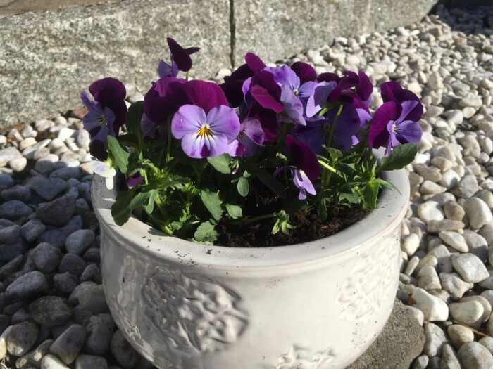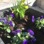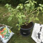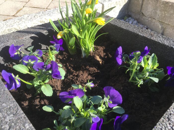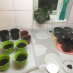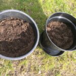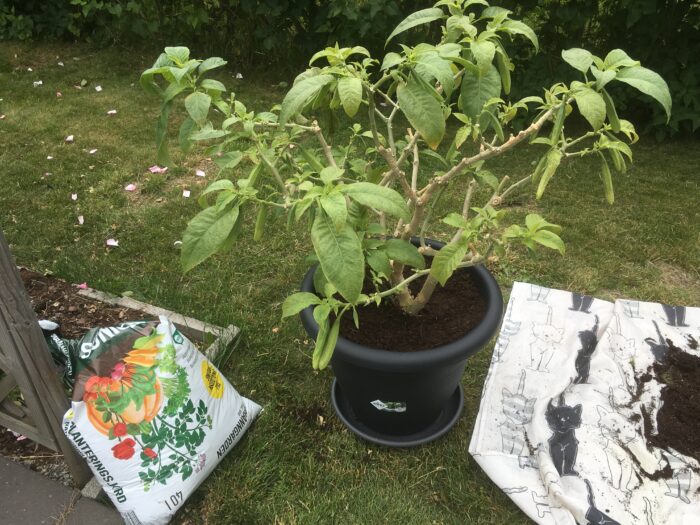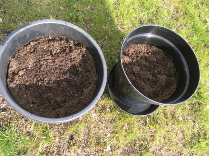På grund av tidsbrist sätter vi några potatisar i krukor. Gräva potatisland får vänta.