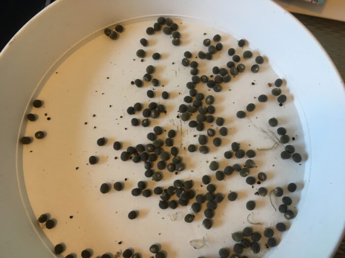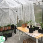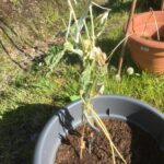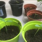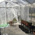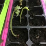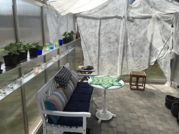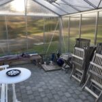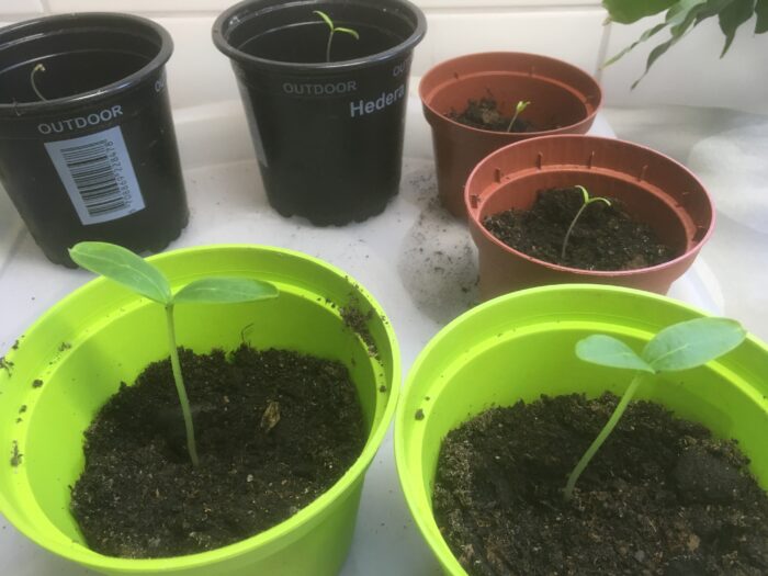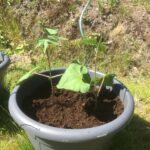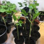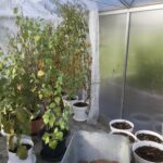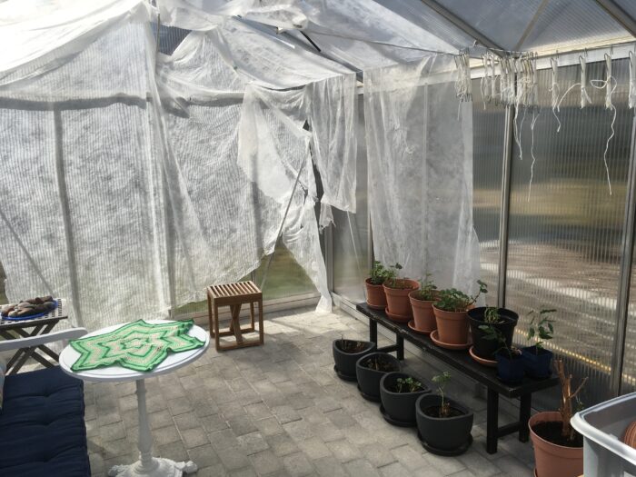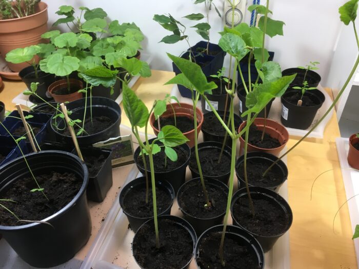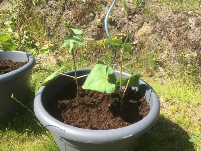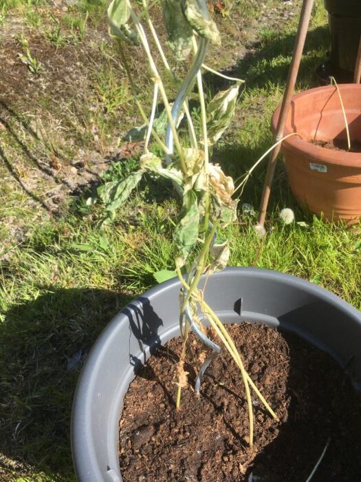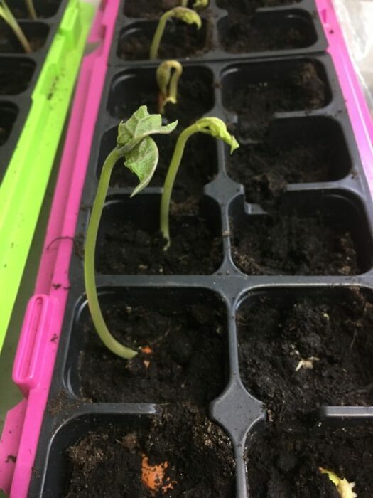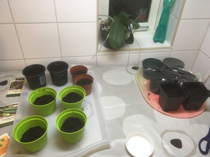 De utplanterade bönorna har blåst sönder… 🙁 Vi sätter nya fröer i skydd i växthuset.