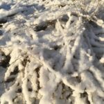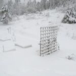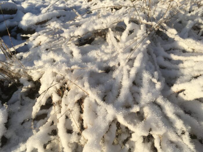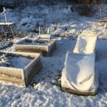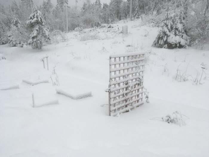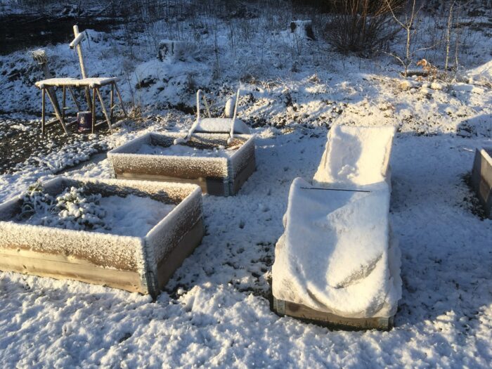 Det kommer lite pudersnö, som snart försvinner igen. Men under det skyddande skalet av fiberduk klarar sig persilja bra, och vi kan skörda hela december.