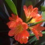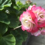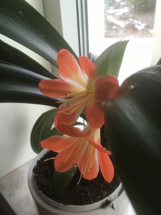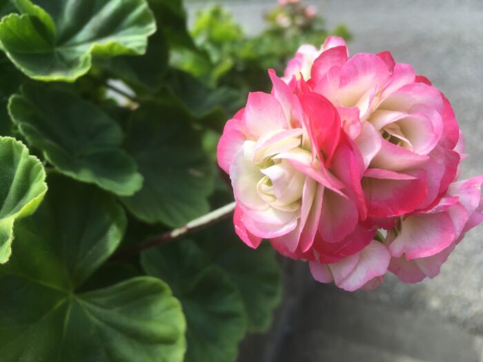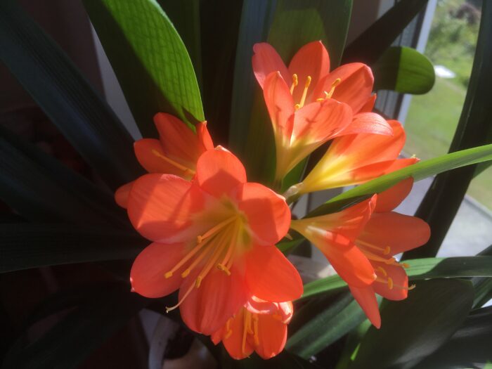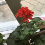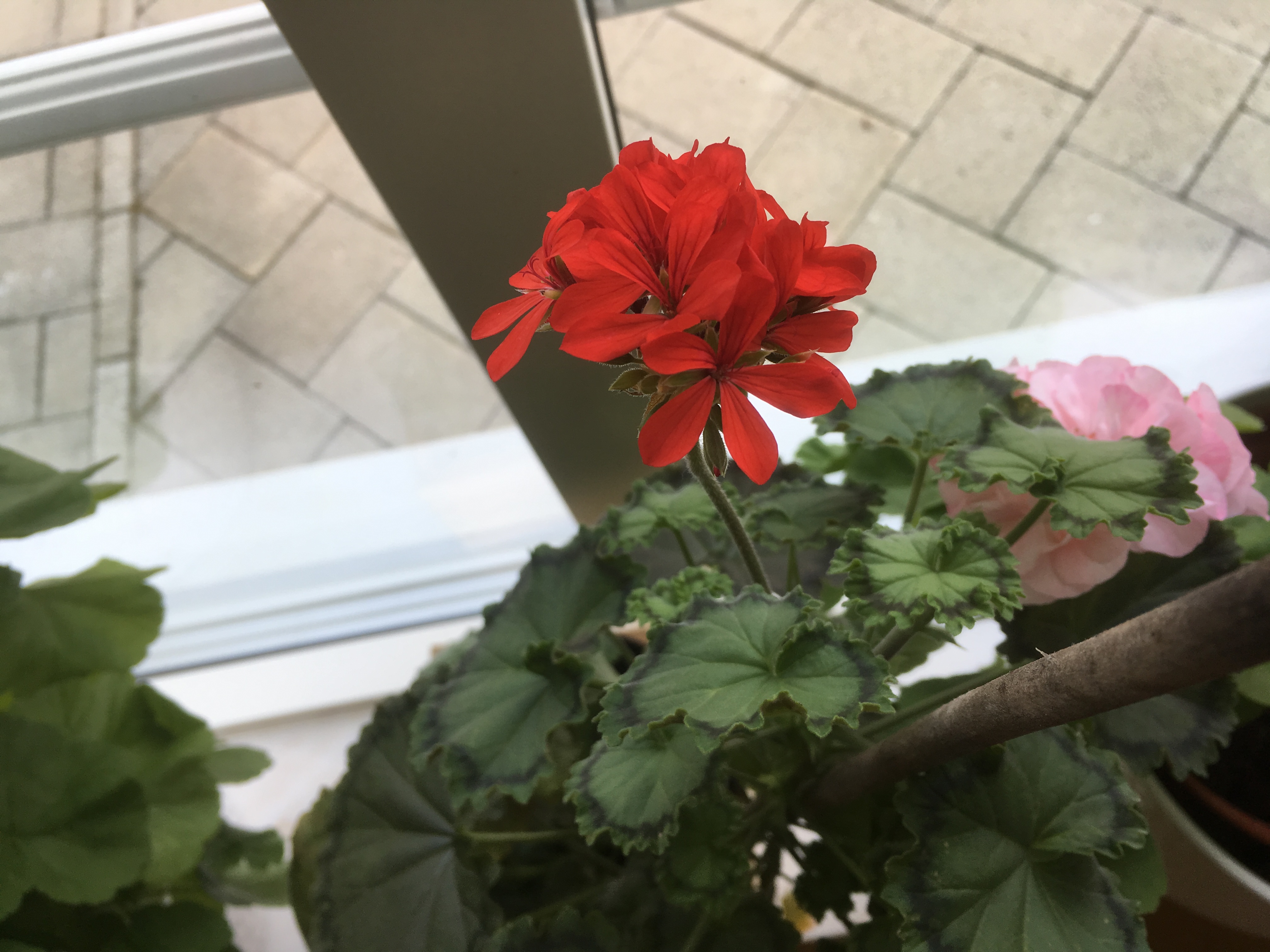 Pelargonskottet som jag fått av pappa blommar nu i en klarröd färg. Änglatrumpet, pelargoner och tomat- och gurkplantor får nu flytta ut i växthuset.