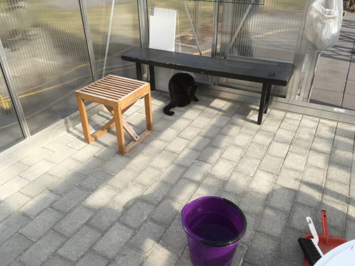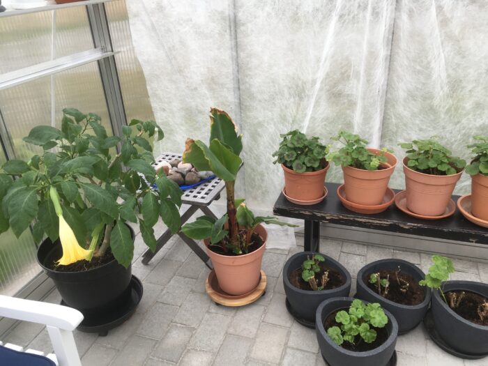 Dags att städa ur växthuset och flytta ut lite pelargoner. Vinbärsbuskarna har fått blad!