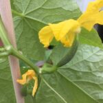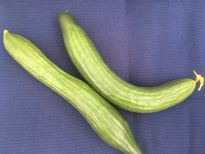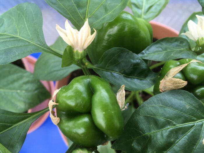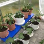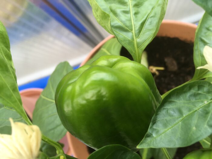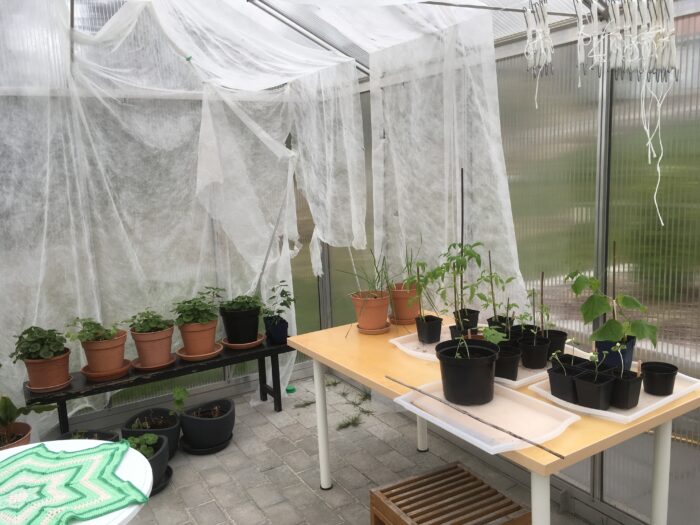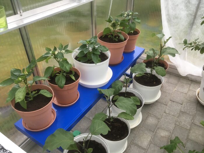 Paprikor och aubergineplantor trivs i växthuset, och vi skördar de första gurkorna!