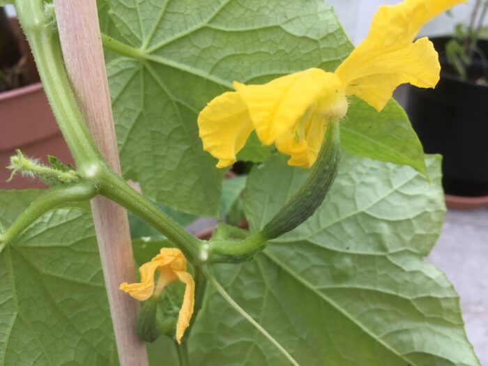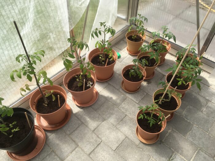 Komposten börjar redan bli full, trots att det är tidigt på säsongen. Nu blommar det fint på flera håll. Små, små gurkor är på gång, och något rangliga tomatplantor har fått större krukor.