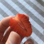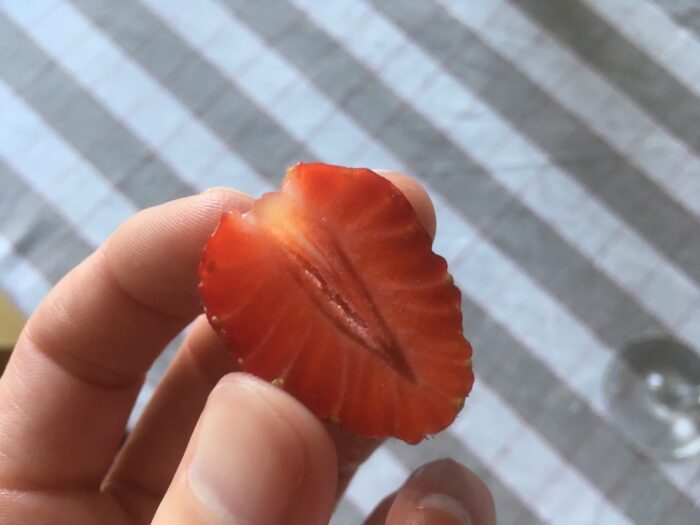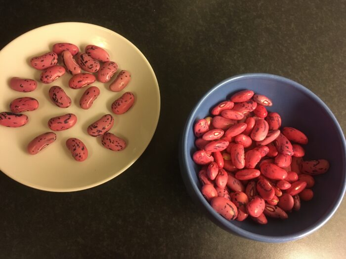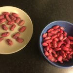 De nysådda bönorna har kommit upp och planteras ut. Nu hoppas vi på mindre blåsigt väder. Vi skördar en hemodlad jordgubbe – så söt och god!