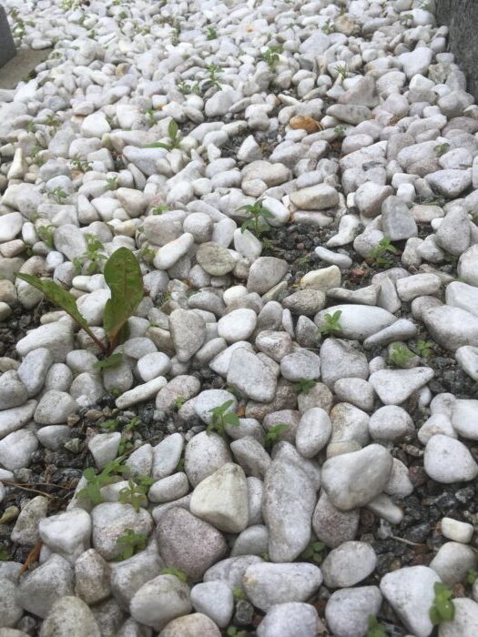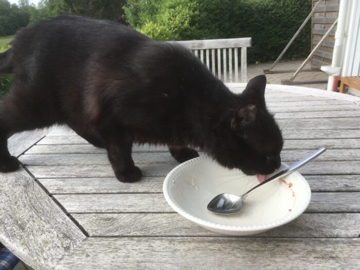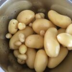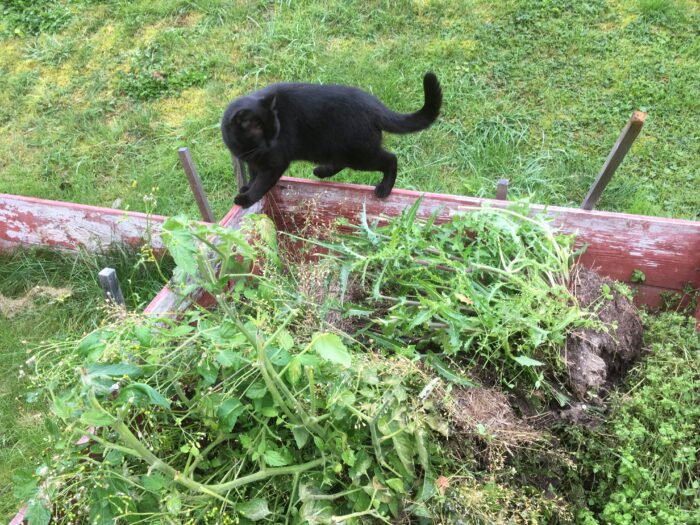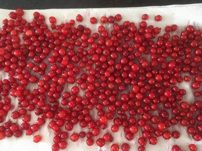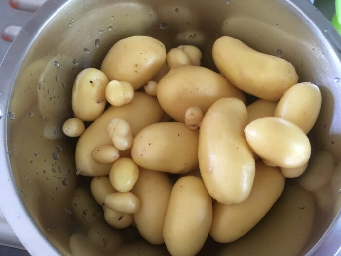 Vi rensar i stenrabbaten som är överväxt med ogräs. Vi skördar potatis av märket ”Maestro” – riktigt god! Och plockar in vinbär för infrysning.