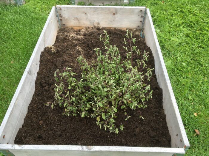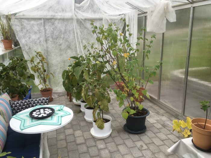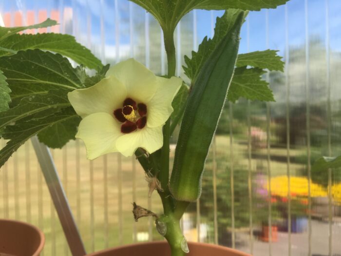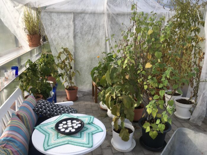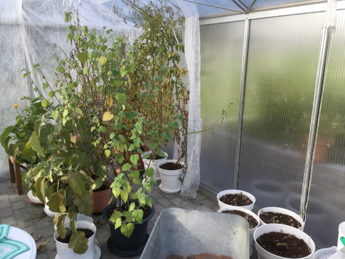 VI tar fröer på okran, samt börjar städa ur växthuset lite grand. En del tomatplantor har gjort sitt och hamnar på komposten. Chokladmyntan får flytta ner i en av pallkragarna inför vintern.