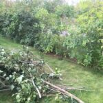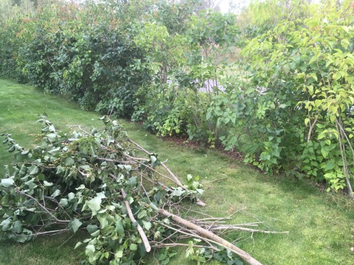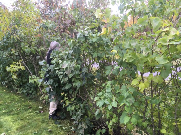 Vi påbörjar arbetet med att klippa ur syrénhäcken lite, så att den ska bli lite tätare.