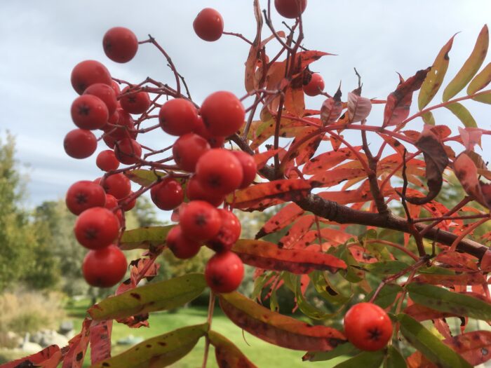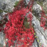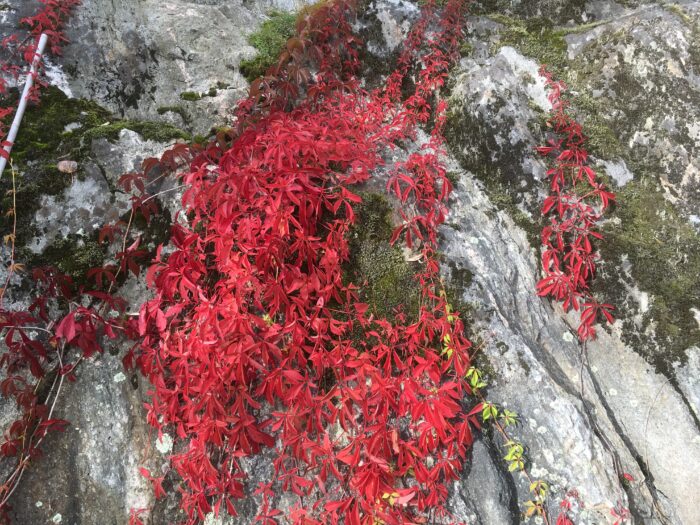 Höstens färgprakt! Vildvinsplantan som växer uppför berget verkar trivas. Tyvärr verkar det också som att vildsvinen varit på besök… 🙁